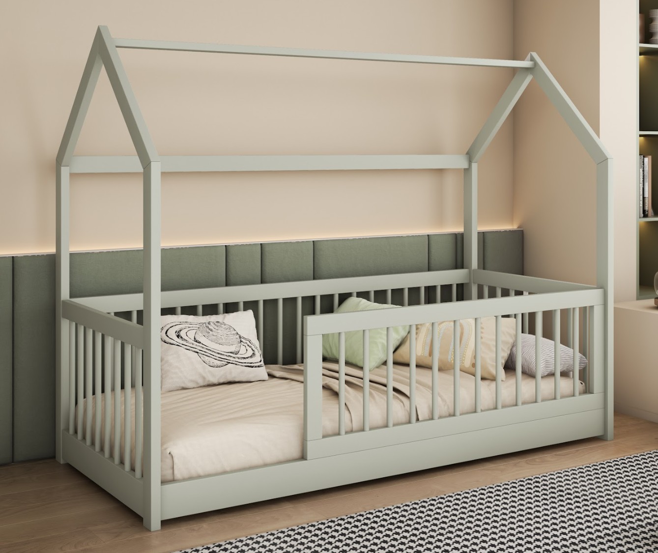 Dětská domečková postel z masivu borovice GRÉTA je skvělou volbou, pokud hledáte kvalitní a robustní postel, která je zároveň krásná a stane se ozdobou dětského pokoje. Postel se vyznačuje svou praktičností a atraktivním designem. Díky nízké konstrukci a volnému vstupu ji řadíme mezi Montessori nábytek. Princip Montessori klade důraz na volnost dítěte, což tato postel nabízí. Dítě má do postele volný přístup a díky tomu, že je postel nízká a chráněná bočnicemi, je také pro dítě bezpečná. Postel je vyrobena z velice kvalitního borovicového dřeva, které je ošetřeno třemi vrstvami ekologického laku. Tím je zajištěna vysoká odolnost postele vůči mechanickému poškození a různým druhům nečistot. Bezpečnost dětí zajišťují vysoké bočnice po obvodu postele a ochranná bariérka, díky čemuž se nemusíte obávat nechtěných pádů během spánku. Bariéra je navíc odnímatelná a je možné ji nainstalovat na pravou i levou stranu postele. Postel je navíc nízká a je proto vhodná i pro nejmenší děti.