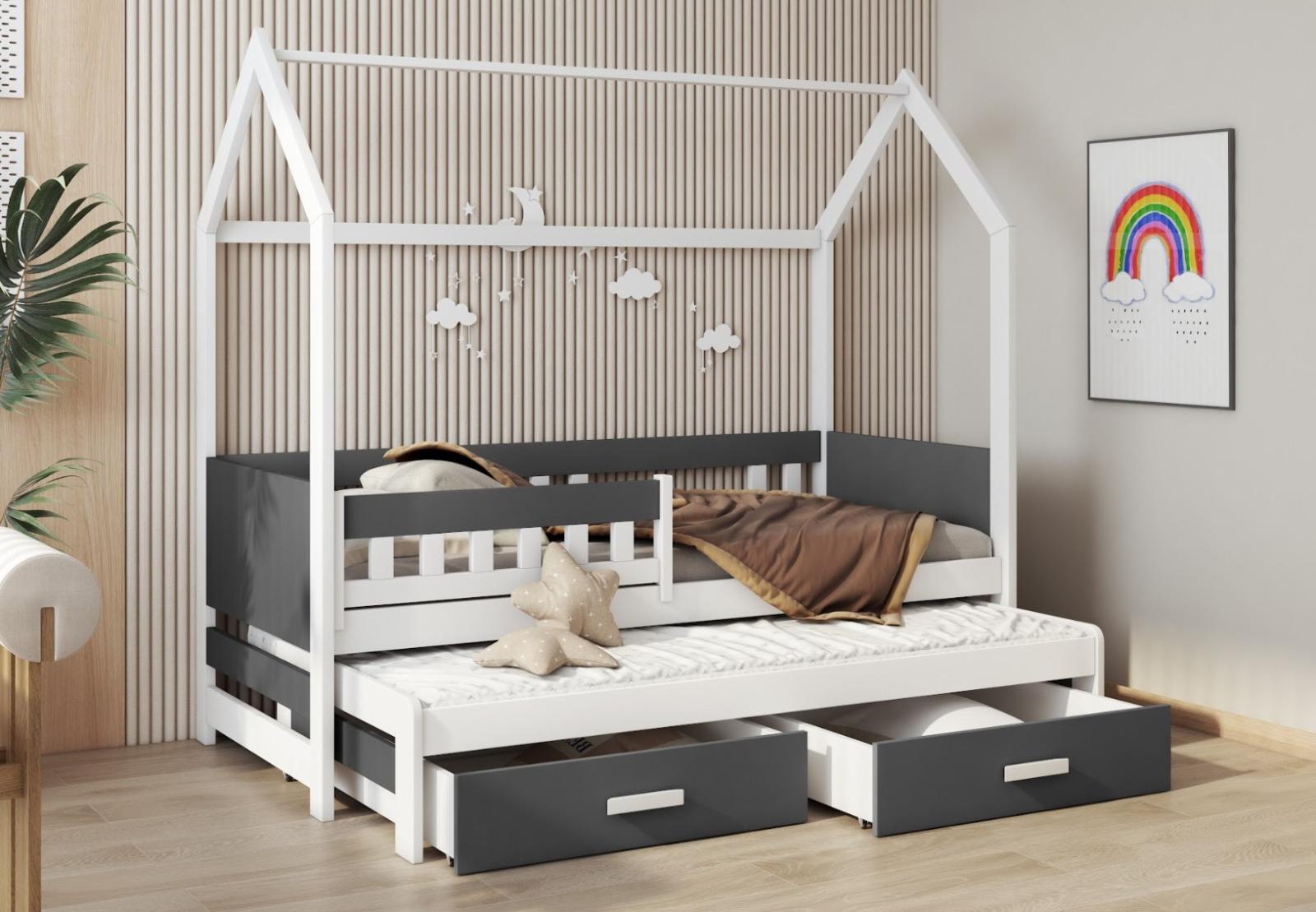 Dětská domečková postel z masivu borovice JASPER se šuplíky a přistýlkou - 180x80 cm - bílá/antracit