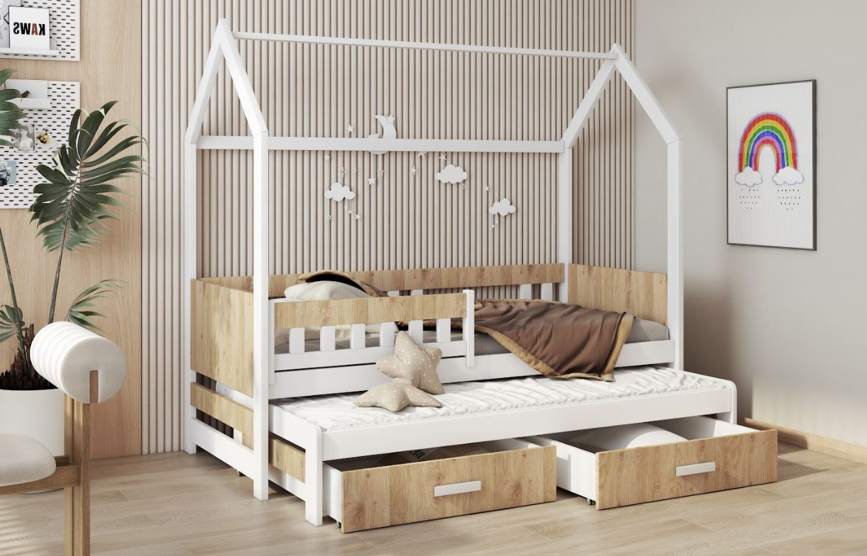 Dětská domečková postel z masivu borovice JASPER se šuplíky a přistýlkou - 180x80 cm - bílá/dub shetland