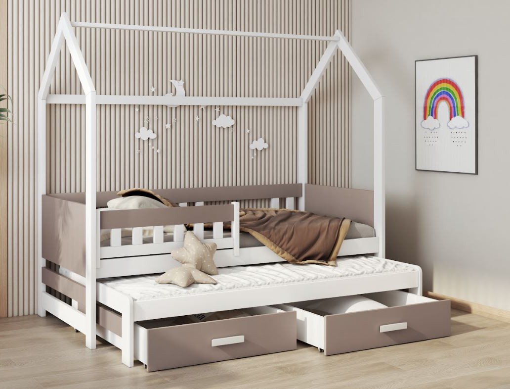 Dětská domečková postel z masivu borovice JASPER se šuplíky a přistýlkou - 180x80 cm - bílá/trufel