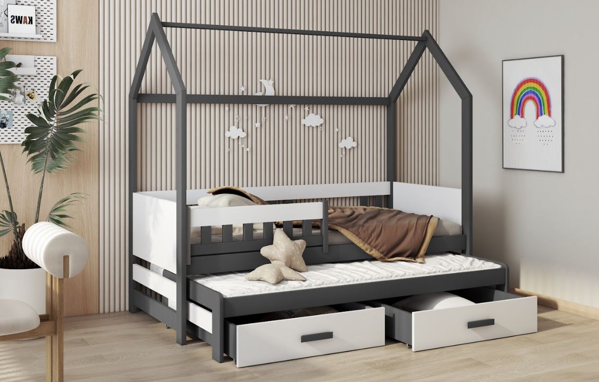 Dětská domečková postel z masivu borovice JASPER se šuplíky a přistýlkou - 180x80 cm - grafit/bílá