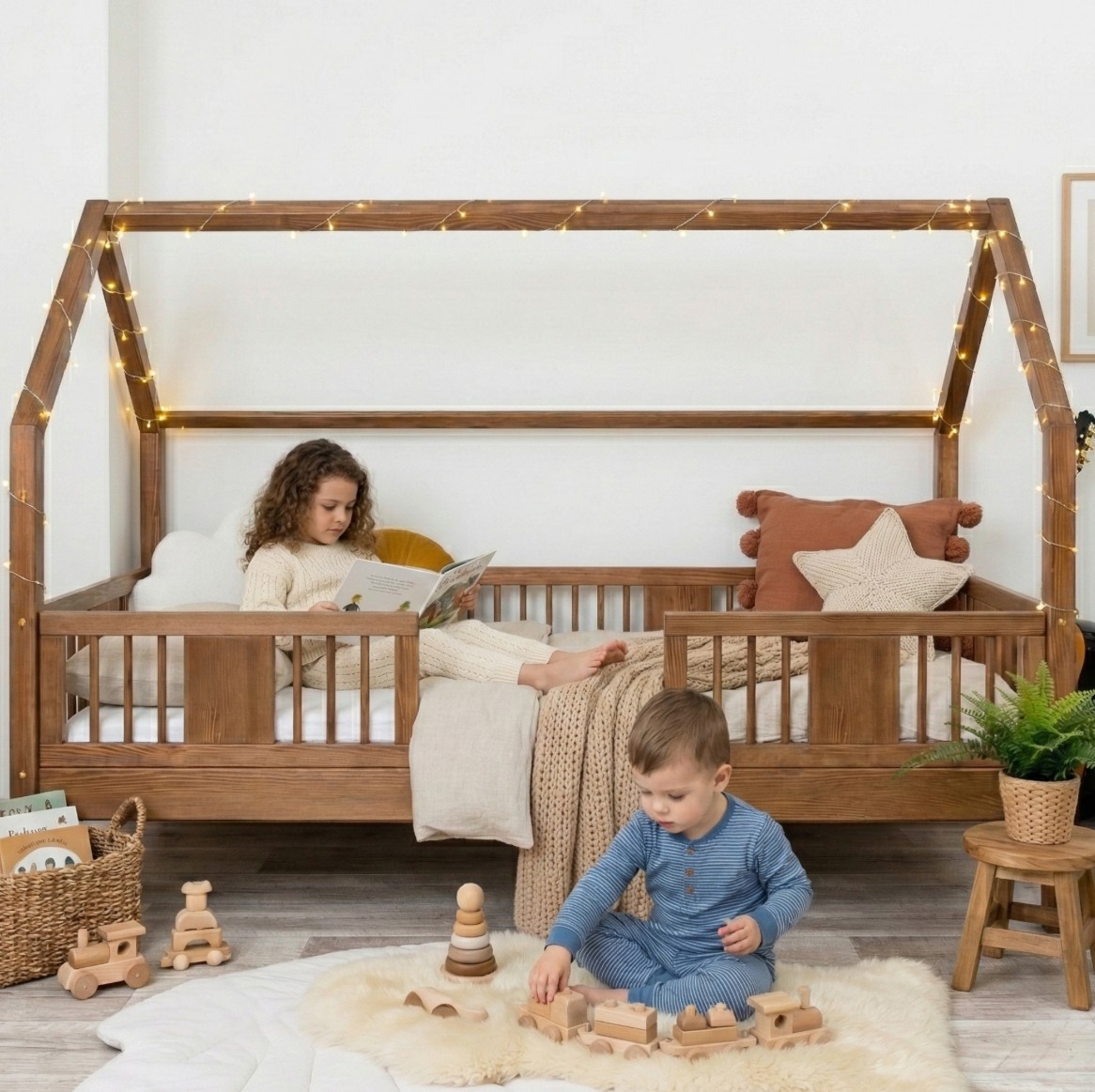 Výška nohou 20 cm otevírá nové designové možnosti. Pod postel můžete umístit jednu velkou zásuvku, dvě menší nebo zásuvku s funkcí spaní – ideální řešení pro sourozence nebo hosty. Je to praktické místo pro uložení ložního prádla, oblečení, dek a oblíbených hraček, které máte vždy na dosah ruky, ale mimo dohled. Díky tomu je LUNA L 20 nejen krásným designovým prvkem, ale také funkčním kusem nábytku, který pomáhá udržovat harmonii a pořádek v dětském prostoru. Celá postel je vyrobena z přírodního borovicového dřeva, které je pevné, odolné a příjemné na dotek. Díky použití ekologických barev na vodní bázi je postel pro děti zcela bezpečná a splňuje evropské normy. Design inspirovaný Montessori podporuje samostatnost a vývoj dítěte a vytváří prostor, kde spánek, hra a učení koexistují v harmonii.