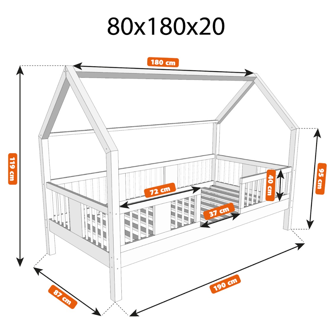 Dětská domečková postel z masivu borovice LUNA L 20 - 180x80 cm