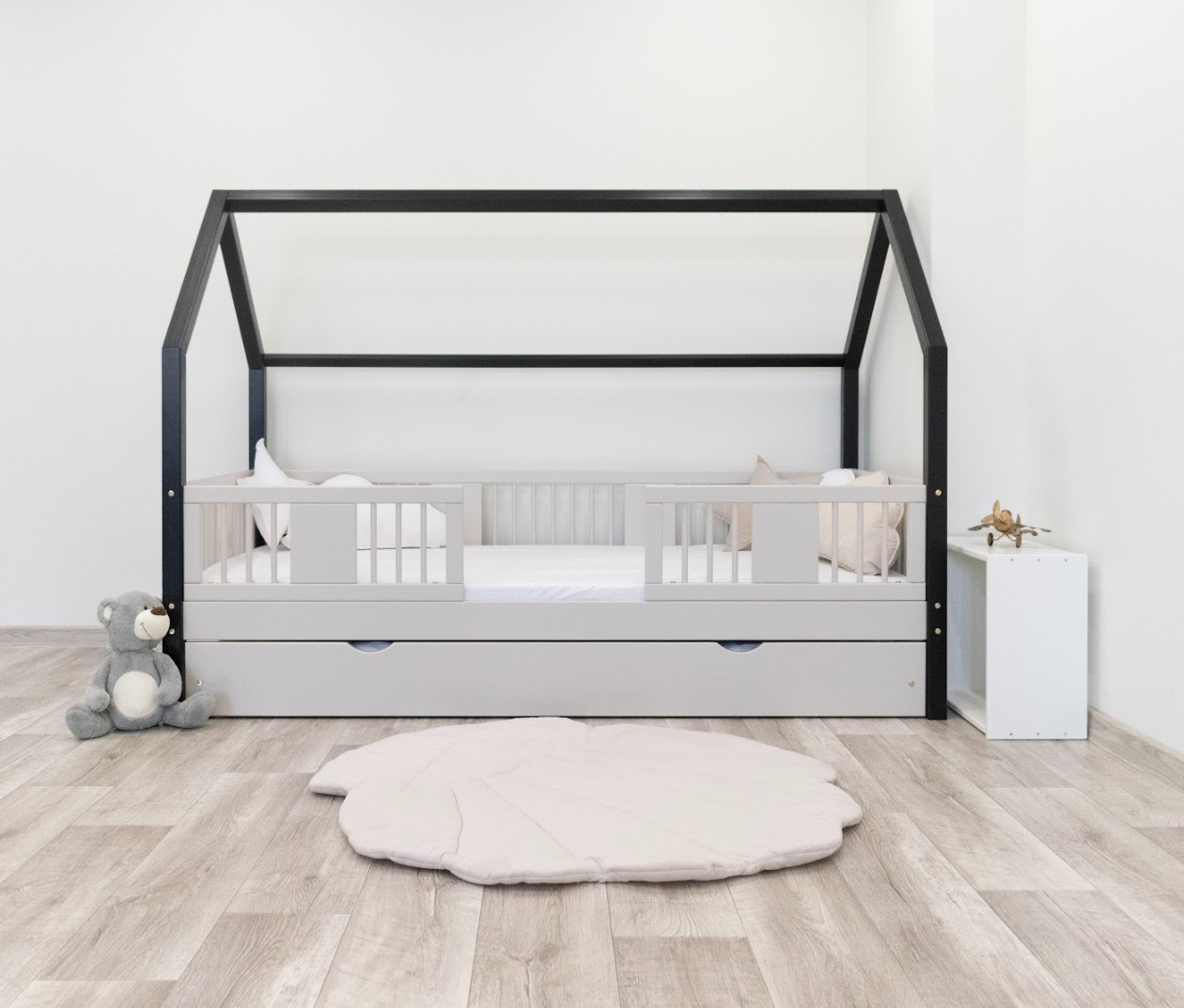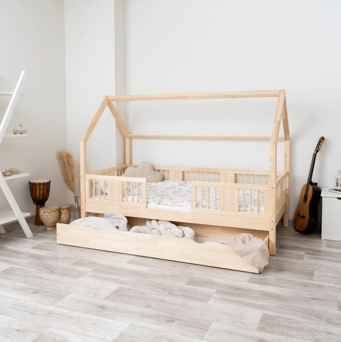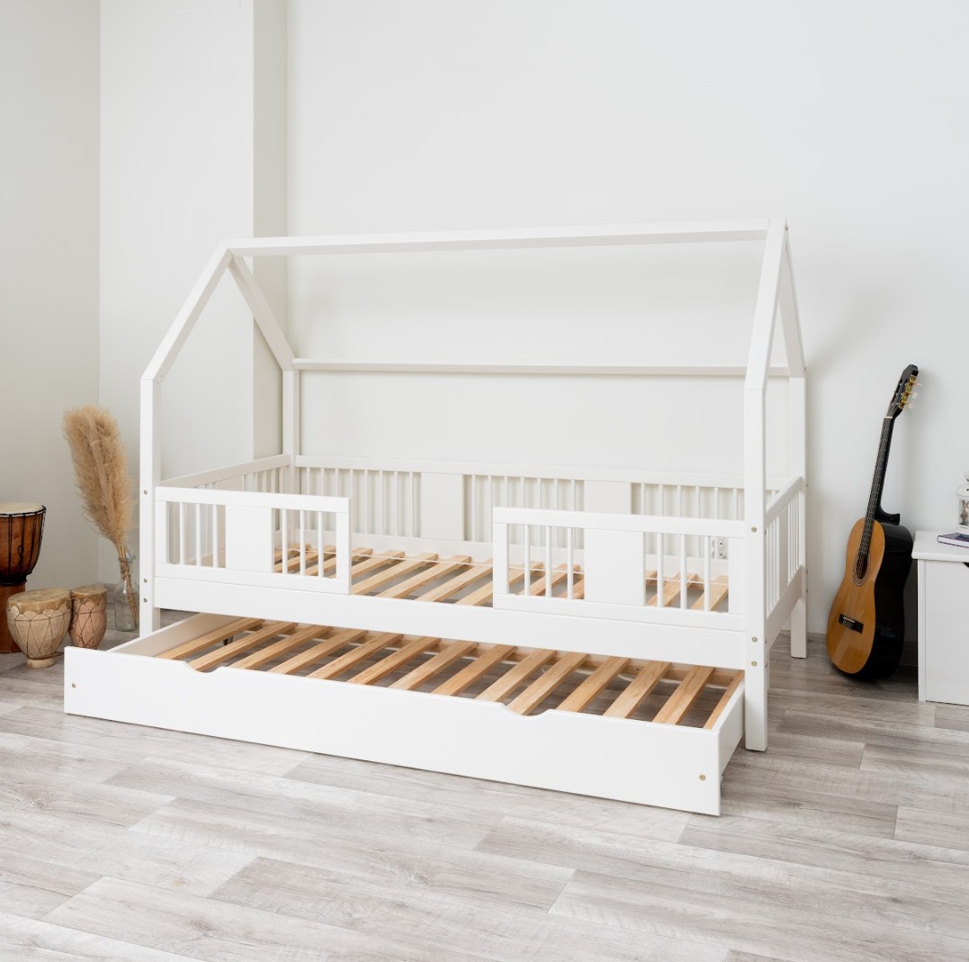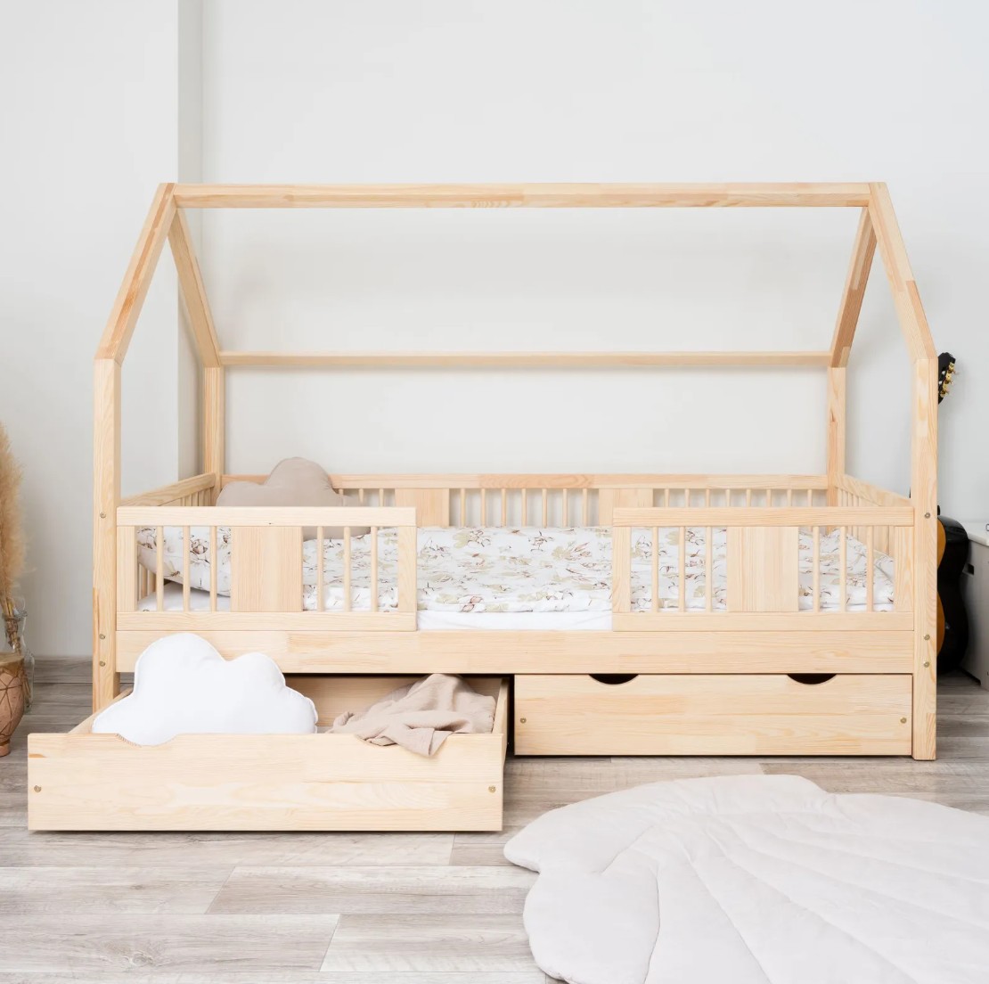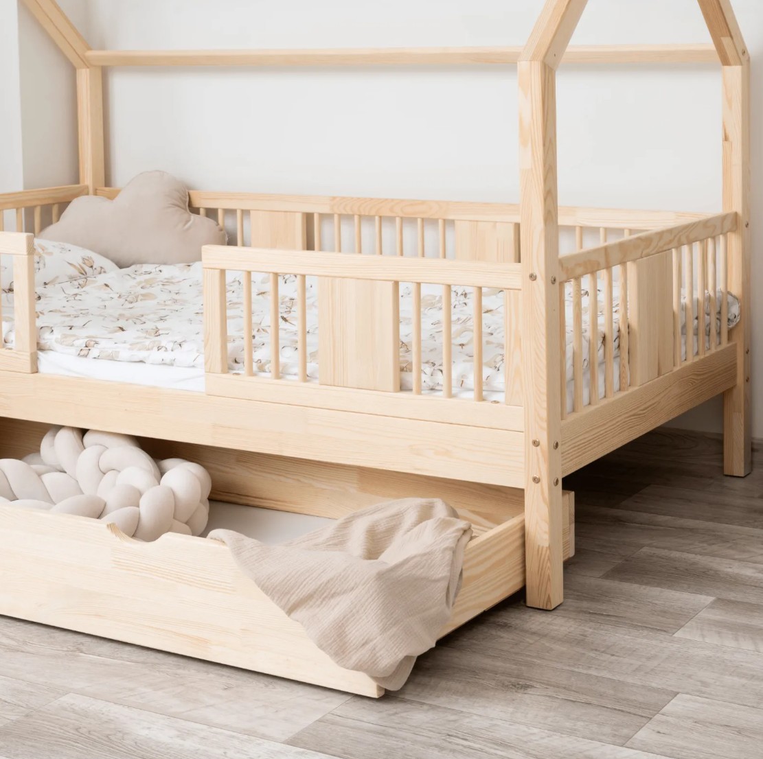 Výška nohou 20 cm otevírá nové designové možnosti. Pod postel můžete umístit jednu velkou zásuvku, dvě menší nebo zásuvku s funkcí spaní – ideální řešení pro sourozence nebo hosty. Je to praktické místo pro uložení ložního prádla, oblečení, dek a oblíbených hraček, které máte vždy na dosah ruky, ale mimo dohled. Díky tomu je LUNA L 20 nejen krásným designovým prvkem, ale také funkčním kusem nábytku, který pomáhá udržovat harmonii a pořádek v dětském prostoru. Celá postel je vyrobena z přírodního borovicového dřeva, které je pevné, odolné a příjemné na dotek. Díky použití ekologických barev na vodní bázi je postel pro děti zcela bezpečná a splňuje evropské normy. Design inspirovaný Montessori podporuje samostatnost a vývoj dítěte a vytváří prostor, kde spánek, hra a učení koexistují v harmonii.