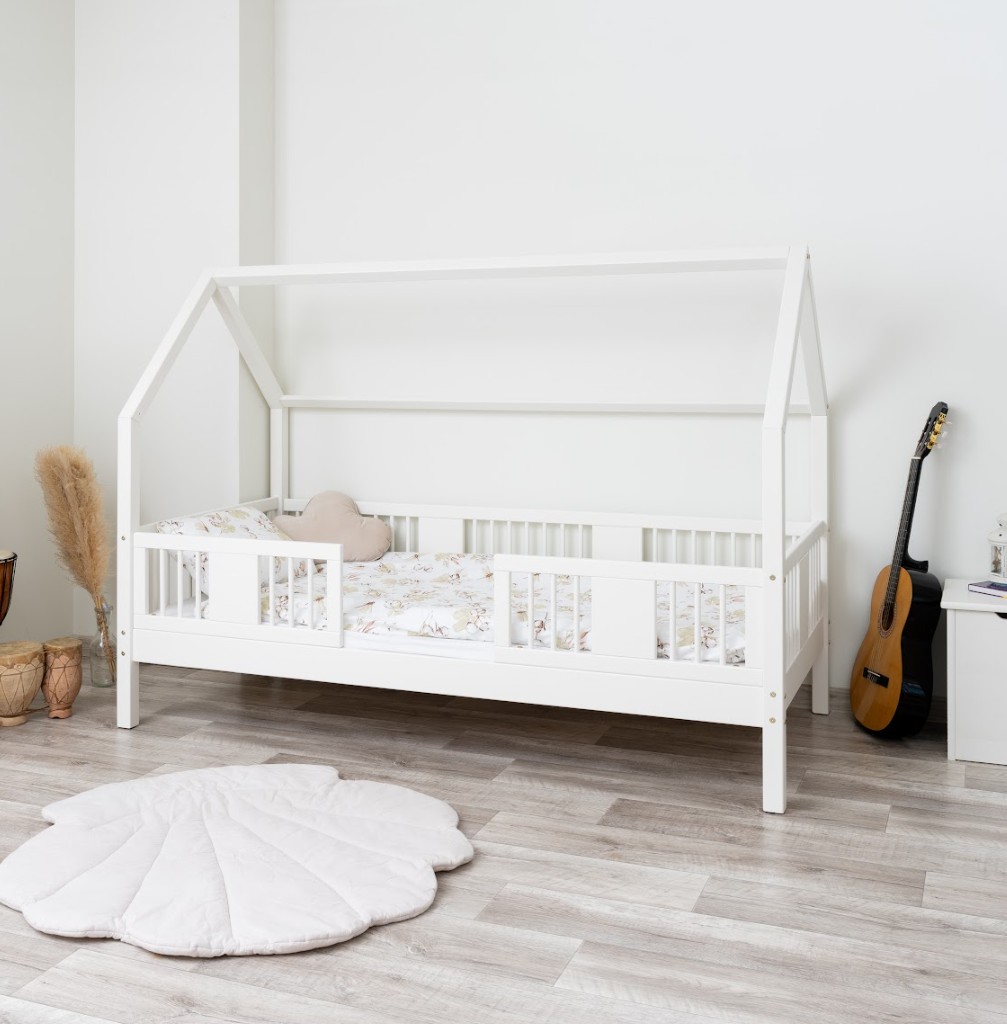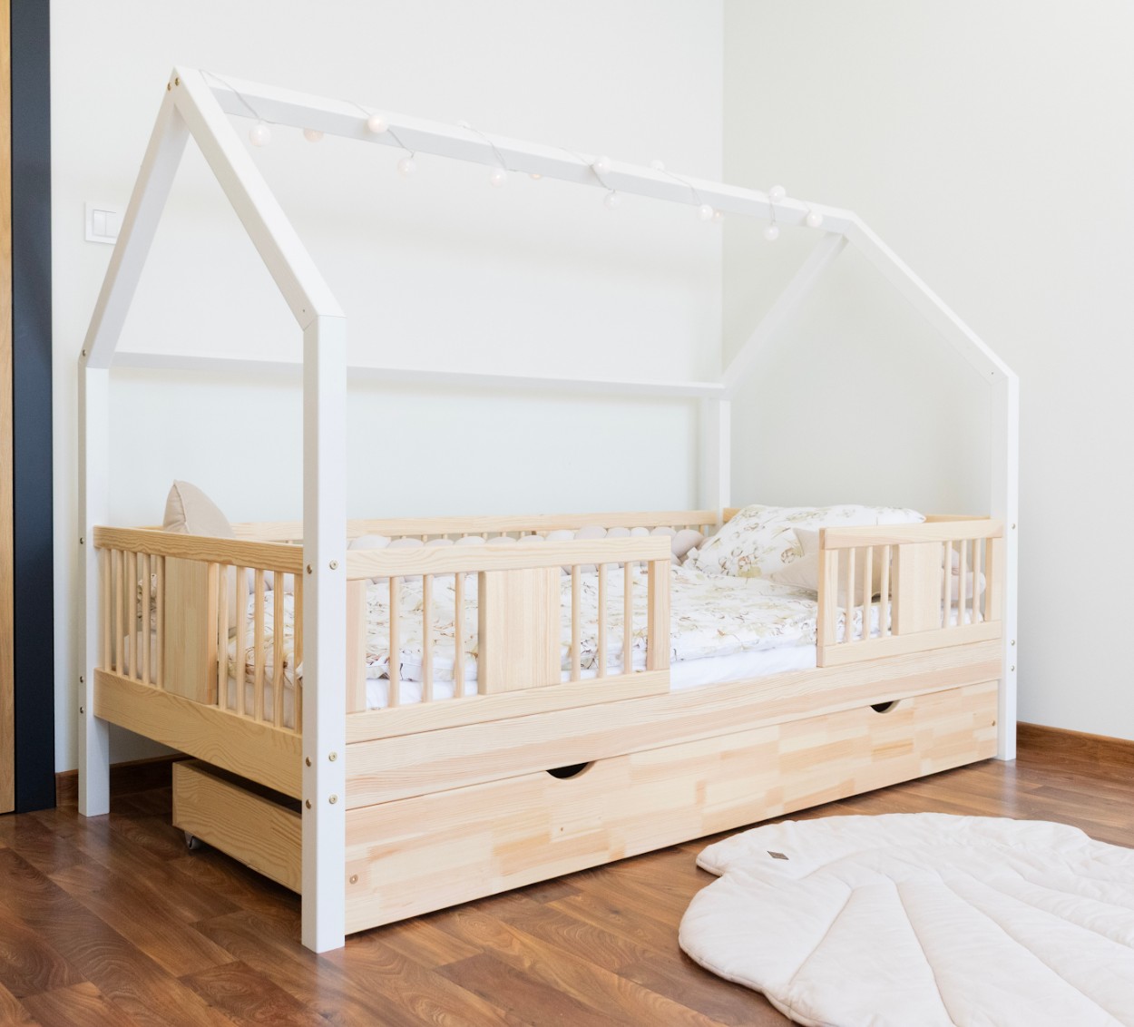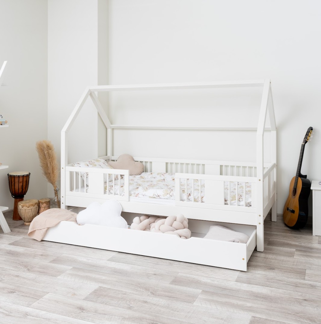 Výška nohou 20 cm otevírá nové designové možnosti. Pod postel můžete umístit jednu velkou zásuvku, dvě menší nebo zásuvku s funkcí spaní – ideální řešení pro sourozence nebo hosty. Je to praktické místo pro uložení ložního prádla, oblečení, dek a oblíbených hraček, které máte vždy na dosah ruky, ale mimo dohled. Díky tomu je LUNA L 20 nejen krásným designovým prvkem, ale také funkčním kusem nábytku, který pomáhá udržovat harmonii a pořádek v dětském prostoru. Celá postel je vyrobena z přírodního borovicového dřeva, které je pevné, odolné a příjemné na dotek. Díky použití ekologických barev na vodní bázi je postel pro děti zcela bezpečná a splňuje evropské normy. Design inspirovaný Montessori podporuje samostatnost a vývoj dítěte a vytváří prostor, kde spánek, hra a učení koexistují v harmonii.