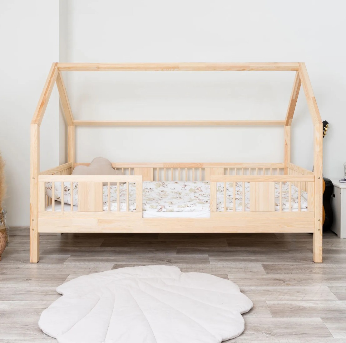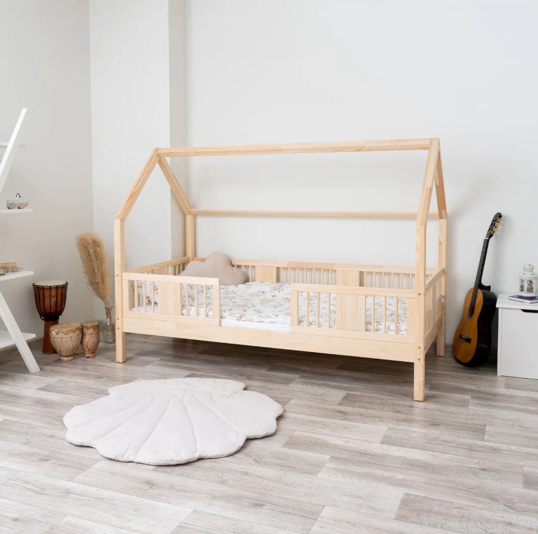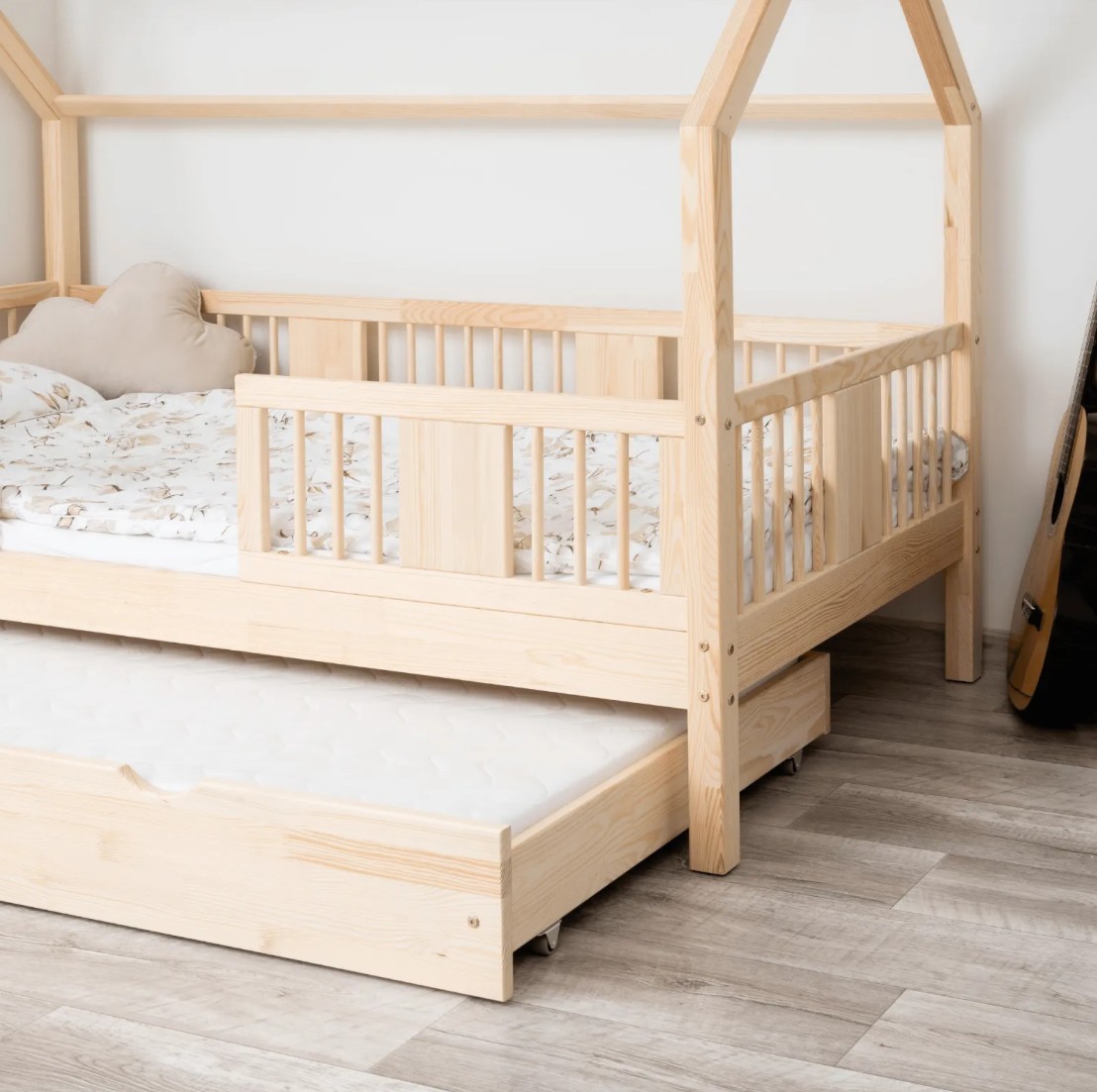 Výška nohou 20 cm otevírá nové designové možnosti. Pod postel můžete umístit jednu velkou zásuvku, dvě menší nebo zásuvku s funkcí spaní – ideální řešení pro sourozence nebo hosty. Je to praktické místo pro uložení ložního prádla, oblečení, dek a oblíbených hraček, které máte vždy na dosah ruky, ale mimo dohled. Díky tomu je LUNA L 20 nejen krásným designovým prvkem, ale také funkčním kusem nábytku, který pomáhá udržovat harmonii a pořádek v dětském prostoru. Celá postel je vyrobena z přírodního borovicového dřeva, které je pevné, odolné a příjemné na dotek. Díky použití ekologických barev na vodní bázi je postel pro děti zcela bezpečná a splňuje evropské normy. Design inspirovaný Montessori podporuje samostatnost a vývoj dítěte a vytváří prostor, kde spánek, hra a učení koexistují v harmonii.