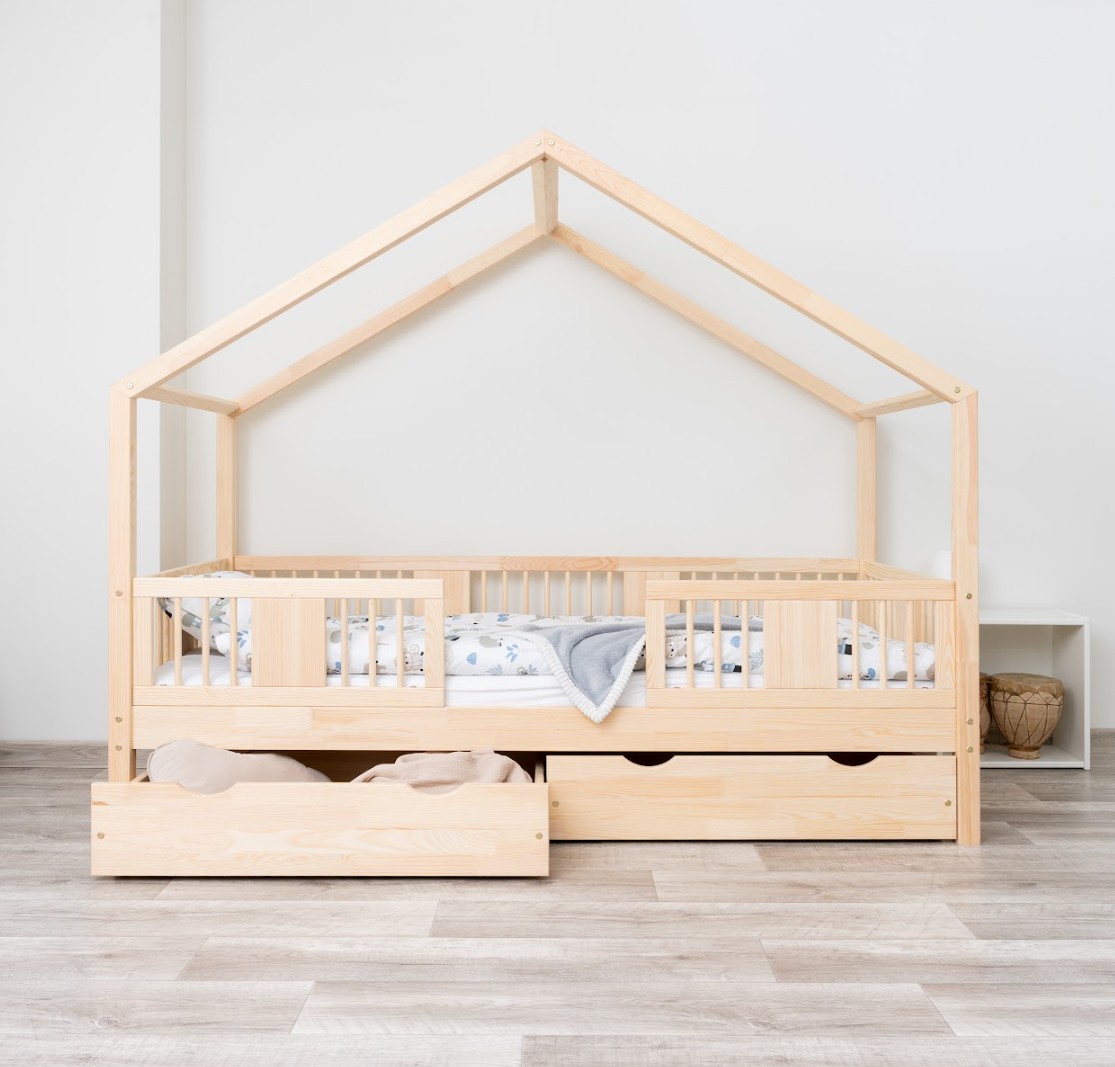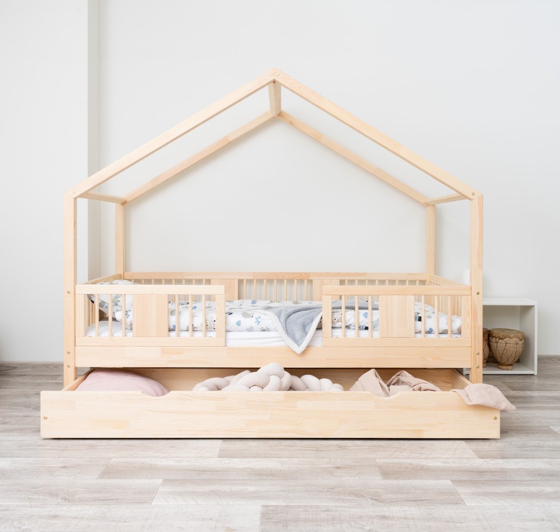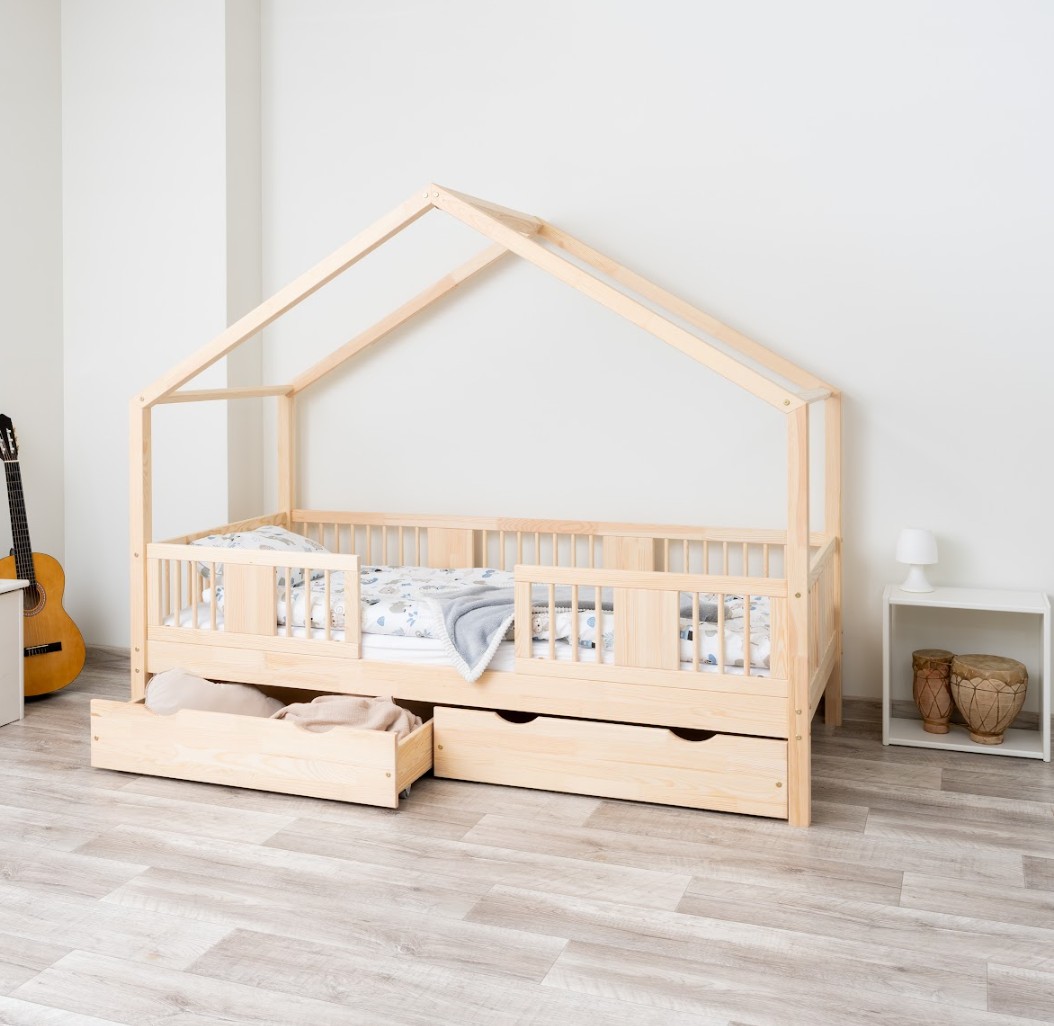 LUNA S 20 je víc než jen postel – je to malý, kouzelný prostor, kde vaše dítě spí, odpočívá a vytváří si vlastní příběhy. Díky o 20 cm vyššímu rámu získává postel nový rozměr funkčnosti: pod ni můžete umístit praktickou zásuvku na ložní prádlo, hračky nebo další výsuvnou postel – ideální pro sourozence nebo malé hosty na noc. Okamžik, kdy dítě vyroste z postýlky, je pro celou rodinu významným okamžikem. Pokud hledáte nábytek, který vašemu dítěti poskytne pocit bezpečí a vám dá jistotu investice do kvality, která vydrží roky, postel LUNA S s nohami o výšce 20 cm je vhodnou volbou. Skandinávský design postele se vyznačuje výraznými zaoblenými příčkami. Nejde jen o estetiku – zaoblené tvary jsou pro malé ručičky příjemnější na dotek a minimalizují riziko bolestivých nárazů při hraní. Přírodní borovicové dřevo vytváří v místnosti uklidňující mikroklima. Model LUNA používá vybrané, vrstveně lepené borovicové dřevo o síle 2,2 cm, které eliminuje namáhání a snižuje riziko praskání nebo deformace. To zaručuje stabilitu a tichý provoz i po letech používání. Povrchová úprava je provedena ekologickými barvami na vodní bázi, které splňují evropskou normu EN 71-3 – bez zápachu, toxinů a škodlivých látek. Díky tomu je postel LUNA S 20 ideální do pokojů alergiků nebo kojenců. Postel nabízíme také ve verzi bez povrchových úprav - nelakované dřevo. Díky tomu ji lze snadno přizpůsobit - její vzhled můžete upravit mořením, lakováním nebo malováním dle vlastního uvážení. Design domečku stimuluje kreativitu – přes den se postel promění v hrací prostor a v noci podporuje klid. Stačí přidat měkké bavlněné ložní prádlo a tlumené osvětlení a vytvořit tak útulnou atmosféru pro spaní.