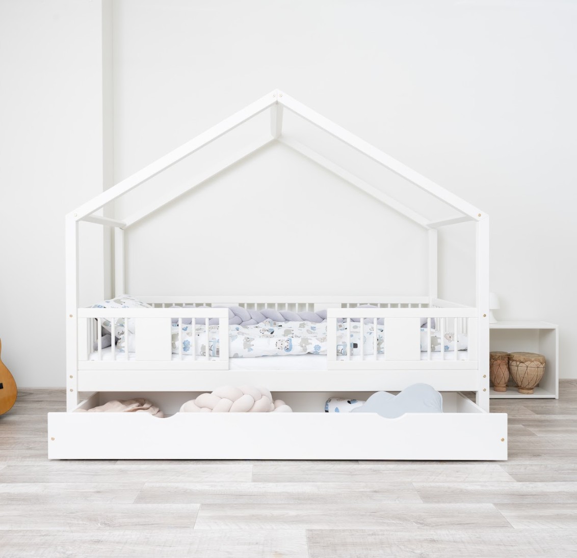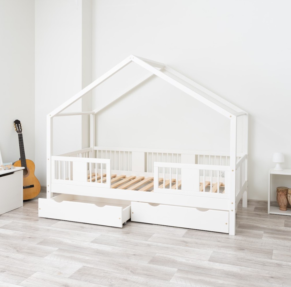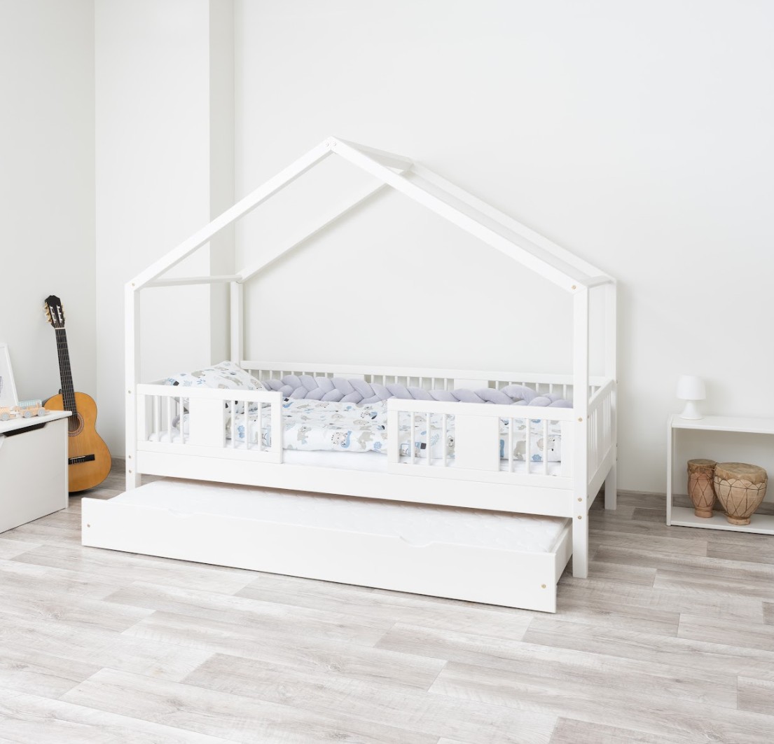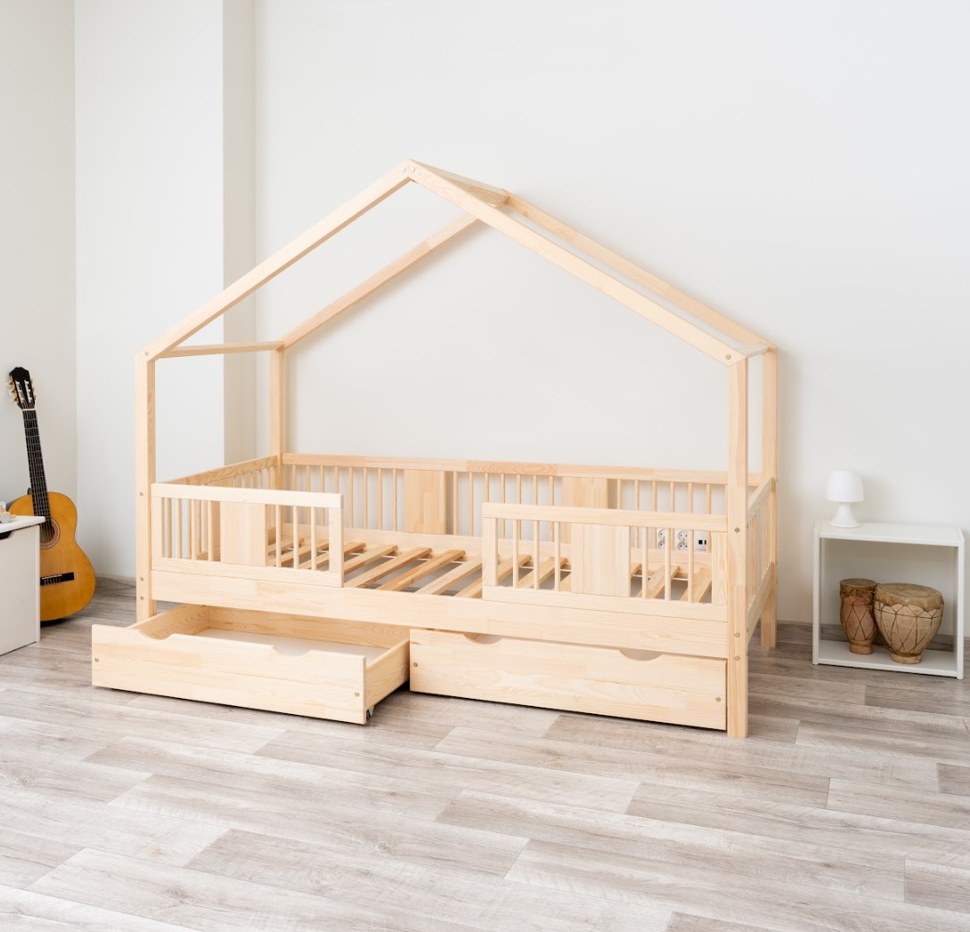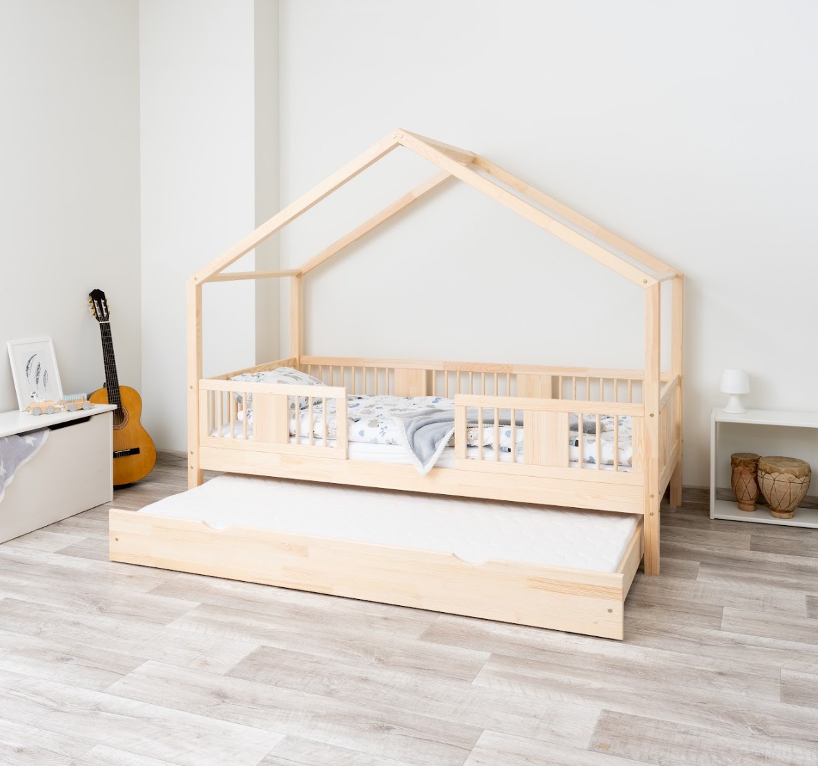 LUNA S 20 je víc než jen postel – je to malý, kouzelný prostor, kde vaše dítě spí, odpočívá a vytváří si vlastní příběhy. Díky o 20 cm vyššímu rámu získává postel nový rozměr funkčnosti: pod ni můžete umístit praktickou zásuvku na ložní prádlo, hračky nebo další výsuvnou postel – ideální pro sourozence nebo malé hosty na noc. Okamžik, kdy dítě vyroste z postýlky, je pro celou rodinu významným okamžikem. Pokud hledáte nábytek, který vašemu dítěti poskytne pocit bezpečí a vám dá jistotu investice do kvality, která vydrží roky, postel LUNA S s nohami o výšce 20 cm je vhodnou volbou. Skandinávský design postele se vyznačuje výraznými zaoblenými příčkami. Nejde jen o estetiku – zaoblené tvary jsou pro malé ručičky příjemnější na dotek a minimalizují riziko bolestivých nárazů při hraní. Přírodní borovicové dřevo vytváří v místnosti uklidňující mikroklima. Model LUNA používá vybrané, vrstveně lepené borovicové dřevo o síle 2,2 cm, které eliminuje namáhání a snižuje riziko praskání nebo deformace. To zaručuje stabilitu a tichý provoz i po letech používání. Povrchová úprava je provedena ekologickými barvami na vodní bázi, které splňují evropskou normu EN 71-3 – bez zápachu, toxinů a škodlivých látek. Díky tomu je postel LUNA S 20 ideální do pokojů alergiků nebo kojenců. Postel nabízíme také ve verzi bez povrchových úprav - nelakované dřevo. Díky tomu ji lze snadno přizpůsobit - její vzhled můžete upravit mořením, lakováním nebo malováním dle vlastního uvážení. Design domečku stimuluje kreativitu – přes den se postel promění v hrací prostor a v noci podporuje klid. Stačí přidat měkké bavlněné ložní prádlo a tlumené osvětlení a vytvořit tak útulnou atmosféru pro spaní.