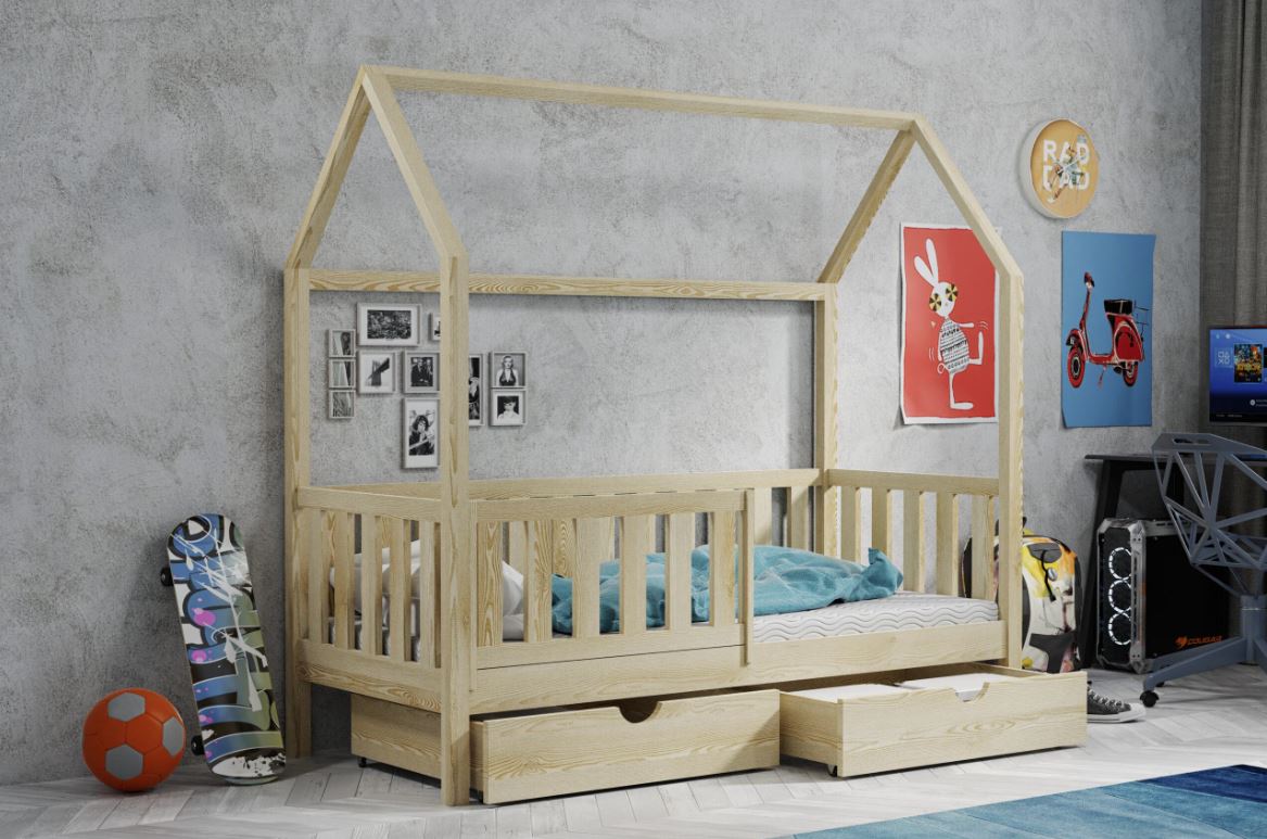 Domečková postel je splněným snem každého dítěte! Tento typ nábytku podněcuje fantazii během dne a umožňuje bezpečný a pohodlný spánek v noci. MAGDA je jednolůžková dětská postel ve tvaru domečku. Jedná se o lehký, odolný a prostorný kus nábytku, který dá pokojíčku vašeho dítěte zcela novou kvalitu. Postel je vyrobena z masivního borovicového dřeva, díky čemuž je mimořádně pevná a odolná proti poškození. U bočnic a čel je šířka použitého materiálu 2,6 cm. Postel je ošetřena lakem na vodní bázi, který je ekologický, šetrný k pokožce a odolný vůči různým druhům poškození. Bezpečnostní zábrana zajistí vašemu dítěti bezpečný spánek po celou noc a zabrání možnosti vypadnutí. Bariérka je odnímatelná a lze ji umístit na pravou i levou stranu postele. Postel je navíc dodávána se dvěma hlubokými zásuvkami, které lze využít jako místo pro lůžkoviny nebo hračky. Součástí postele je také kvalitní pevný rošt. Funkčnost, pohodlí a netradiční vzhled dělají z Magdy zajímavý prvek, který se bude vyjímat v každém dětském pokojíčku.