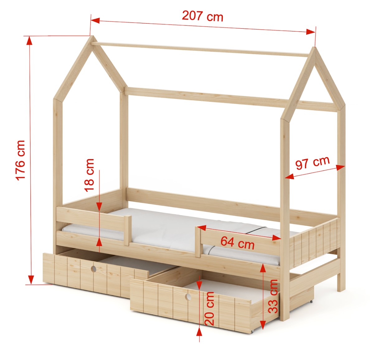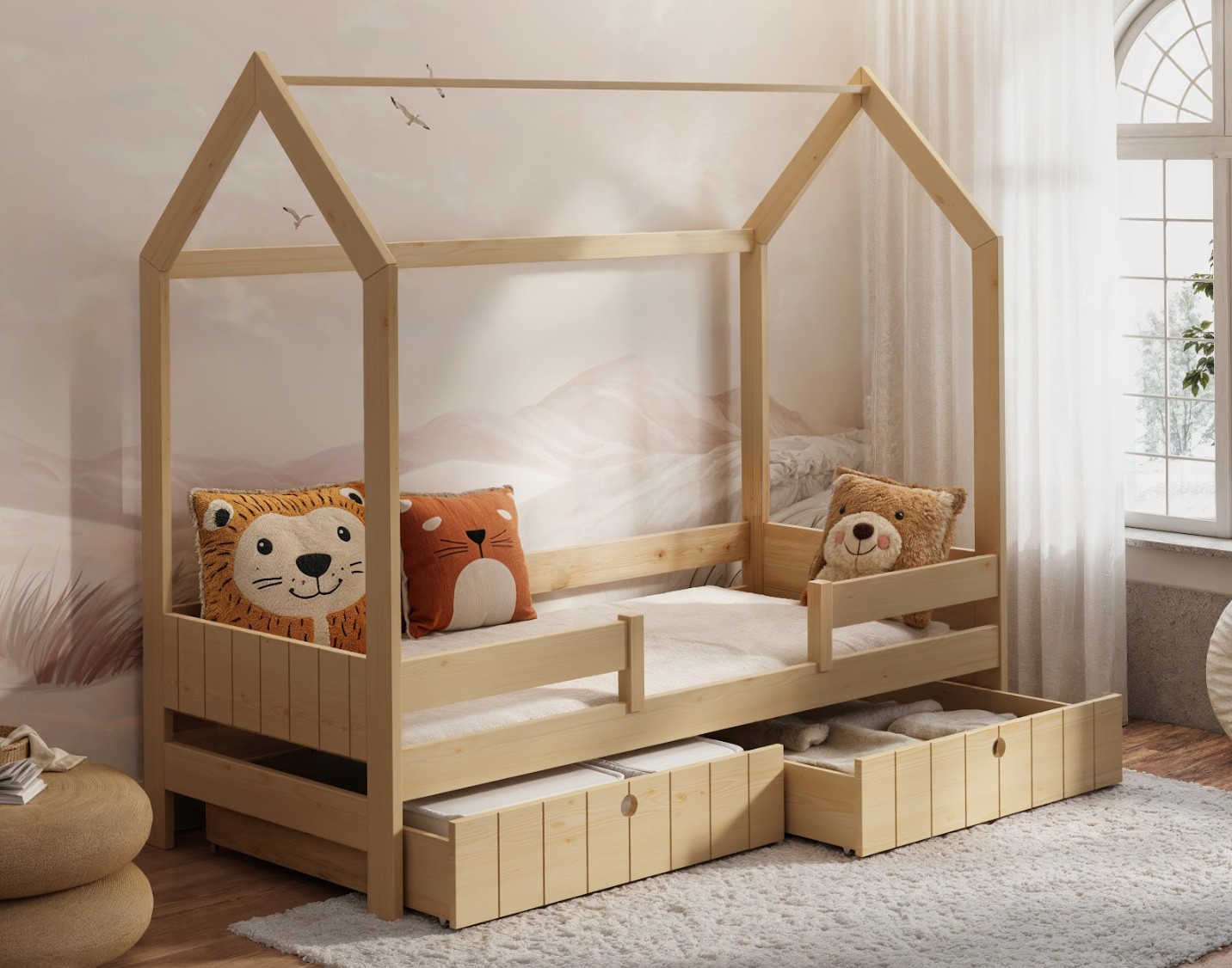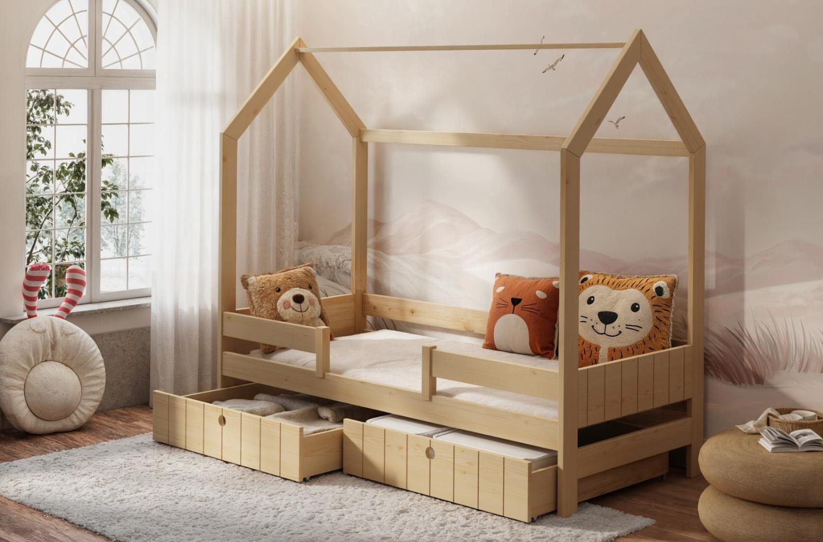 Dětská postel NAOMI s konstrukcí ve stylu domečku je jedinečnou kombinací funkčnosti, bezpečnosti a estetického designu, ideální do dětského nebo teenagerského pokoje. Její výrazná konstrukce ve tvaru domečku vytváří útulnou atmosféru, která vede k relaxaci a zároveň stimuluje dětskou fantazii a podporuje kreativní hru. Rám postele je vyroben z vysoce kvalitního borovicového dřeva, které se vyznačuje odolností, stabilitou a přírodním vzhledem. Pevná konstrukce unese nosnost až 100 kg, což zajišťuje bezpečné a pohodlné používání po mnoho let. Postel je vybavena dvěma bezpečnostními zábranami umístěnými na protilehlých stranách čela postele, které účinně chrání dítě před vypadnutím během spánku. Postel ve stylu domečku vhodná jak do malých dětských pokojů, tak i do větších interiérů v jakéhokoliv stylu interiéru – od klasického po moderní. K povrchové úpravě postele se používají pouze bezpečné a ekologické barvy a laky s příslušnými certifikáty, určené pro dětský nábytek. Jsou šetrné k životnímu prostředí a bezpečné pro zdraví dětí, neemitují škodlivé látky a splňují vysoké standardy kvality. Matrace není součástí balení, takže si můžete vybrat dětskou matraci přizpůsobenou vašim individuálním preferencím pohodlí při spaní. Postel je dodávána se dvěma prostornými šuplíky na kolečkách, kam si můžete uložit lůžkoviny, hračky nebo jiné nezbytnosti.
