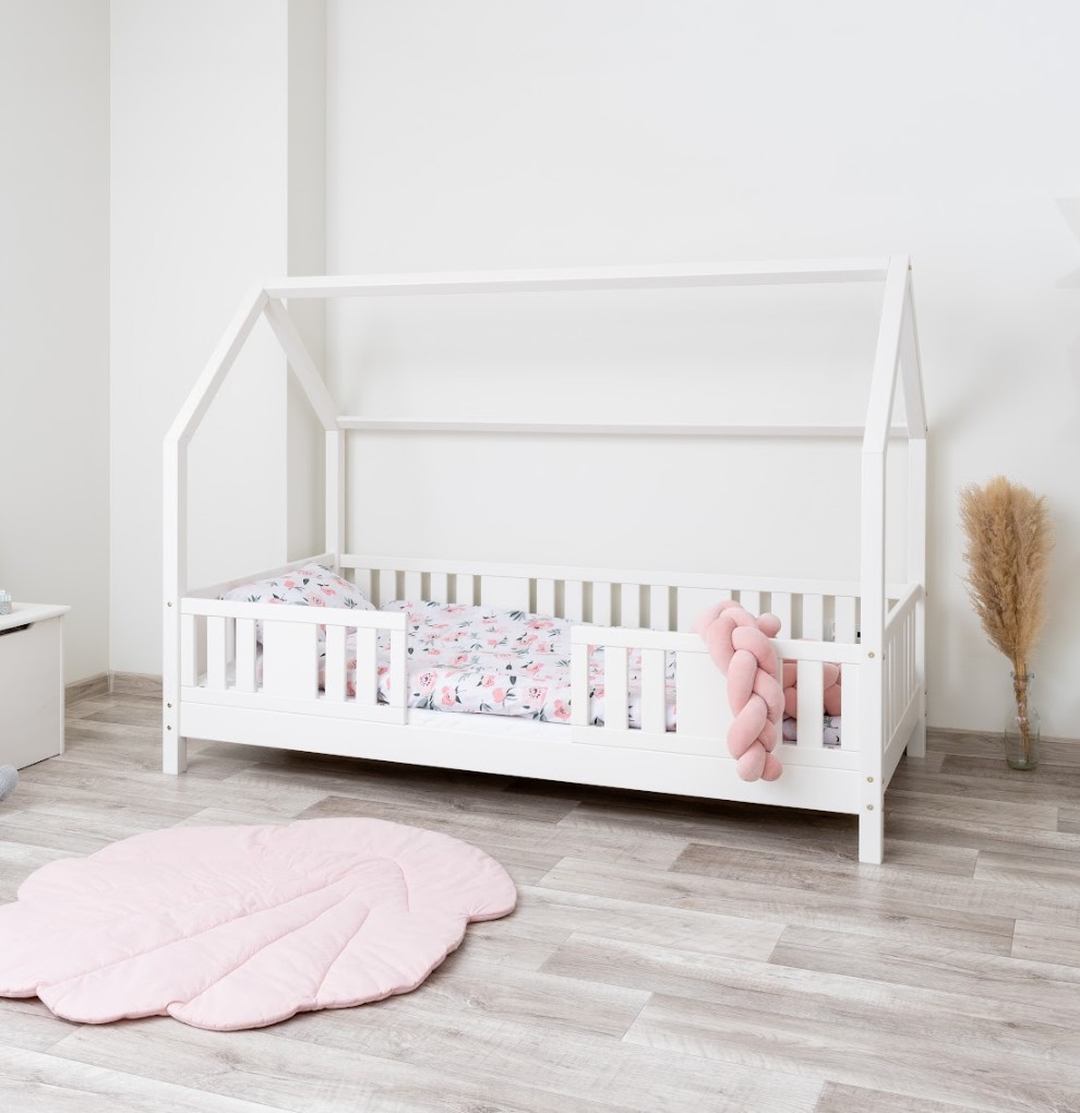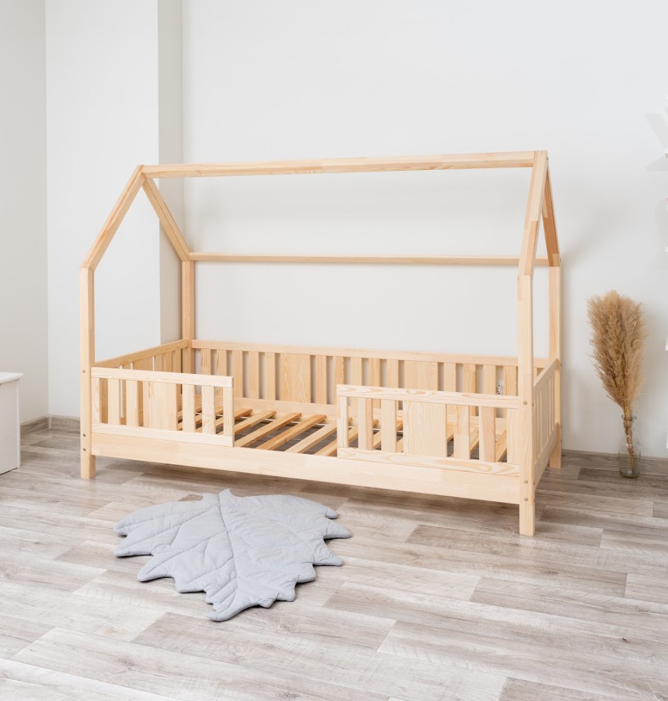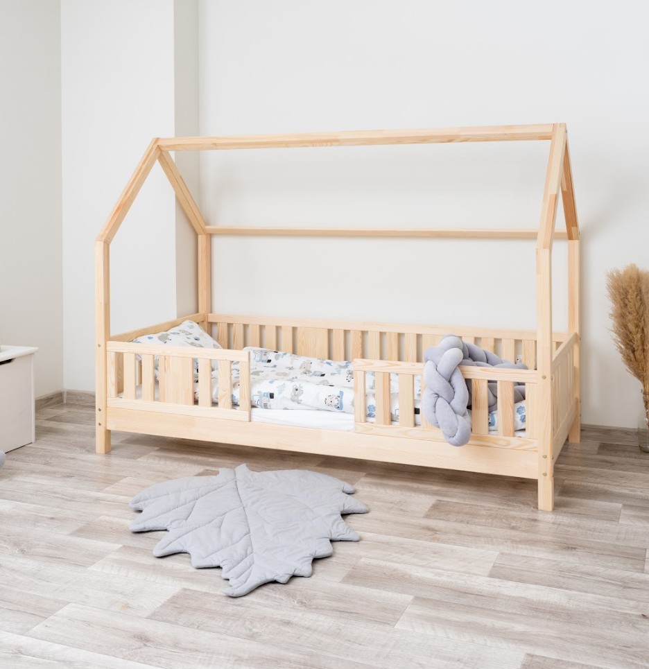 NIKO L 10 je dětská postel ve tvaru domečku, která v sobě spojuje bezpečnost, funkčnost a útulný pohádkový design. Díky nízkému profilu a 10 cm vysoké noze je ideální jako první postel pro dítě – podporuje nezávislost a zároveň zajišťuje maximální bezpečnost. Vyrobena z přírodního borovicového dřeva a natřena ekologickými barvami na vodní bázi vytváří teplý a bezpečný prostor pro spánek, hraní a relaxaci. Postel NIKO L 10 se vyznačuje výrazným dlouhým baldachýnem ve tvaru domečku, který v dětském pokoji vytváří jedinečně útulnou atmosféru. Dřevěný rám s jemným baldachýnem promění klasickou jednolůžkovou postel v kouzelný prostor – místo, kde se přirozeně prolíná spánek, hra a relaxace. Baldachýn můžete ozdobit světýlky, girlandami nebo látkami a vytvořit tak klidný koutek pro relaxaci nebo pohádkovou základnu pro vašeho malého průzkumníka. Decentní svislé lamely dodávají konstrukci lehký a elegantní vzhled a zároveň zvyšují pocit bezpečí během spánku. Postel je vyrobena výhradně z přírodního borovicového dřeva o síle 2,2 cm, které je známé svou odolností, stabilitou a přátelským charakterem. Každý prvek byl pečlivě broušen a všechny hrany jsou jemně zaoblené, aby se eliminovalo riziko poranění. Použité ekologické barvy na vodní bázi, které splňují normu EN 71-3, neobsahují toxiny ani pachy, takže je postel bezpečná i pro nejmenší děti a alergiky. Postel nabízíme také ve verzi bez povrchových úprav - nelakované dřevo. Díky tomu ji lze snadno přizpůsobit - její vzhled můžete upravit mořením, lakováním nebo malováním dle vlastního uvážení.