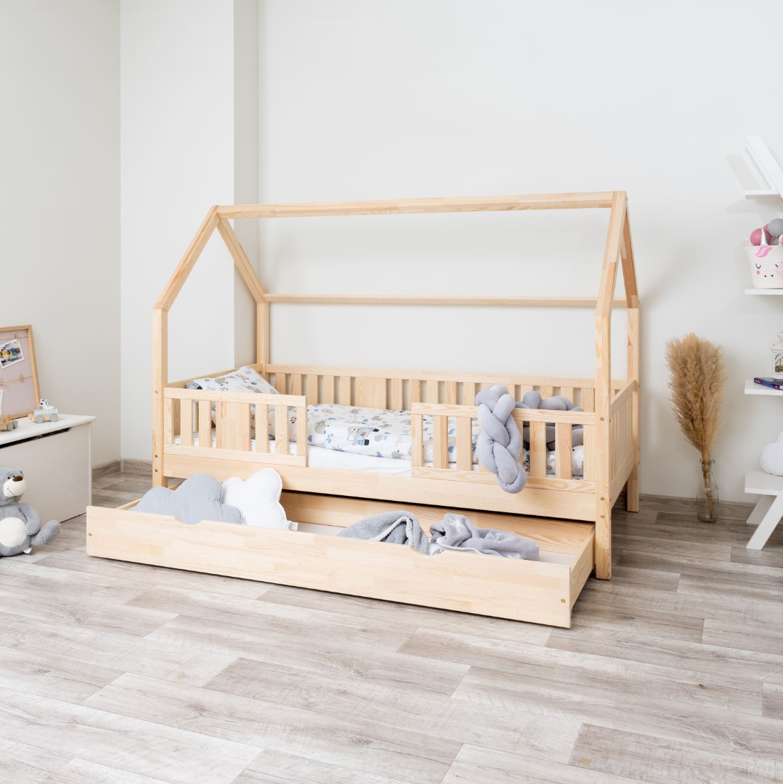 Výška nohou 20 cm otevírá nové designové možnosti. Pod postel můžete umístit jednu velkou zásuvku, dvě menší nebo zásuvku s funkcí spaní – ideální řešení pro sourozence nebo hosty. Je to praktické místo pro uložení ložního prádla, oblečení, dek a oblíbených hraček, které máte vždy na dosah ruky, ale mimo dohled. Díky tomu je NIKO L 20 nejen krásným designovým prvkem, ale také funkčním kusem nábytku, který pomáhá udržovat harmonii a pořádek v dětském prostoru.