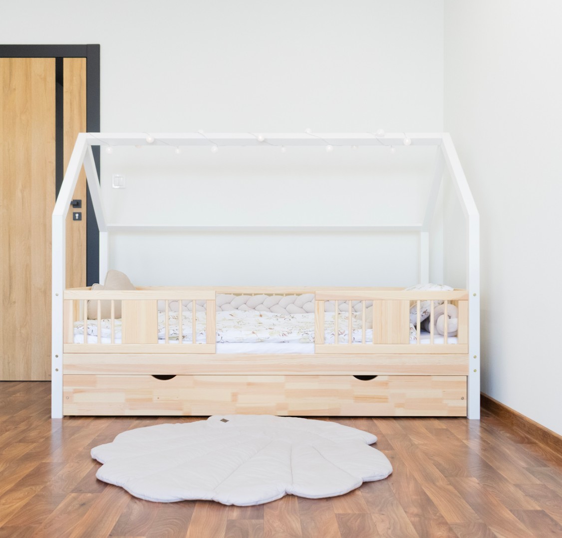 Dětská postel NIKO L 20 cm s nebesy je funkční postel do domu vyrobená z přírodního borovicového dřeva. Zvýšený rám umožňuje přidání zásuvek, čímž se zvětší úložný prostor pro ložní prádlo, oblečení a hračky. Stabilní konstrukce a ekologické barvy na vodní bázi, které splňují normy EU, zaručují bezpečnost a odolnost. Dekorativní nebesa vytvářejí v pokoji pohádkovou atmosféru a kombinují pohodlný spánek s kreativním prostorem pro hraní a relaxaci každého dítěte. Vyšší rám (20 cm) umožňuje přidání zásuvek – ideální pro uložení ložního prádla, oblečení nebo hraček. Postel NIKO L 20 je vyrobena z vysoce kvalitního, přírodního borovicového dřeva o síle 2,2 cm, které je odolné, bezpečné a hřejivé. Dřevěné povrchy jsou pečlivě broušené a chráněné ekologickými barvami na vodní bázi, které splňují evropské bezpečnostní normy EN 71-3. Postel nabízíme také ve verzi bez povrchových úprav - nelakované dřevo. Díky tomu ji lze snadno přizpůsobit - její vzhled můžete upravit mořením, lakováním nebo malováním dle vlastního uvážení. Baldachýn vytváří jedinečný, útulný prostor, který podporuje relaxaci i každodenní hraní.