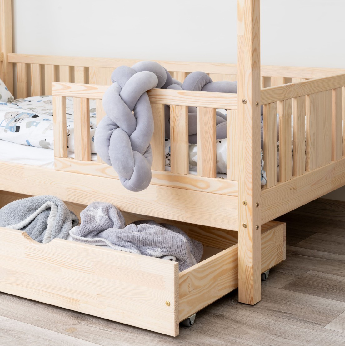 Dětská postel NIKO L 20 cm s nebesy je funkční postel do domu vyrobená z přírodního borovicového dřeva. Zvýšený rám umožňuje přidání zásuvek, čímž se zvětší úložný prostor pro ložní prádlo, oblečení a hračky. Stabilní konstrukce a ekologické barvy na vodní bázi, které splňují normy EU, zaručují bezpečnost a odolnost. Dekorativní nebesa vytvářejí v pokoji pohádkovou atmosféru a kombinují pohodlný spánek s kreativním prostorem pro hraní a relaxaci každého dítěte. Vyšší rám (20 cm) umožňuje přidání zásuvek – ideální pro uložení ložního prádla, oblečení nebo hraček. Postel NIKO L 20 je vyrobena z vysoce kvalitního, přírodního borovicového dřeva o síle 2,2 cm, které je odolné, bezpečné a hřejivé. Dřevěné povrchy jsou pečlivě broušené a chráněné ekologickými barvami na vodní bázi, které splňují evropské bezpečnostní normy EN 71-3. Postel nabízíme také ve verzi bez povrchových úprav - nelakované dřevo. Díky tomu ji lze snadno přizpůsobit - její vzhled můžete upravit mořením, lakováním nebo malováním dle vlastního uvážení. Baldachýn vytváří jedinečný, útulný prostor, který podporuje relaxaci i každodenní hraní.