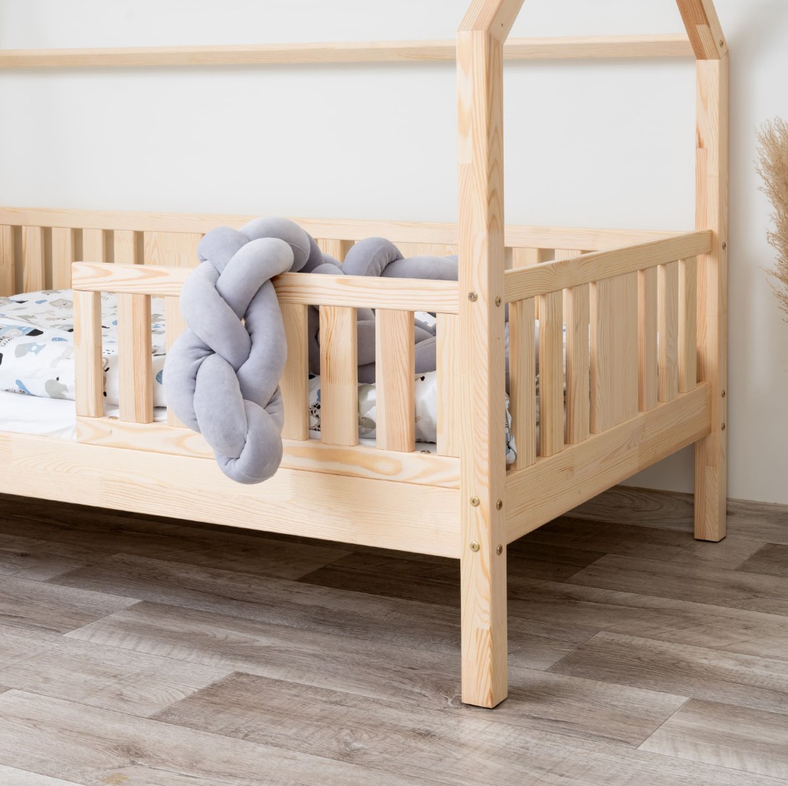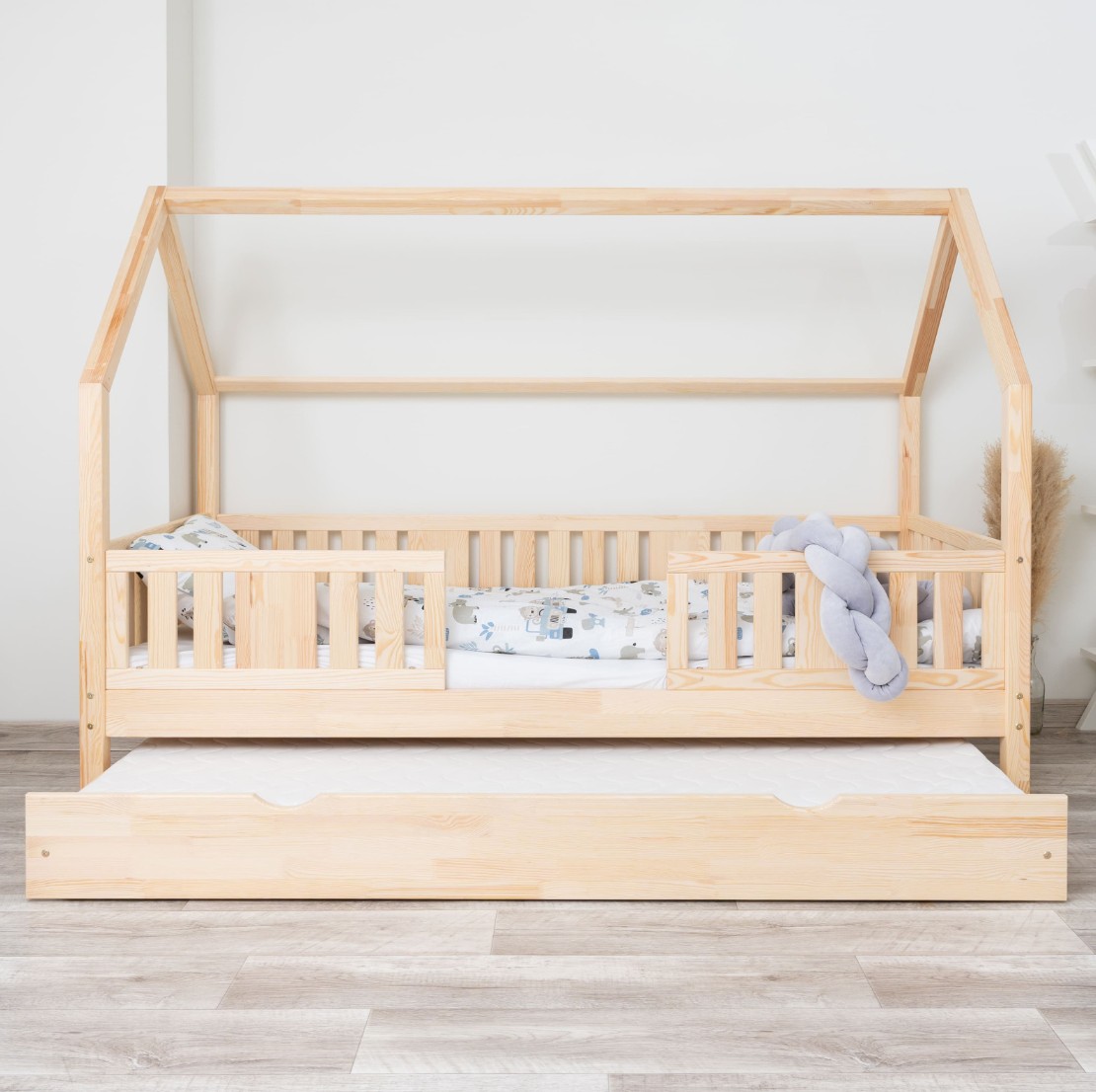 Dětská postel NIKO L 20 cm s nebesy je funkční postel do domu vyrobená z přírodního borovicového dřeva. Zvýšený rám umožňuje přidání zásuvek, čímž se zvětší úložný prostor pro ložní prádlo, oblečení a hračky. Stabilní konstrukce a ekologické barvy na vodní bázi, které splňují normy EU, zaručují bezpečnost a odolnost. Dekorativní nebesa vytvářejí v pokoji pohádkovou atmosféru a kombinují pohodlný spánek s kreativním prostorem pro hraní a relaxaci každého dítěte. Vyšší rám (20 cm) umožňuje přidání zásuvek – ideální pro uložení ložního prádla, oblečení nebo hraček. Postel NIKO L 20 je vyrobena z vysoce kvalitního, přírodního borovicového dřeva o síle 2,2 cm, které je odolné, bezpečné a hřejivé. Dřevěné povrchy jsou pečlivě broušené a chráněné ekologickými barvami na vodní bázi, které splňují evropské bezpečnostní normy EN 71-3. Postel nabízíme také ve verzi bez povrchových úprav - nelakované dřevo. Díky tomu ji lze snadno přizpůsobit - její vzhled můžete upravit mořením, lakováním nebo malováním dle vlastního uvážení. Baldachýn vytváří jedinečný, útulný prostor, který podporuje relaxaci i každodenní hraní.