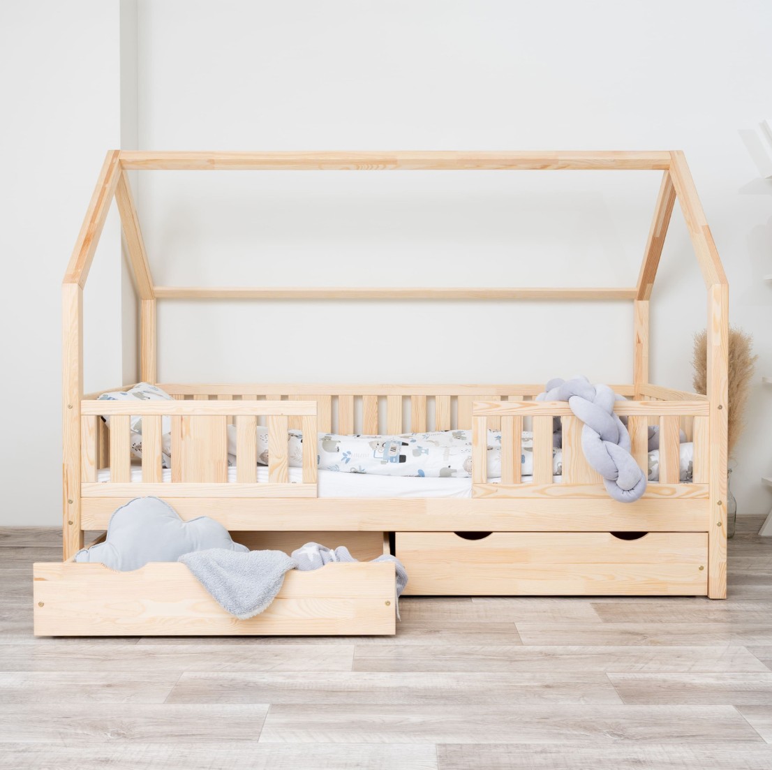 Výška nohou 20 cm otevírá nové designové možnosti. Pod postel můžete umístit jednu velkou zásuvku, dvě menší nebo zásuvku s funkcí spaní – ideální řešení pro sourozence nebo hosty. Je to praktické místo pro uložení ložního prádla, oblečení, dek a oblíbených hraček, které máte vždy na dosah ruky, ale mimo dohled. Díky tomu je NIKO L 20 nejen krásným designovým prvkem, ale také funkčním kusem nábytku, který pomáhá udržovat harmonii a pořádek v dětském prostoru.