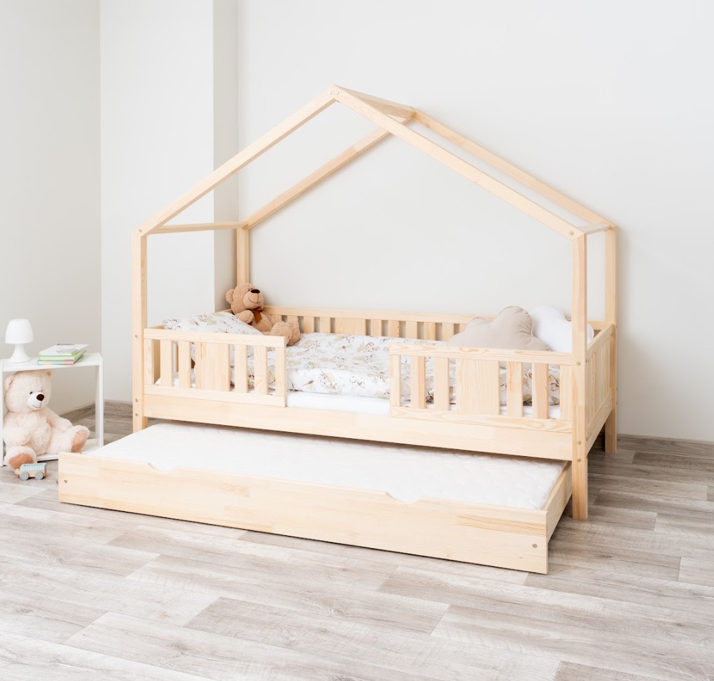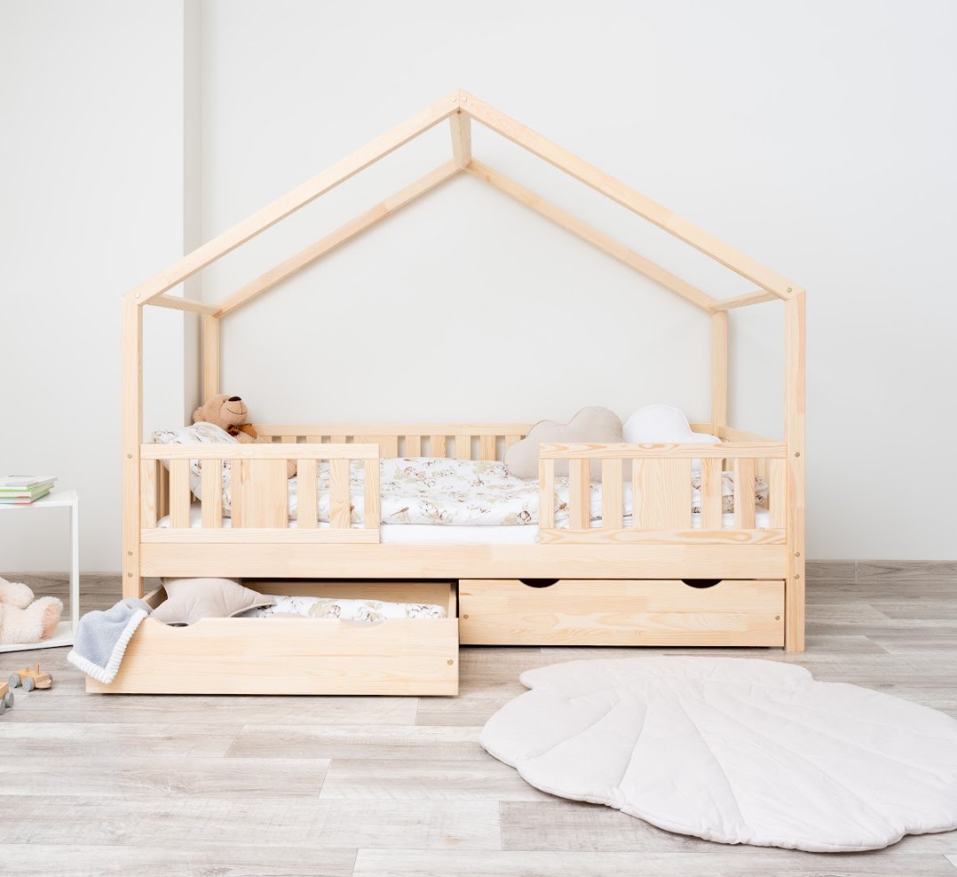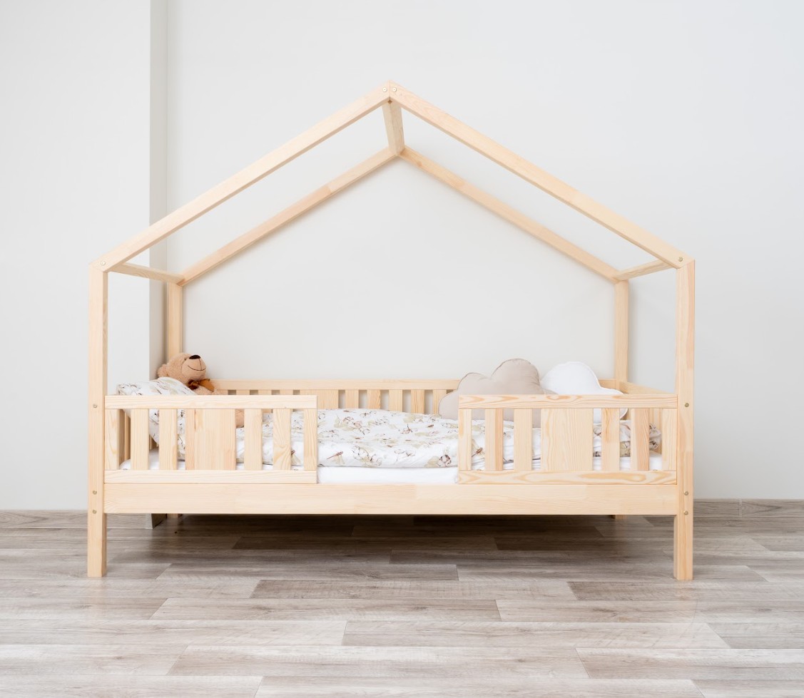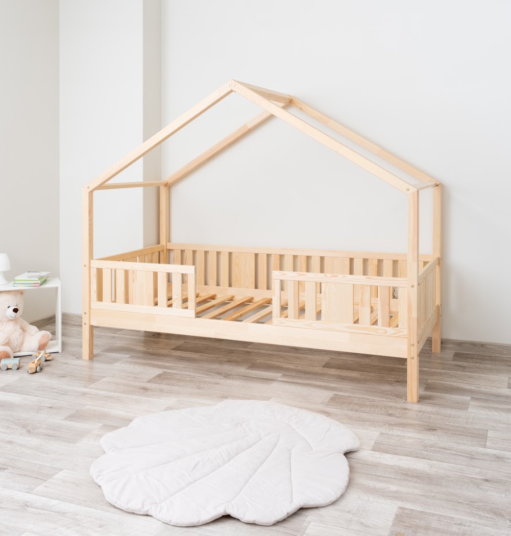 NIKO S 20 je unikátní jednolůžko ve tvaru domečku, které v sobě spojuje funkčnost, odolnost a pohádkový charakter. Její vyvýšená konstrukce na 20cm nohách dodává praktičnosti nový rozměr – pod postel lze umístit funkční zásuvky nebo další spací prostor. Zvýšený rám zlepšuje cirkulaci vzduchu kolem matrace a usnadňuje udržování čistoty pod postelí, což je obzvláště důležité v pokojích nejmenších dětí. Konstrukce, vyrobená výhradně z přírodního borovicového dřeva, zaručuje odolnost, bezpečnost a jedinečný vzhled. Charakteristický dřevěný baldachýn vytváří útulný prostor, kde se každý den prolíná spánek, hra a fantazie. Každý prvek dětské postele NIKO S 20 je vyroben z přírodního borovicového dřeva o síle 2,2 cm – trvanlivého, odolného a zcela bezpečného materiálu. Dřevo je pečlivě broušeno a všechny hrany jsou jemně zaoblené, čímž se minimalizuje riziko zranění. Ekologické barvy na vodní bázi, které splňují evropskou normu EN 71-3, neobsahují toxiny ani nepříjemné pachy. Díky tomu je postel vhodná i pro nejmenší děti a alergiky. Postel nabízíme také ve verzi bez povrchových úprav - nelakované dřevo. Díky tomu ji lze snadno přizpůsobit - její vzhled můžete upravit mořením, lakováním nebo malováním dle vlastního uvážení. Design domečku stimuluje kreativitu – přes den se postel promění v hrací prostor a v noci podporuje klid. Stačí přidat měkké bavlněné ložní prádlo a tlumené osvětlení a vytvořit tak útulnou atmosféru pro spaní.