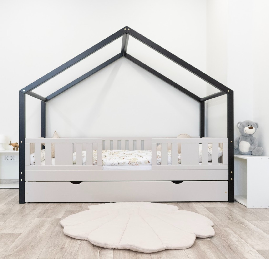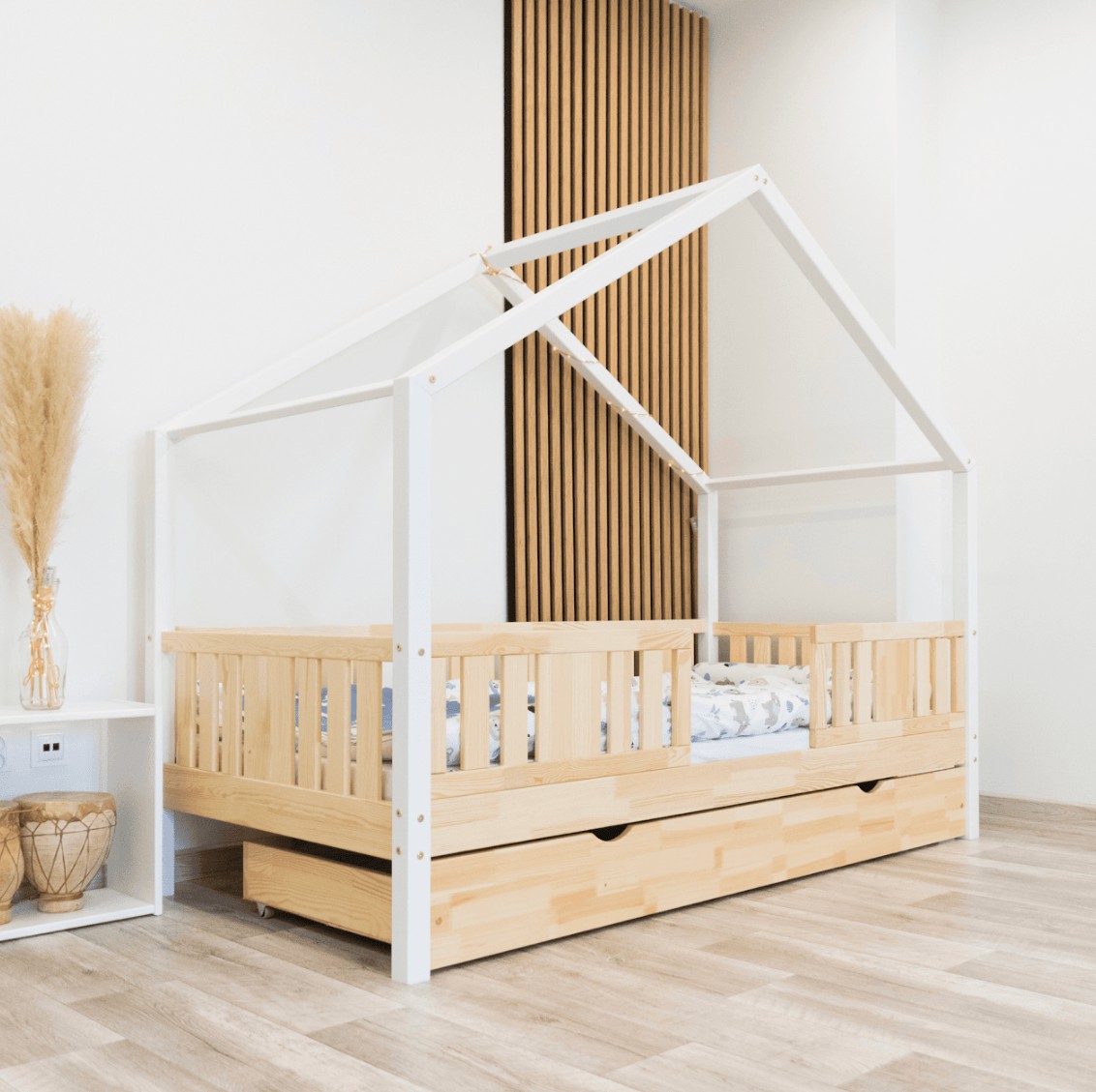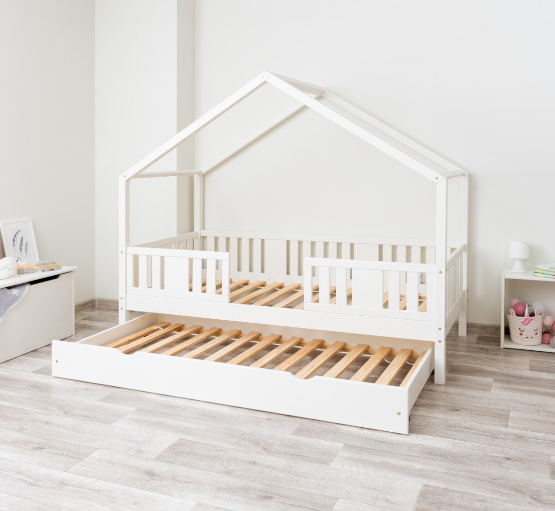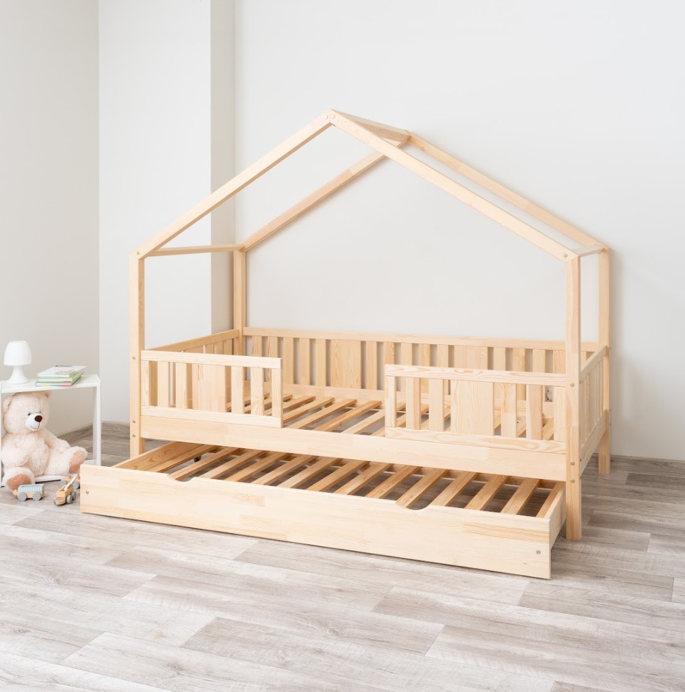 NIKO S 20 je unikátní jednolůžko ve tvaru domečku, které v sobě spojuje funkčnost, odolnost a pohádkový charakter. Její vyvýšená konstrukce na 20cm nohách dodává praktičnosti nový rozměr – pod postel lze umístit funkční zásuvky nebo další spací prostor. Zvýšený rám zlepšuje cirkulaci vzduchu kolem matrace a usnadňuje udržování čistoty pod postelí, což je obzvláště důležité v pokojích nejmenších dětí. Konstrukce, vyrobená výhradně z přírodního borovicového dřeva, zaručuje odolnost, bezpečnost a jedinečný vzhled. Charakteristický dřevěný baldachýn vytváří útulný prostor, kde se každý den prolíná spánek, hra a fantazie. Každý prvek dětské postele NIKO S 20 je vyroben z přírodního borovicového dřeva o síle 2,2 cm – trvanlivého, odolného a zcela bezpečného materiálu. Dřevo je pečlivě broušeno a všechny hrany jsou jemně zaoblené, čímž se minimalizuje riziko zranění. Ekologické barvy na vodní bázi, které splňují evropskou normu EN 71-3, neobsahují toxiny ani nepříjemné pachy. Díky tomu je postel vhodná i pro nejmenší děti a alergiky. Postel nabízíme také ve verzi bez povrchových úprav - nelakované dřevo. Díky tomu ji lze snadno přizpůsobit - její vzhled můžete upravit mořením, lakováním nebo malováním dle vlastního uvážení. Design domečku stimuluje kreativitu – přes den se postel promění v hrací prostor a v noci podporuje klid. Stačí přidat měkké bavlněné ložní prádlo a tlumené osvětlení a vytvořit tak útulnou atmosféru pro spaní.