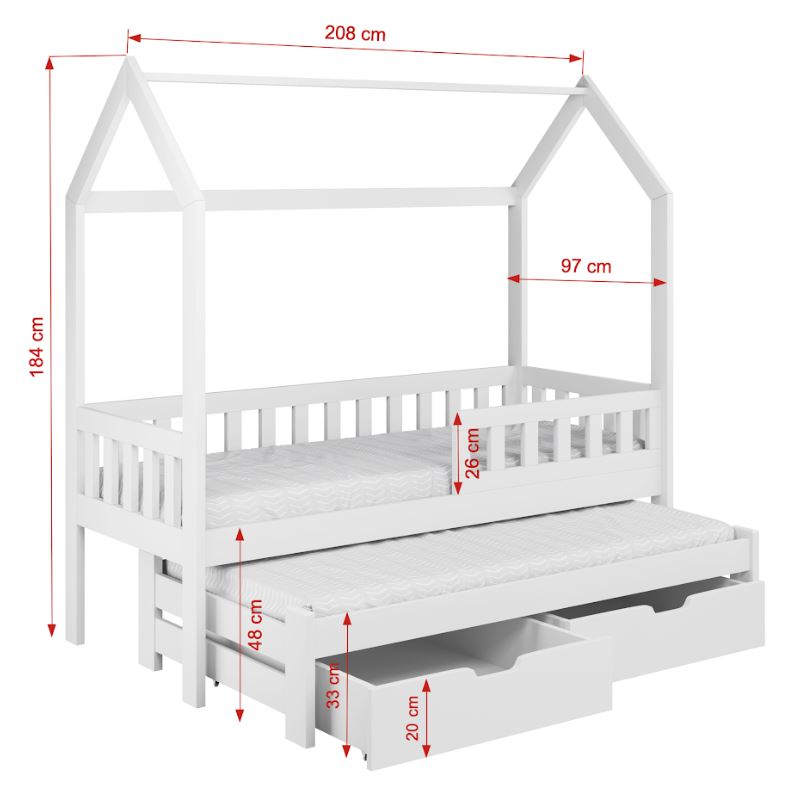 Dětská postel z masivu borovice TIMMY je skvělou volbou, pokud hledáte kvalitní a robustní postel. Postel se vyznačuje svou praktičností, atraktivním designem a její hlavní předností je úspora místa v dětském pokoji. Praktické výsuvné lůžko zajišťuje plnohodnotný prostor pro spaní druhého dítěte, kamaráda či návštěvy. Postel je vyrobena z velice kvalitního borovicového dřeva, které je ošetřeno třemi vrstvami ekologického laku. Tím je zajištěna vysoká odolnost postele vůči mechanickému poškození a různým druhům nečistot. Postel je dodávána se dvěma prostornými šuplíky na kolečkách, kam si můžete uložit lůžkoviny, hračky nebo jiné nezbytnosti. Bezpečnost dětí zajišťuje ochranná bariéra s možností univerzální montáže na pravou i levou stranu postele.