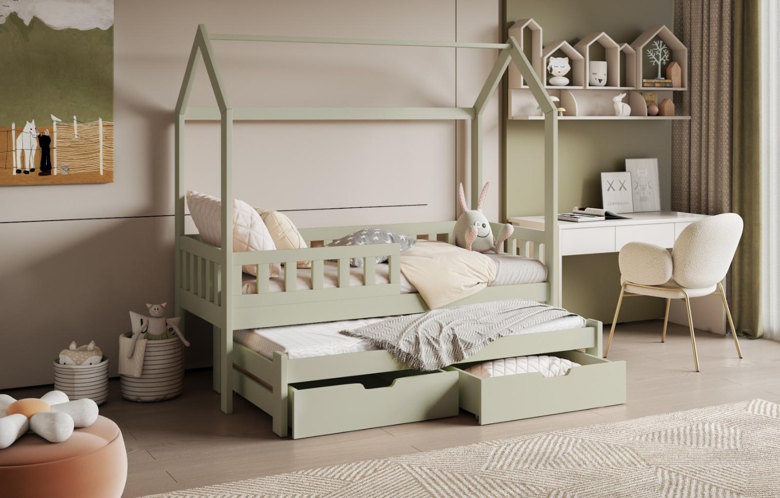 Dětská domečková postel z masivu borovice TIMMY se šuplíky a přistýlkou - 200x90 cm - olivově zelená