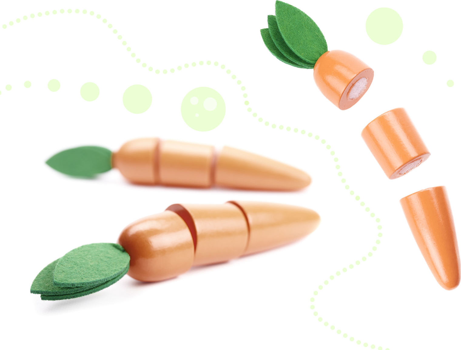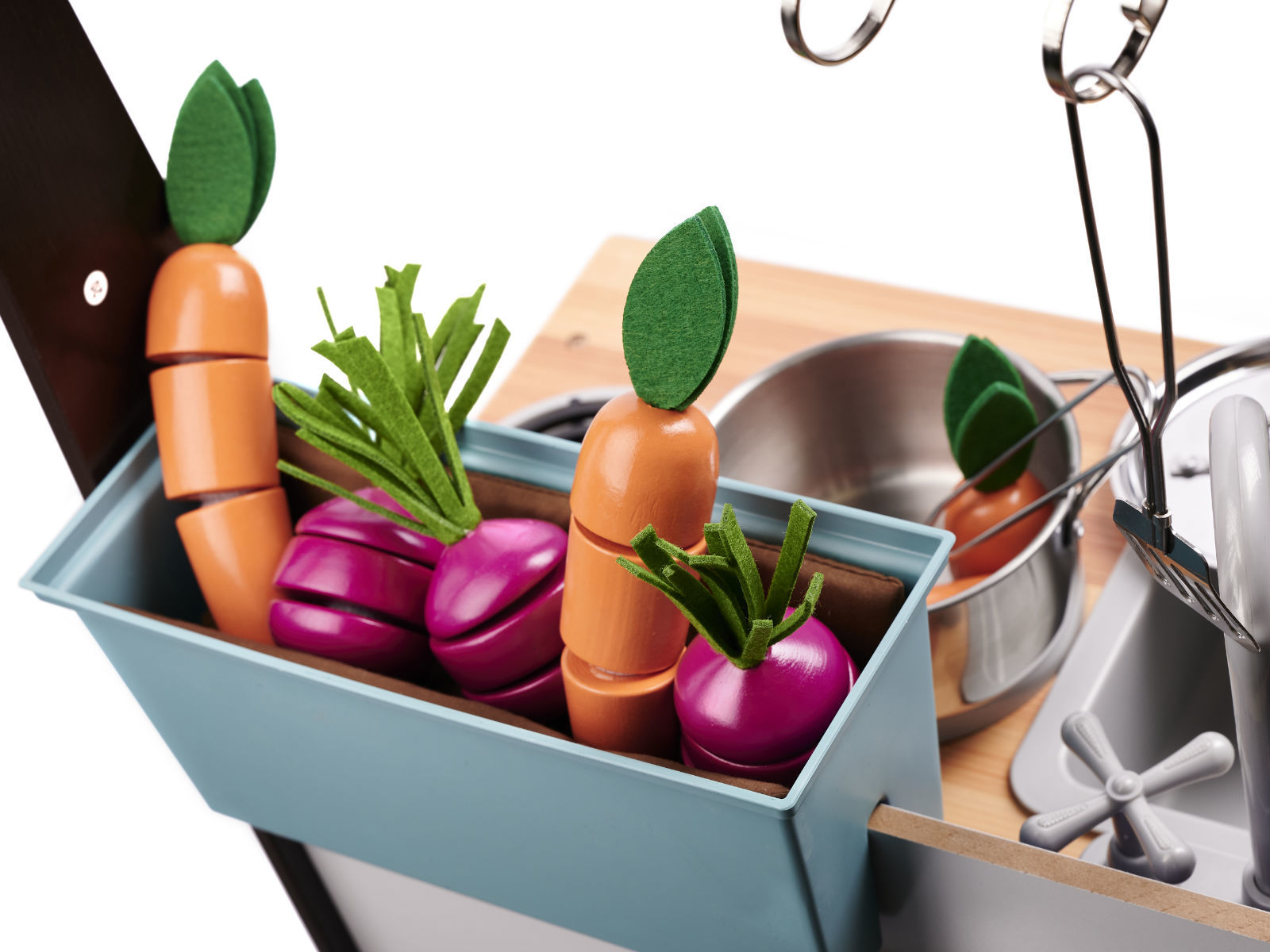 V sadě najdete kovovou pánev, hrnec s pokličkou, dřevěný nůž a další potřebné prvky, aby malý kuchař mohl uvařit skutečné kulinářské dílo. Realisticky vypadající mrkev a ředkvičky, které se dají krájet jako skutečná zelenina, navíc skvěle zpestří hru a poskytnou vašemu dítěti spoustu zábavy. Kuchyňská linka je navíc vybavena troubou s otevíracími dvířky, skříňkou, látkovými organizéry, které imitují zásuvky, a baterií s dřezem.