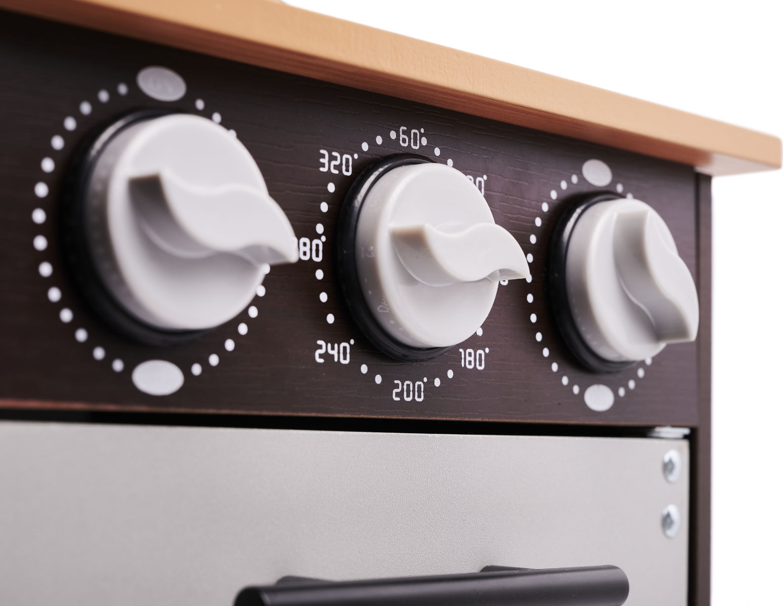 Jako v každé moderní kuchyni je i zde chladnička s výrobníkem kostek ledu, který vydává zvuky podobné skutečnému spotřebiči. Hra s kuchyní je nejen skvělou zábavou, ale také záminkou k učení se základním domácím pracím. Vaše dítě se naučí základním úkonům při vaření, servírování jídel a udržování pořádku. Dřevěná kuchyňka vám umožní vysvětlit dítěti nebezpečí hořáků a obsluhu trouby bez rizika popálení.