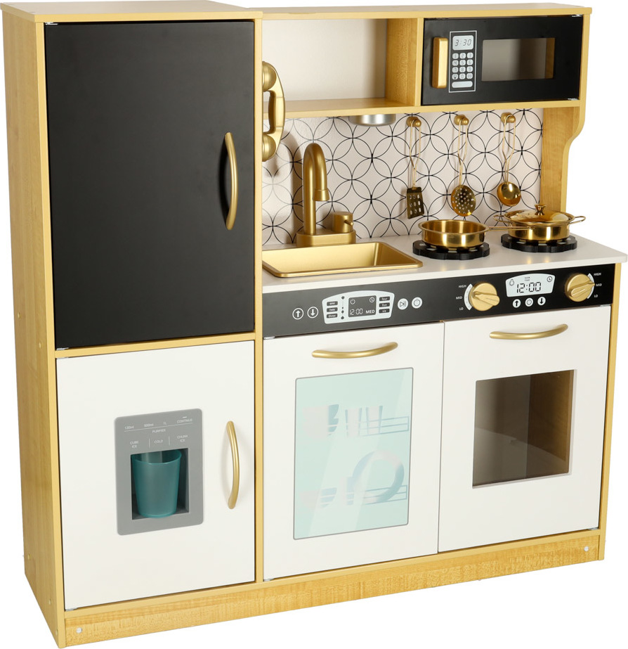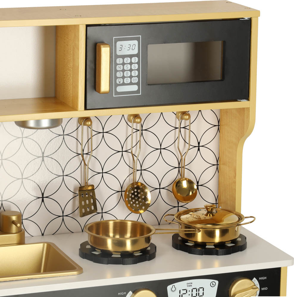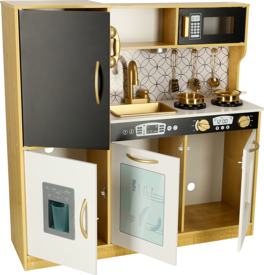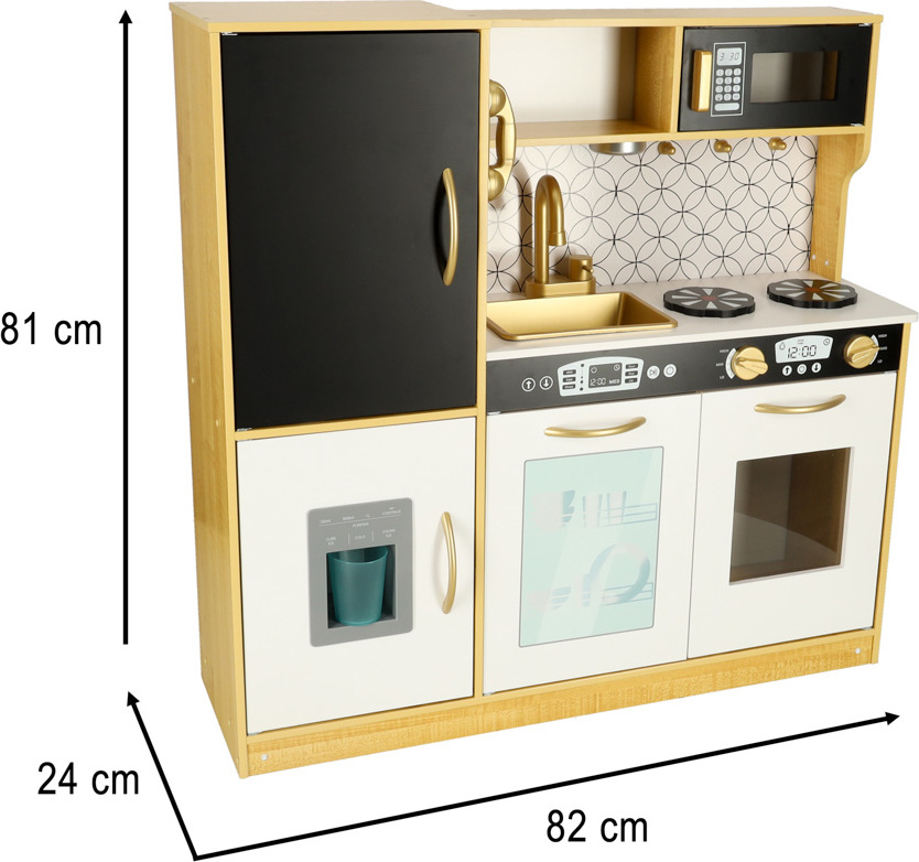 Tato dřevěná kuchyňka pro děti je hračka, která podporuje rozvoj kreativity a manuálních dovedností. Obsahuje realistické spotřebiče: ledničku s výrobníkem ledu, dřez, mikrovlnnou troubu, myčku nádobí a troubu, kterou lze také využít jako praktický úložný prostor. Osvětlení pod skříňkou (napájené třemi bateriemi AAA) a pohyblivé knoflíky, které vydávají zvuky hoření, umocňují realističnost hry. Sada obsahuje kuchyňské doplňky, jako je hrnec, pánev a kuchyňské náčiní, které dětem umožňuje stát se malými kuchaři. Kuchyňka je také vybavena tabulí na psaní receptů nebo nákupních seznamů (křída je součástí balení). Kuchyňka je černobílá se zlatými akcenty. Pracovní deska je vysoká 46 cm, takže je vhodná pro dětskou výšku a zajišťuje pohodlné hraní.