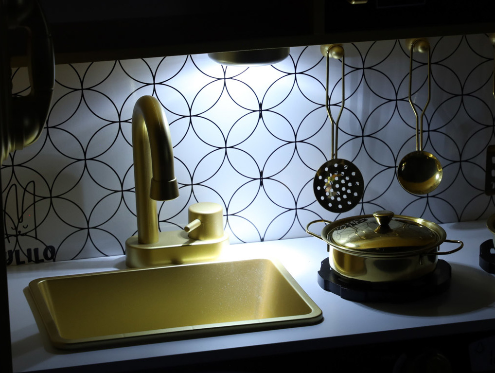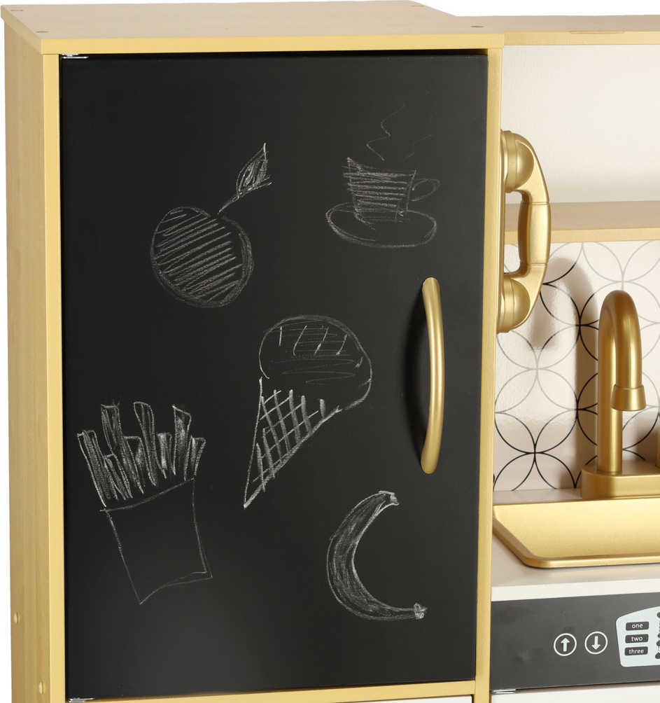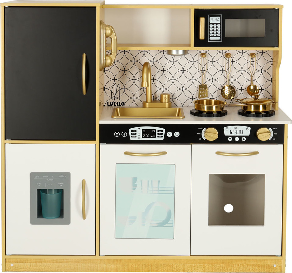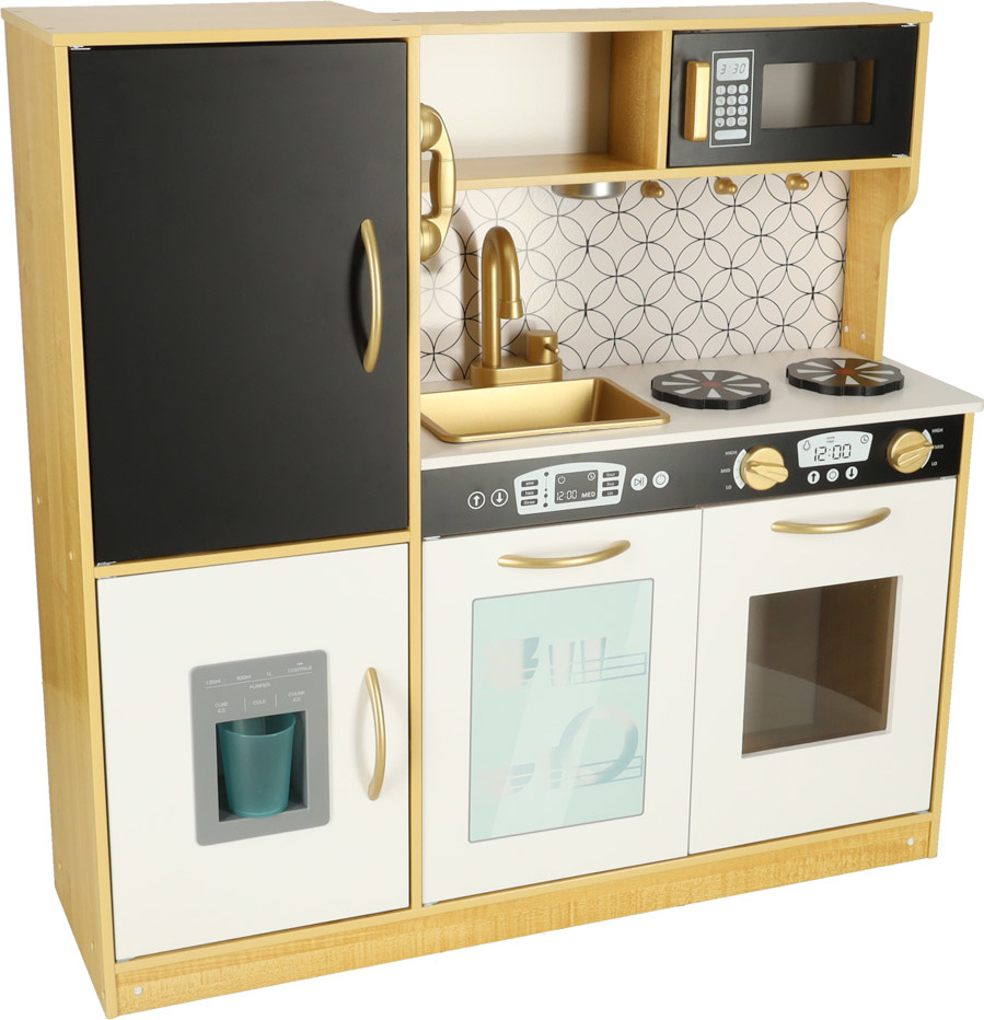 Tato dřevěná kuchyňka pro děti je hračka, která podporuje rozvoj kreativity a manuálních dovedností. Obsahuje realistické spotřebiče: ledničku s výrobníkem ledu, dřez, mikrovlnnou troubu, myčku nádobí a troubu, kterou lze také využít jako praktický úložný prostor. Osvětlení pod skříňkou (napájené třemi bateriemi AAA) a pohyblivé knoflíky, které vydávají zvuky hoření, umocňují realističnost hry. Sada obsahuje kuchyňské doplňky, jako je hrnec, pánev a kuchyňské náčiní, které dětem umožňuje stát se malými kuchaři. Kuchyňka je také vybavena tabulí na psaní receptů nebo nákupních seznamů (křída je součástí balení). Kuchyňka je černobílá se zlatými akcenty. Pracovní deska je vysoká 46 cm, takže je vhodná pro dětskou výšku a zajišťuje pohodlné hraní.