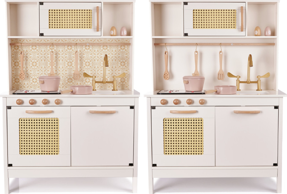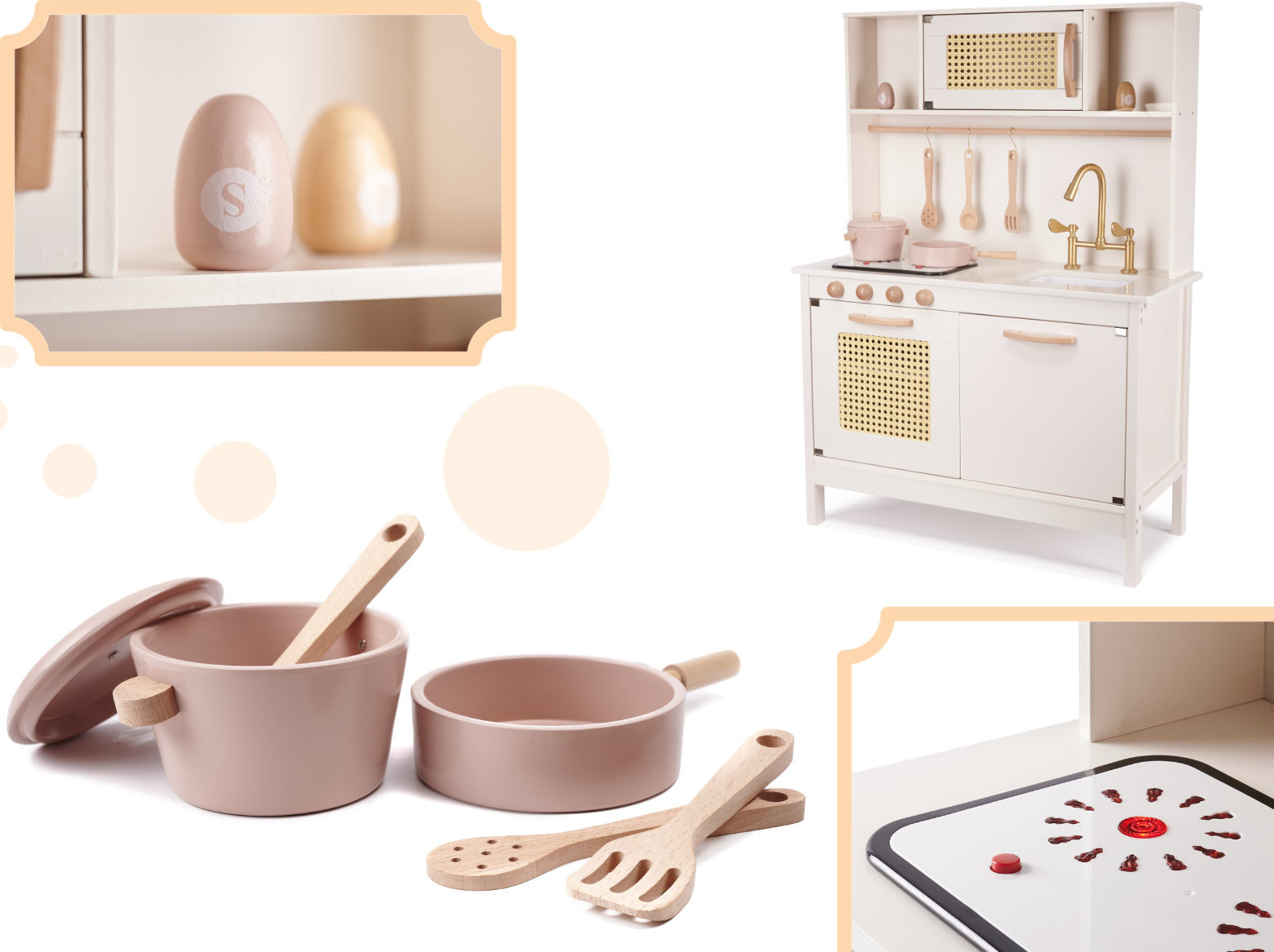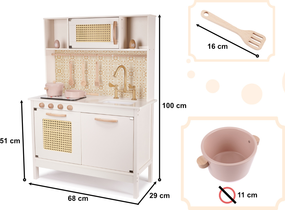 Většina komponentů je vyrobena ze dřeva. Celá věc byla pečlivě obroušena a natřena netoxickou barvou - to vše pro bezpečnost vašeho děťátka. Jistě jste viděli mnoho modelů dětských kuchyní. Tento model se vyznačuje nadčasovým retro designem. Rozhodněte se, jak bude vaše kuchyně vypadat. Oboustranná stěna vám dává možnost změnit vzhled kuchyně podle vašich preferencí. Na jedné straně je hladká krémová stěna a na druhé straně ornamentální tapeta. Velkou výhodou kuchyně je, že je vybavena světelnými a zvukovými efekty. Má odnímatelný panel plynového sporáku, který po stisknutí tlačítek svítí a vydává zvuky podobné skutečnému spotřebiči.