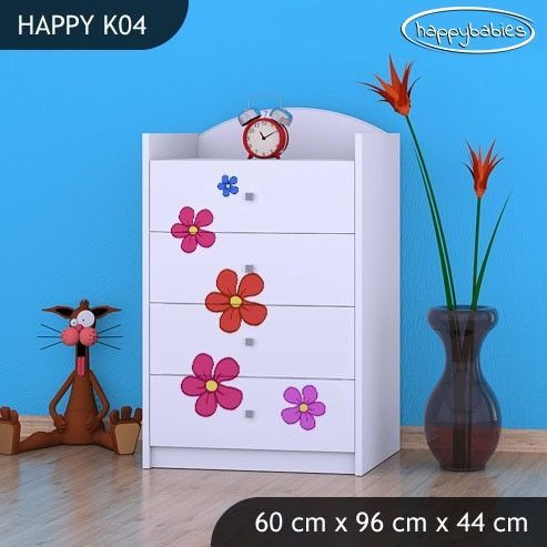 Dětské komody patří do každého dětského pokoje. Komody jsou nejen krásné, ale hlavně praktické. Dětem slouží k uložení oblečení, nejrůznějších hraček a drobností a učí je pořádku. Nabízíme Vám krásnou dětskou komodu se čtyřmi zásuvkami, která je vyrobena z vysoce kvalitní lamino desky a na čelech šuplíků má krásný barevný potisk, který se Vašemu dítěti jistě zalíbí. Vybrat si můžete také barvu nábytku.