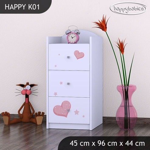 Dětské komody patří do každého dětského pokoje. Komody jsou nejen krásné, ale hlavně praktické. Dětem slouží k uložení oblečení, nejrůznějších hraček a drobností a učí je pořádku. Nabízíme Vám krásnou dětskou komodu se třemi zásuvkami, která je vyrobena z vysoce kvalitní lamino desky a na čelech šuplíků má krásný barevný potisk, který se Vašemu dítěti jistě zalíbí. Vybrat si můžete také barvu nábytku.