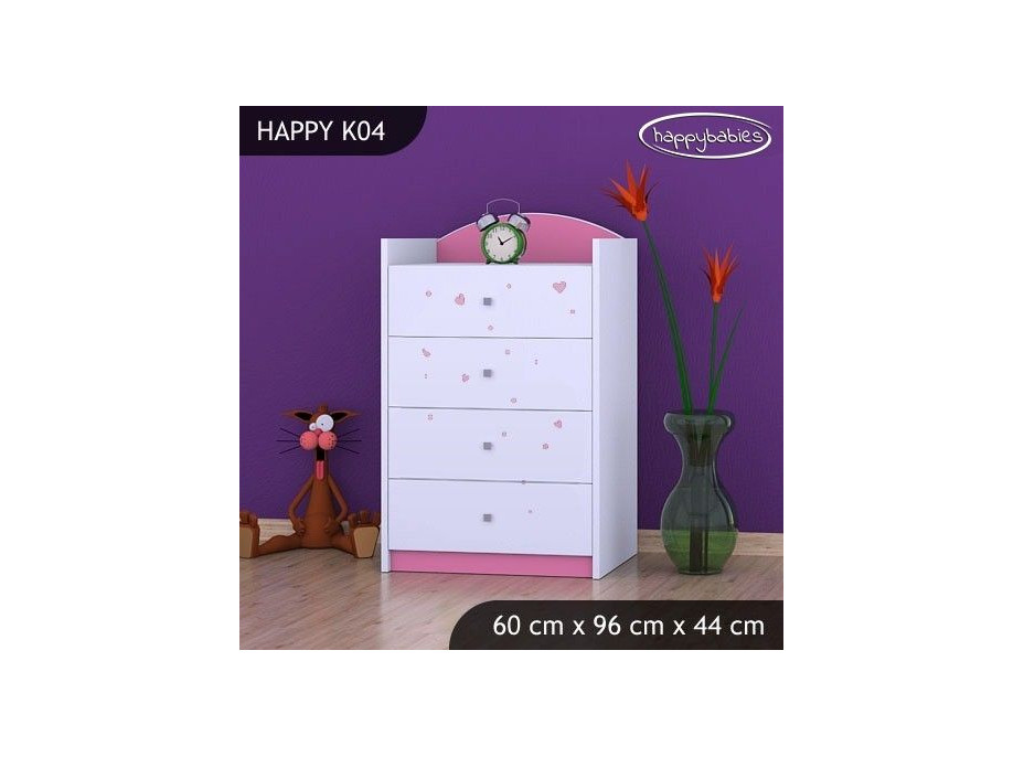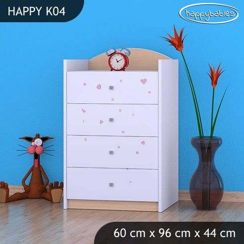 Dětské komody patří do každého dětského pokoje. Komody jsou nejen krásné, ale hlavně praktické. Dětem slouží k uložení oblečení, nejrůznějších hraček a drobností a učí je pořádku. Nabízíme Vám krásnou dětskou komodu se čtyřmi zásuvkami, která je vyrobena z vysoce kvalitní lamino desky a na čelech šuplíků má krásný barevný potisk, který se Vašemu dítěti jistě zalíbí. Vybrat si můžete také barvu nábytku.