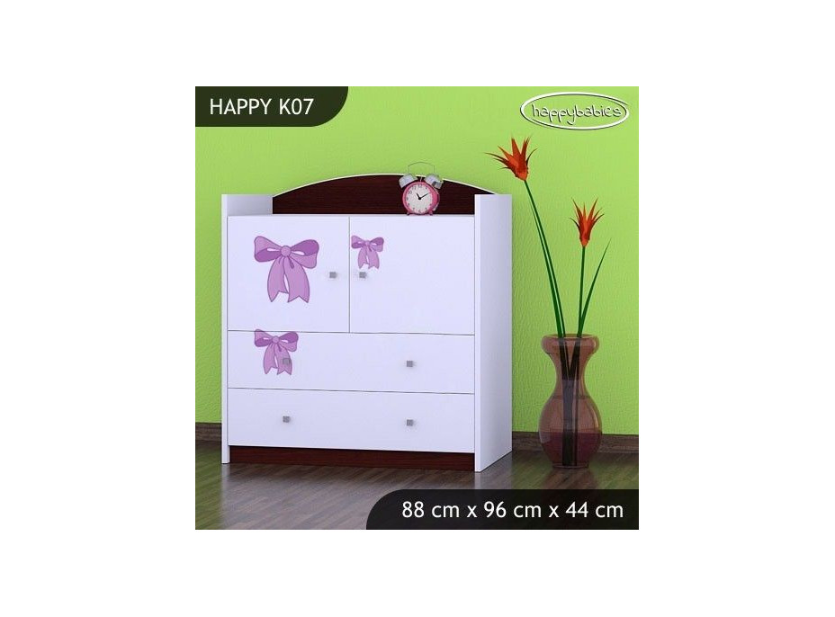 Dětské komody patří do každého dětského pokoje. Komody jsou nejen krásné, ale hlavně praktické. Dětem slouží k uložení oblečení, nejrůznějších hraček a drobností a učí je pořádku. Nabízíme Vám krásnou dětskou komodu, která má dvě zásuvky a dvě zavírací přihrádky. Tato komoda a je vyrobena z vysoce kvalitní lamino desky a na čelech šuplíků a dvířkách přihrádek má krásný barevný potisk, který se Vašemu dítěti jistě zalíbí. Zvolit si můžete také barvu nábytku, aby dokonale ladil s dětským pokojíčkem.