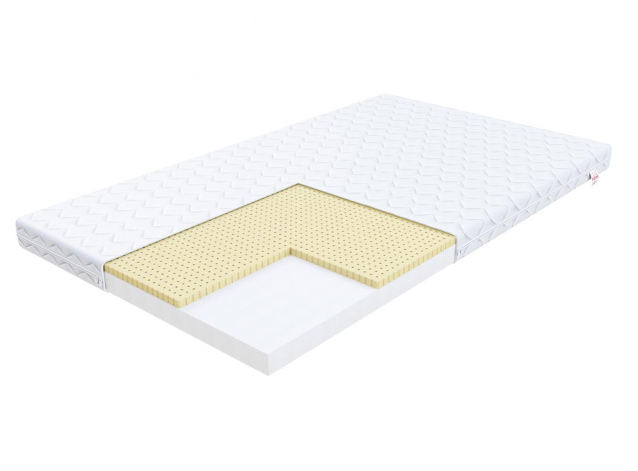 Složení matrace: latexová vrstva (20% přírodní latex s hustotou 60kg/m3, 80% syntetický latex s hustotou 60 kg/m3), polyuretanová pěna s hustotou 25 kg/m3