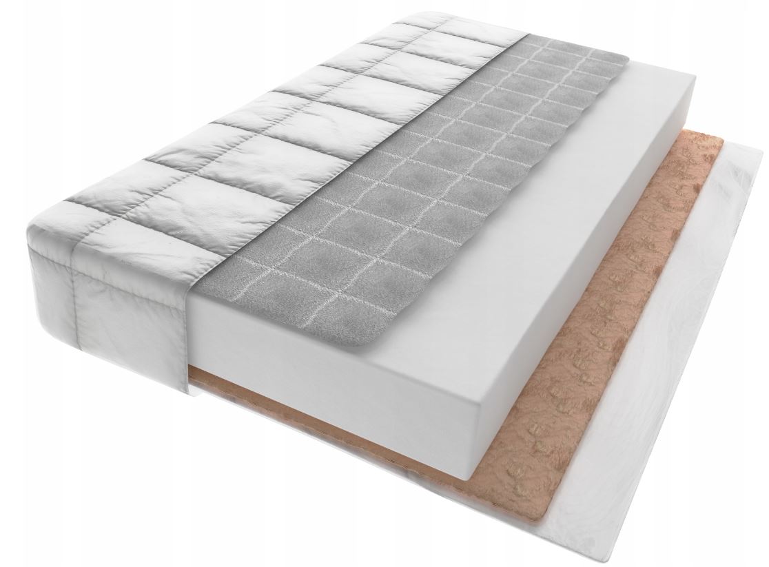 Konstrukce jádra matrace: kokosová vrstva (stupeň tvrdosti H3) + kvalitní polyuretanová PUR pěna (stupeň tvrdosti H2) + pohanková vrstva (stupeň tvrdosti H2)