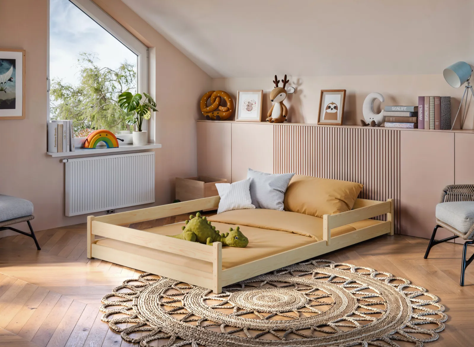 Nízká dětská postel ALICE je perfektním řešením pro malé průzkumníky, kteří se chtějí ve svém pokoji cítit sebejistě a pohodlně. Díky nízké konstrukci a volnému vstupu ji řadíme mezi Montessori nábytek. Princip Montessori klade důraz na volnost dítěte, což tato postel nabízí. Dítě má do postele volný přístup a díky tomu, že je postel nízká a chráněná bočnicemi, je bezpečná také pro nejmenší děti. Nízká postel se svým minimalistickým designem a přívětivým vzhledem stává nejen místem k odpočinku, ale i prostorem pro hru a kreativní objevování dětí. Postel je vyrobena z vysoce kvalitního borovicového dřeva a splňuje veškeré bezpečnostní standardy. Postel je odolná proti poškrábání a to díky třem vrstvám ekologického laku s certifikací EN 71-3 : 2013. Lak je bez zápachu a vyznačuje se vynikající světlostálostí