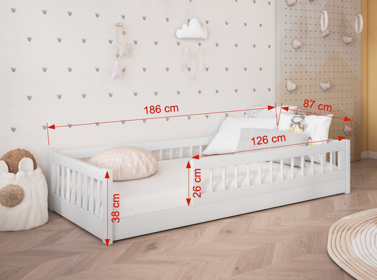 Dětská postel z masivu borovice FLORES je elegantní jednolůžko, které dokonale kombinuje funkčnost s moderním designem. Díky nízké konstrukci a volnému vstupu ji řadíme mezi Montessori nábytek. Princip Montessori klade důraz na volnost dítěte, což tato postel nabízí. Dítě má do postele volný přístup a díky tomu, že je postel nízká a chráněná bočnicemi, je bezpečná i pro nejmenší děti. Postel se vyznačuje svou praktičností a atraktivním designem, který skvěle zapadne do každého dětského pokoje. Postel je vyrobena z velice kvalitního borovicového dřeva, které je ošetřeno třemi vrstvami ekologického laku. Tím je zajištěna vysoká odolnost postele vůči mechanickému poškození a různým druhům nečistot. Bezpečnost dětí zajišťují vysoké bočnice a ochranná bariéra, která zabrání nechtěným pádům dítěte během spánku.