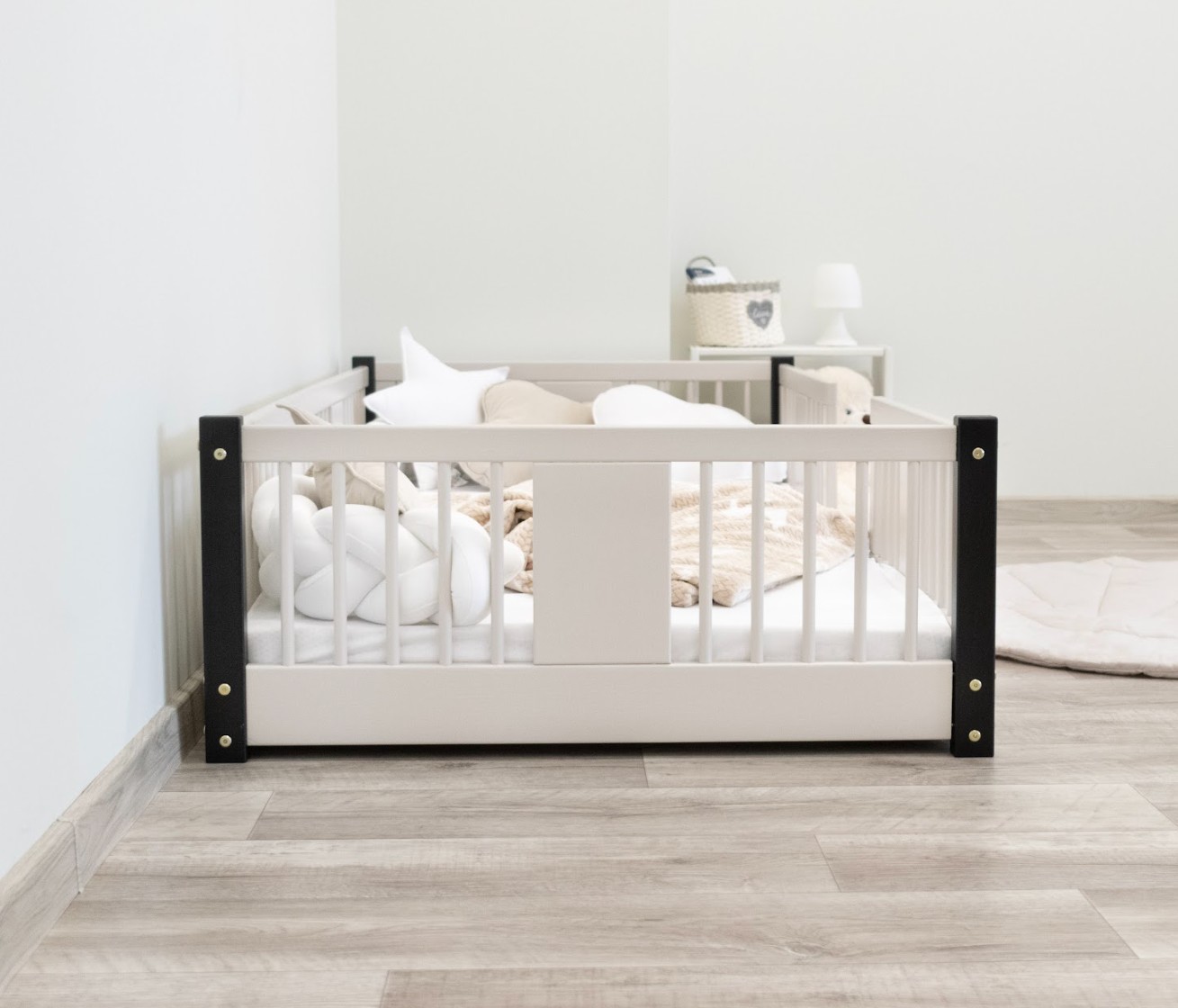 Montessori postel LUNA je unikátní nízká dětská postel s kulatými laťkami, navržená s ohledem na nejmladší uživatele. Díky výšce 0 cm se rám dotýká podlahy, což dětem umožňuje samostatné vstávání a lezení z postele a bezpečně je učí samostatnosti. Princip Montessori klade důraz na volnost dítěte, což tato postel nabízí. Je to perfektní volba pro rodiče, kteří hledají první postel pro své dítě, kombinující estetiku, odolnost a bezpečnost v duchu stylu Montessori. Postel LUNA je vyrobena výhradně z přírodního borovicového dřeva pocházejícího z certifikovaných zdrojů. Přírodní dřevo nejenže vypadá krásně, ale je také zcela bezpečné – bez toxinů a pachů. Povrch postele je natřen ekologickými barvami na vodní bázi, které splňují přísné evropské bezpečnostní normy EN 71-3. To znamená, že si můžete být jisti, že postel je vhodná i pro nejmenší děti a alergiky. Postel nabízíme také ve verzi bez povrchových úprav - nelakované dřevo. Díky tomu ji lze snadno přizpůsobit - její vzhled můžete upravit mořením, lakováním nebo malováním dle vlastního uvážení. Každý prvek rámu byl precizně vyleštěn a hrany jsou jemně zaoblené, aby bylo zajištěno maximální pohodlí a bezpečnost. Bezpečnostní zábrany u vstupu do postele jsou odnímatelné.