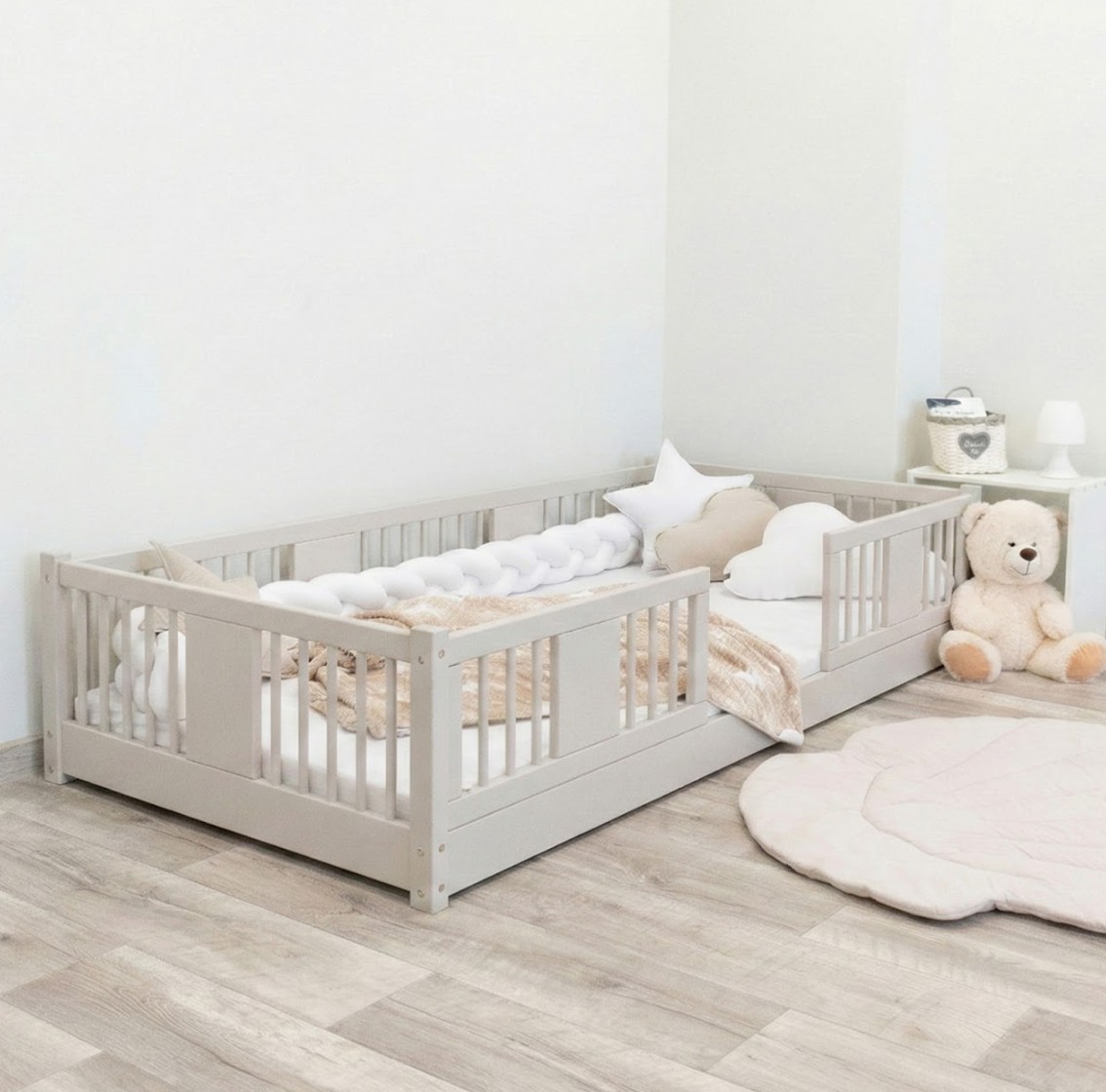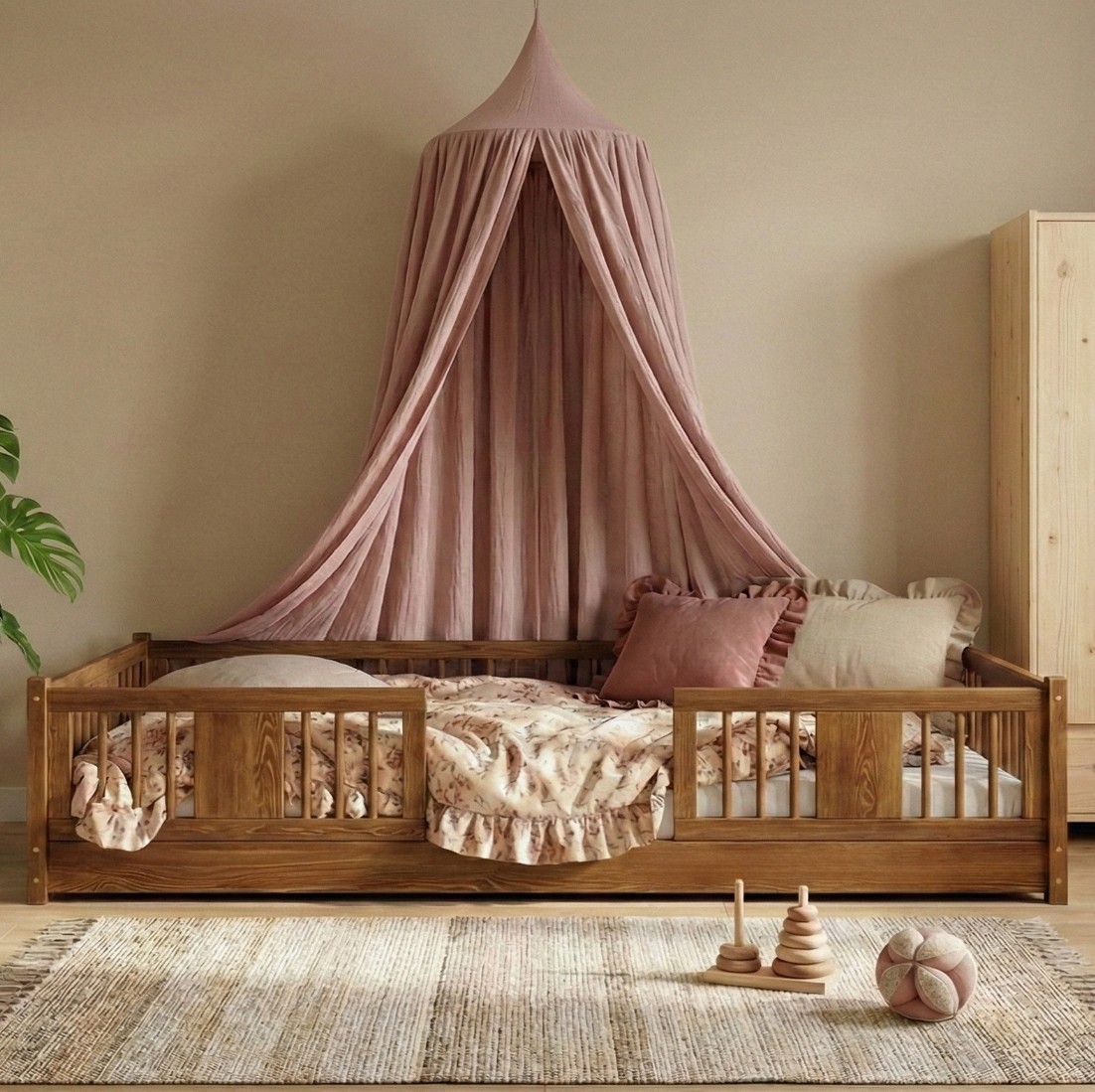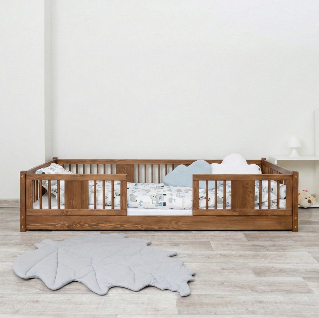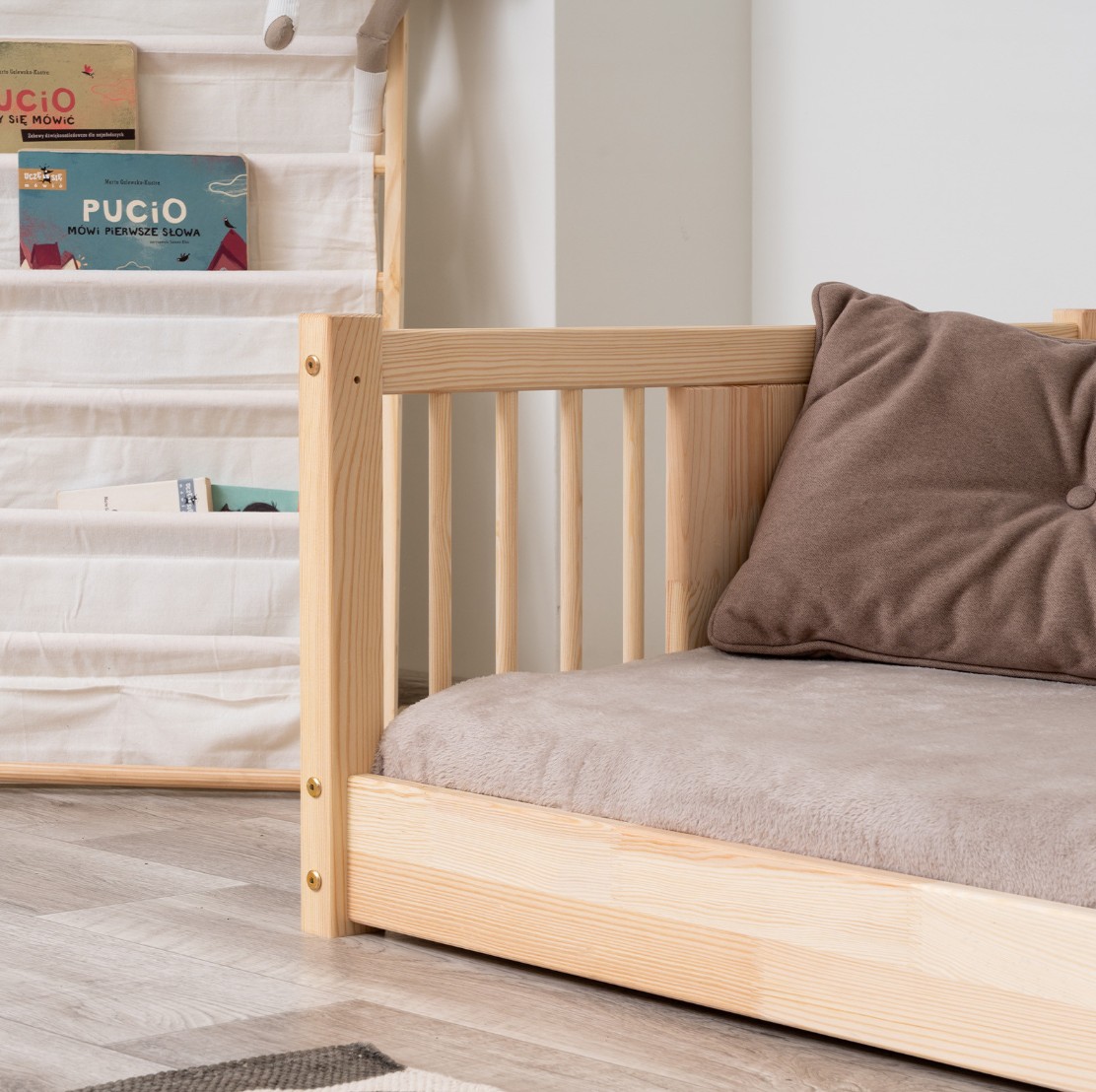 Montessori postel LUNA je unikátní nízká dětská postel s kulatými laťkami, navržená s ohledem na nejmladší uživatele. Díky výšce 0 cm se rám dotýká podlahy, což dětem umožňuje samostatné vstávání a lezení z postele a bezpečně je učí samostatnosti. Princip Montessori klade důraz na volnost dítěte, což tato postel nabízí. Je to perfektní volba pro rodiče, kteří hledají první postel pro své dítě, kombinující estetiku, odolnost a bezpečnost v duchu stylu Montessori. Postel LUNA je vyrobena výhradně z přírodního borovicového dřeva o síle 2,2 cmpocházejícího z certifikovaných zdrojů. Přírodní dřevo nejenže vypadá krásně, ale je také zcela bezpečné – bez toxinů a pachů. Povrch postele je natřen ekologickými barvami na vodní bázi, které splňují přísné evropské bezpečnostní normy EN 71-3. To znamená, že si můžete být jisti, že postel je vhodná i pro nejmenší děti a alergiky. Postel nabízíme také ve verzi bez povrchových úprav - nelakované dřevo. Díky tomu ji lze snadno přizpůsobit - její vzhled můžete upravit mořením, lakováním nebo malováním dle vlastního uvážení. Každý prvek rámu byl precizně vyleštěn a hrany jsou jemně zaoblené, aby bylo zajištěno maximální pohodlí a bezpečnost. Bezpečnostní zábrany u vstupu do postele jsou odnímatelné.