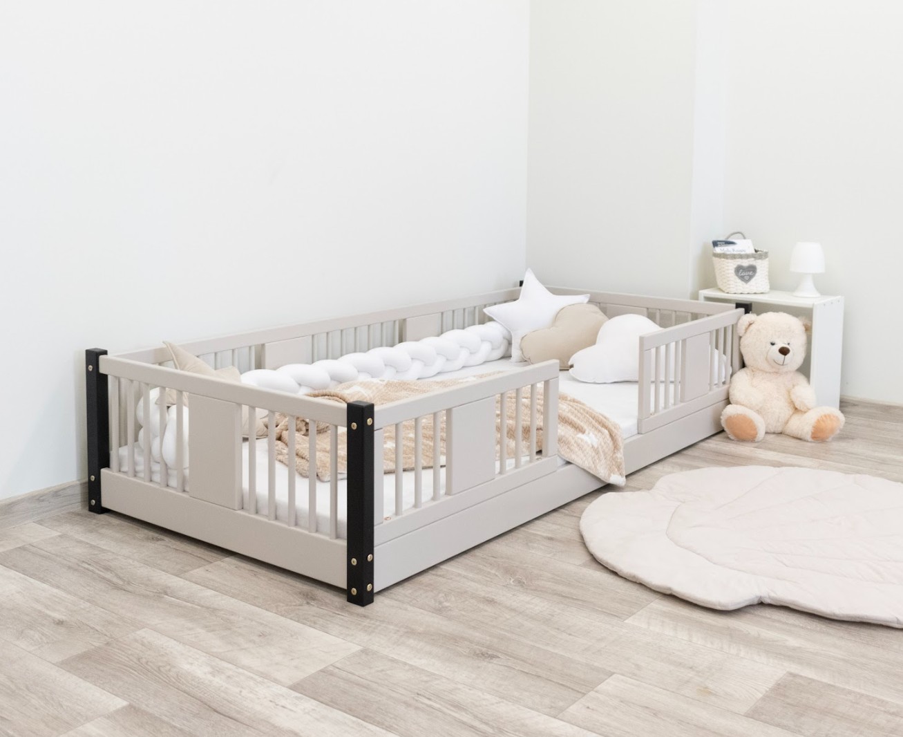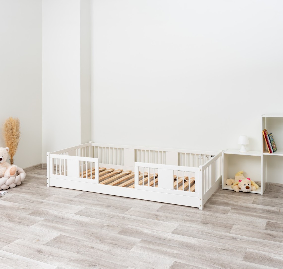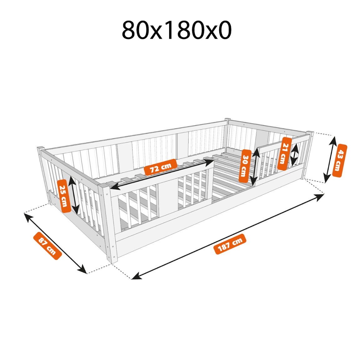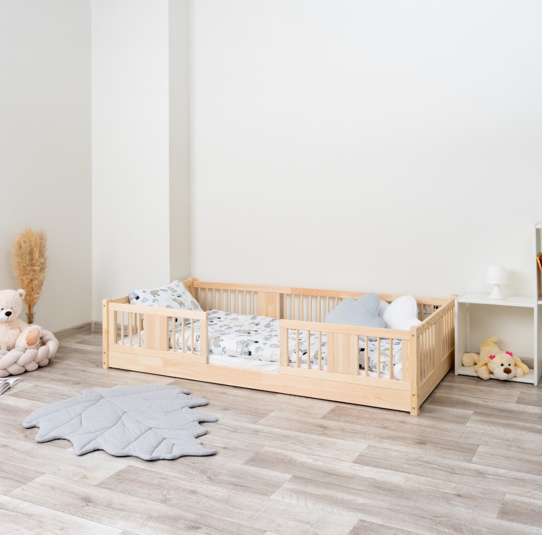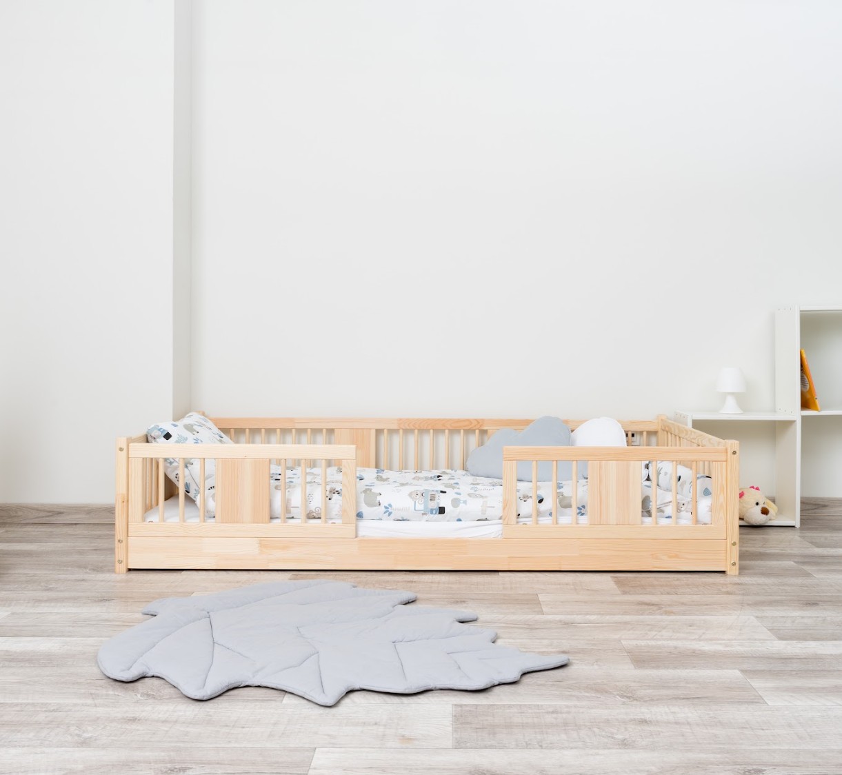 Montessori postel LUNA je unikátní nízká dětská postel s kulatými laťkami, navržená s ohledem na nejmladší uživatele. Díky výšce 0 cm se rám dotýká podlahy, což dětem umožňuje samostatné vstávání a lezení z postele a bezpečně je učí samostatnosti. Princip Montessori klade důraz na volnost dítěte, což tato postel nabízí. Je to perfektní volba pro rodiče, kteří hledají první postel pro své dítě, kombinující estetiku, odolnost a bezpečnost v duchu stylu Montessori. Postel LUNA je vyrobena výhradně z přírodního borovicového dřeva pocházejícího z certifikovaných zdrojů. Přírodní dřevo nejenže vypadá krásně, ale je také zcela bezpečné – bez toxinů a pachů. Povrch postele je natřen ekologickými barvami na vodní bázi, které splňují přísné evropské bezpečnostní normy EN 71-3. To znamená, že si můžete být jisti, že postel je vhodná i pro nejmenší děti a alergiky. Postel nabízíme také ve verzi bez povrchových úprav - nelakované dřevo. Díky tomu ji lze snadno přizpůsobit - její vzhled můžete upravit mořením, lakováním nebo malováním dle vlastního uvážení. Každý prvek rámu byl precizně vyleštěn a hrany jsou jemně zaoblené, aby bylo zajištěno maximální pohodlí a bezpečnost. Bezpečnostní zábrany u vstupu do postele jsou odnímatelné.