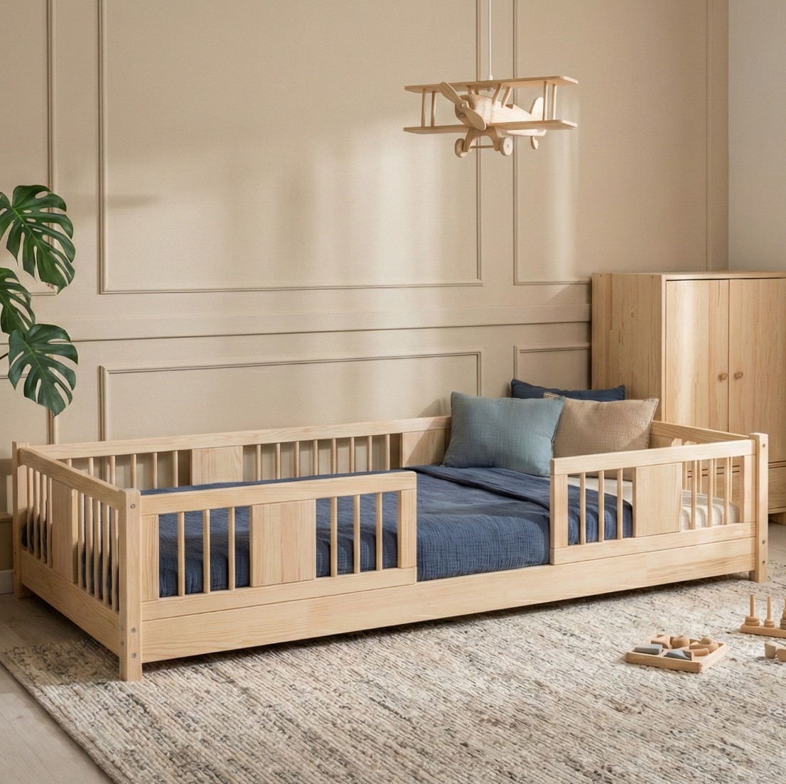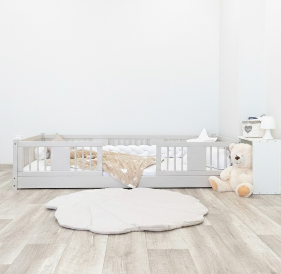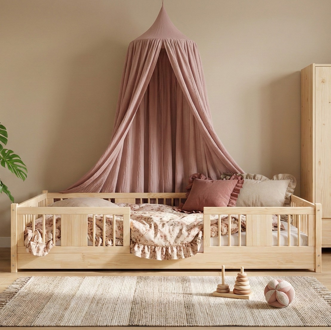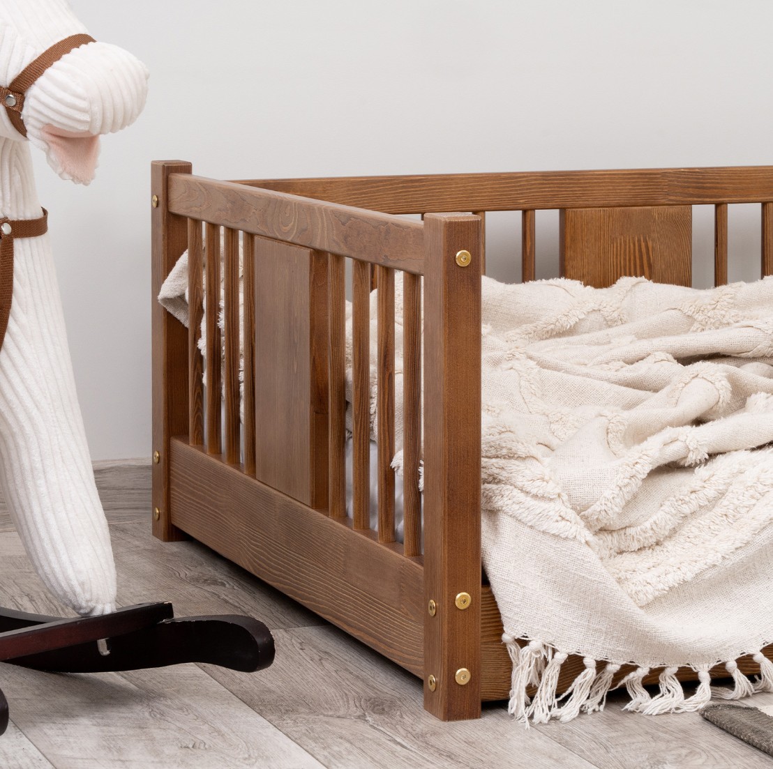 Montessori postel LUNA je unikátní nízká dětská postel s kulatými laťkami, navržená s ohledem na nejmladší uživatele. Díky výšce 0 cm se rám dotýká podlahy, což dětem umožňuje samostatné vstávání a lezení z postele a bezpečně je učí samostatnosti. Princip Montessori klade důraz na volnost dítěte, což tato postel nabízí. Je to perfektní volba pro rodiče, kteří hledají první postel pro své dítě, kombinující estetiku, odolnost a bezpečnost v duchu stylu Montessori. Postel LUNA je vyrobena výhradně z přírodního borovicového dřeva o síle 2,2 cm pocházejícího z certifikovaných zdrojů. Přírodní dřevo nejenže vypadá krásně, ale je také zcela bezpečné – bez toxinů a pachů. Povrch postele je natřen ekologickými barvami na vodní bázi, které splňují přísné evropské bezpečnostní normy EN 71-3. To znamená, že si můžete být jisti, že postel je vhodná i pro nejmenší děti a alergiky. Postel nabízíme také ve verzi bez povrchových úprav - nelakované dřevo. Díky tomu ji lze snadno přizpůsobit - její vzhled můžete upravit mořením, lakováním nebo malováním dle vlastního uvážení. Každý prvek rámu byl precizně vyleštěn a hrany jsou jemně zaoblené, aby bylo zajištěno maximální pohodlí a bezpečnost. Bezpečnostní zábrany u vstupu do postele jsou odnímatelné.