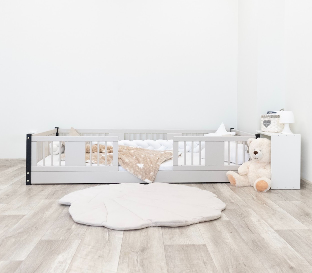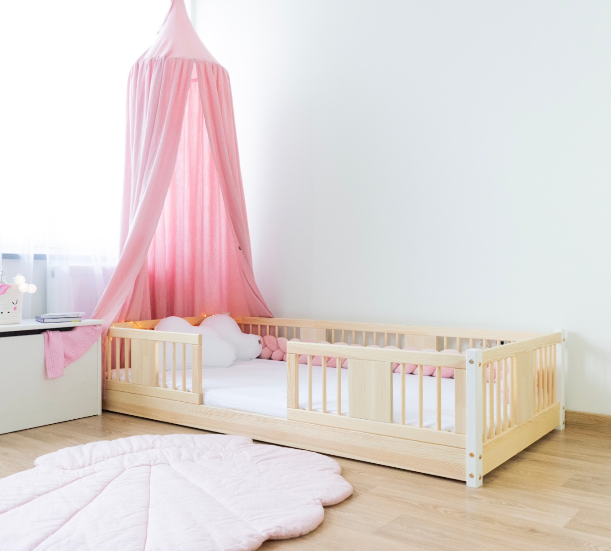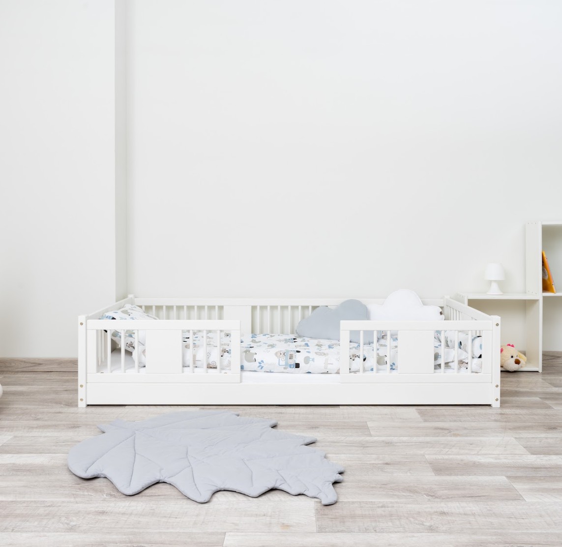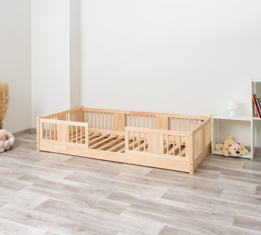 Montessori postel LUNA je unikátní nízká dětská postel s kulatými laťkami, navržená s ohledem na nejmladší uživatele. Díky výšce 0 cm se rám dotýká podlahy, což dětem umožňuje samostatné vstávání a lezení z postele a bezpečně je učí samostatnosti. Princip Montessori klade důraz na volnost dítěte, což tato postel nabízí. Je to perfektní volba pro rodiče, kteří hledají první postel pro své dítě, kombinující estetiku, odolnost a bezpečnost v duchu stylu Montessori. Postel LUNA je vyrobena výhradně z přírodního borovicového dřeva pocházejícího z certifikovaných zdrojů. Přírodní dřevo nejenže vypadá krásně, ale je také zcela bezpečné – bez toxinů a pachů. Povrch postele je natřen ekologickými barvami na vodní bázi, které splňují přísné evropské bezpečnostní normy EN 71-3. To znamená, že si můžete být jisti, že postel je vhodná i pro nejmenší děti a alergiky. Postel nabízíme také ve verzi bez povrchových úprav - nelakované dřevo. Díky tomu ji lze snadno přizpůsobit - její vzhled můžete upravit mořením, lakováním nebo malováním dle vlastního uvážení. Každý prvek rámu byl precizně vyleštěn a hrany jsou jemně zaoblené, aby bylo zajištěno maximální pohodlí a bezpečnost. Bezpečnostní zábrany u vstupu do postele jsou odnímatelné.