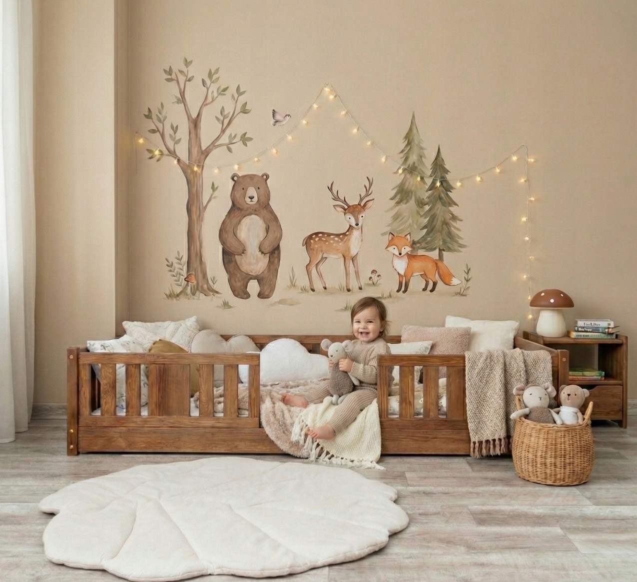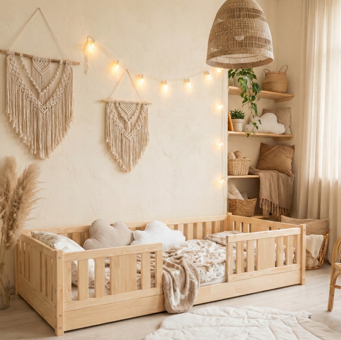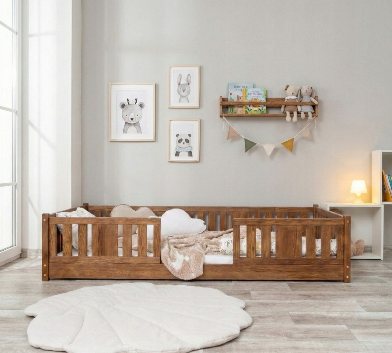 Montessori postel NIKO je unikátní nízká dětská postel se svislými lamelami, navržená s ohledem na nejmladší uživatele. Díky výjimečně nízkému designu – s nohou vysokou 0 cm – je matrace blízko podlahy. To umožňuje vašemu dítěti snadno vstávat z postele bez pomoci dospělé osoby a učit se samostatnosti a soběstačnosti od prvních dnů spánku ve vlastním pokoji. Princip Montessori klade důraz na volnost dítěte, což tato postel nabízí. Tento kus nábytku kombinuje skandinávskou jednoduchost, přírodní materiály a bezpečnost – tři vlastnosti, které ocení každý rodič. Postel NIKO je vyrobena výhradně z přírodního borovicového dřeva o síle 2,2 cm pocházejícího z certifikovaných zdrojů. Přírodní dřevo nejenže vypadá krásně, ale je také zcela bezpečné – bez toxinů a pachů. Povrch postele je natřen ekologickými barvami na vodní bázi, které splňují přísné evropské bezpečnostní normy EN 71-3. To znamená, že si můžete být jisti, že postel je vhodná i pro nejmenší děti a alergiky. Postel nabízíme také ve verzi bez povrchových úprav - nelakované dřevo. Díky tomu ji lze snadno přizpůsobit - její vzhled můžete upravit mořením, lakováním nebo malováním dle vlastního uvážení. Každý prvek rámu byl precizně vyleštěn a hrany jsou jemně zaoblené, aby bylo zajištěno maximální pohodlí a bezpečnost. Bezpečnostní zábrany u vstupu do postele jsou odnímatelné.