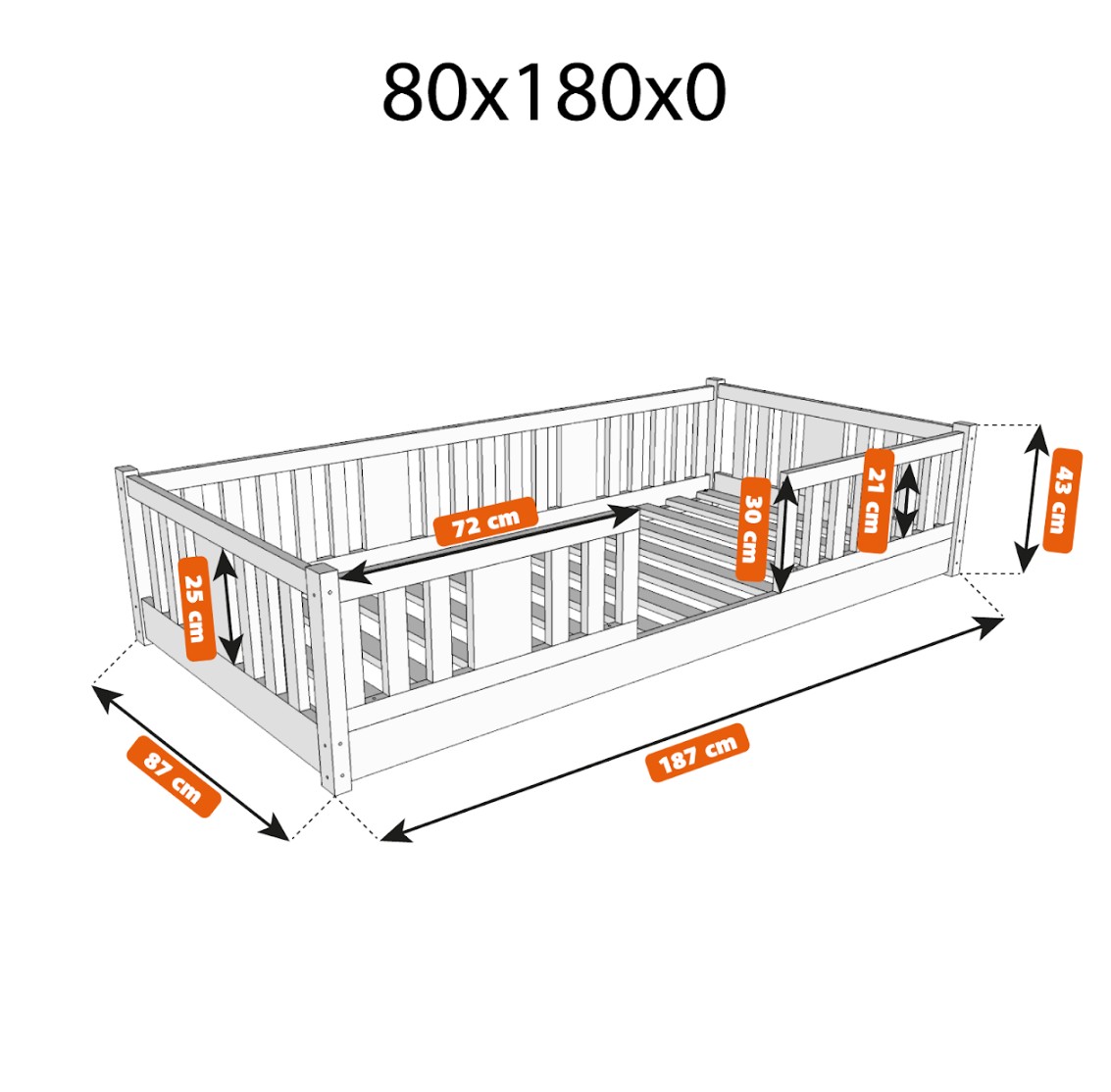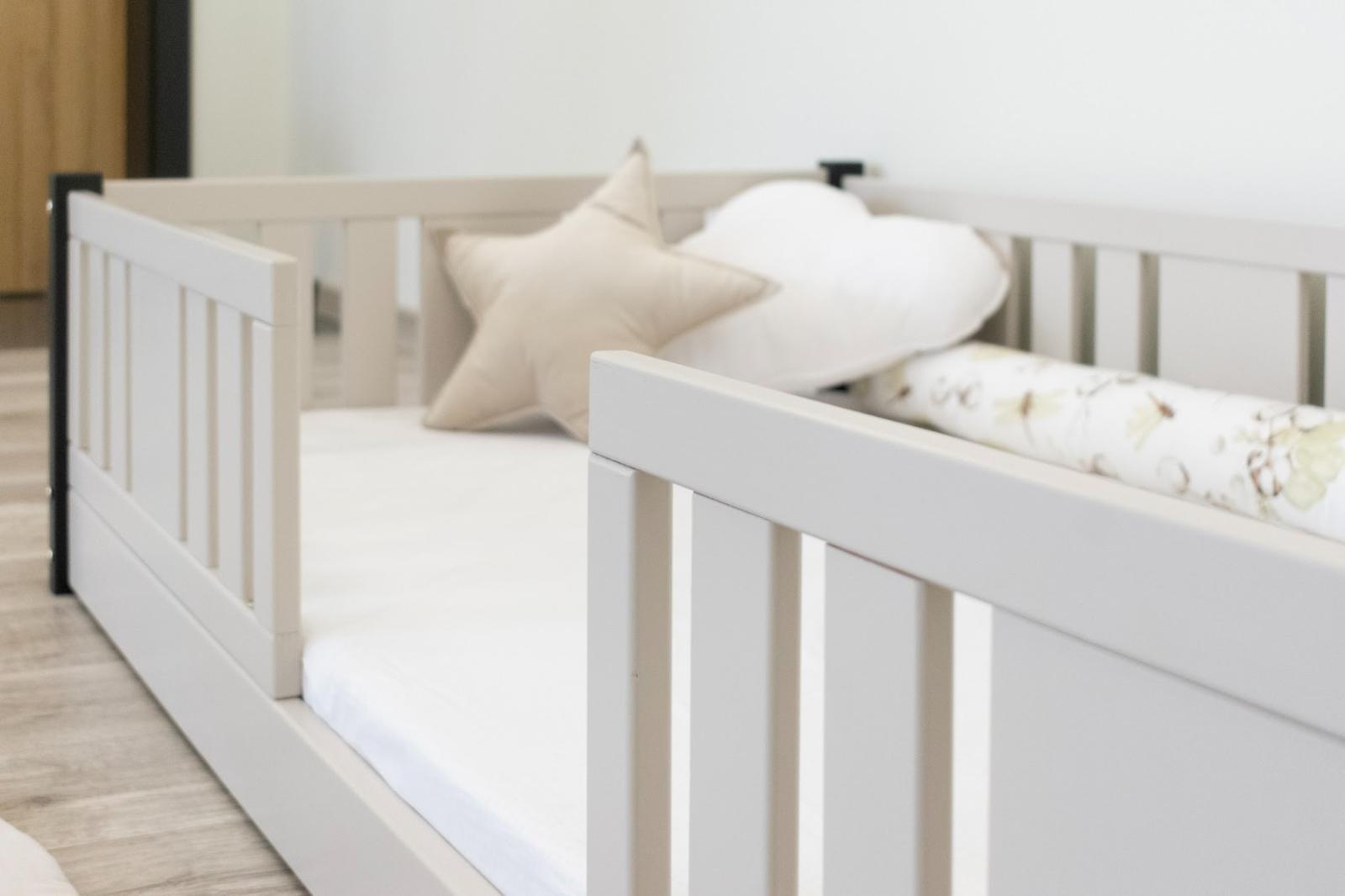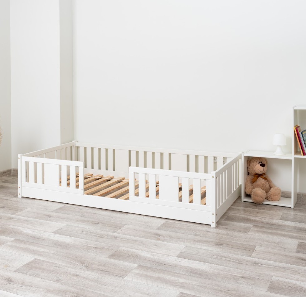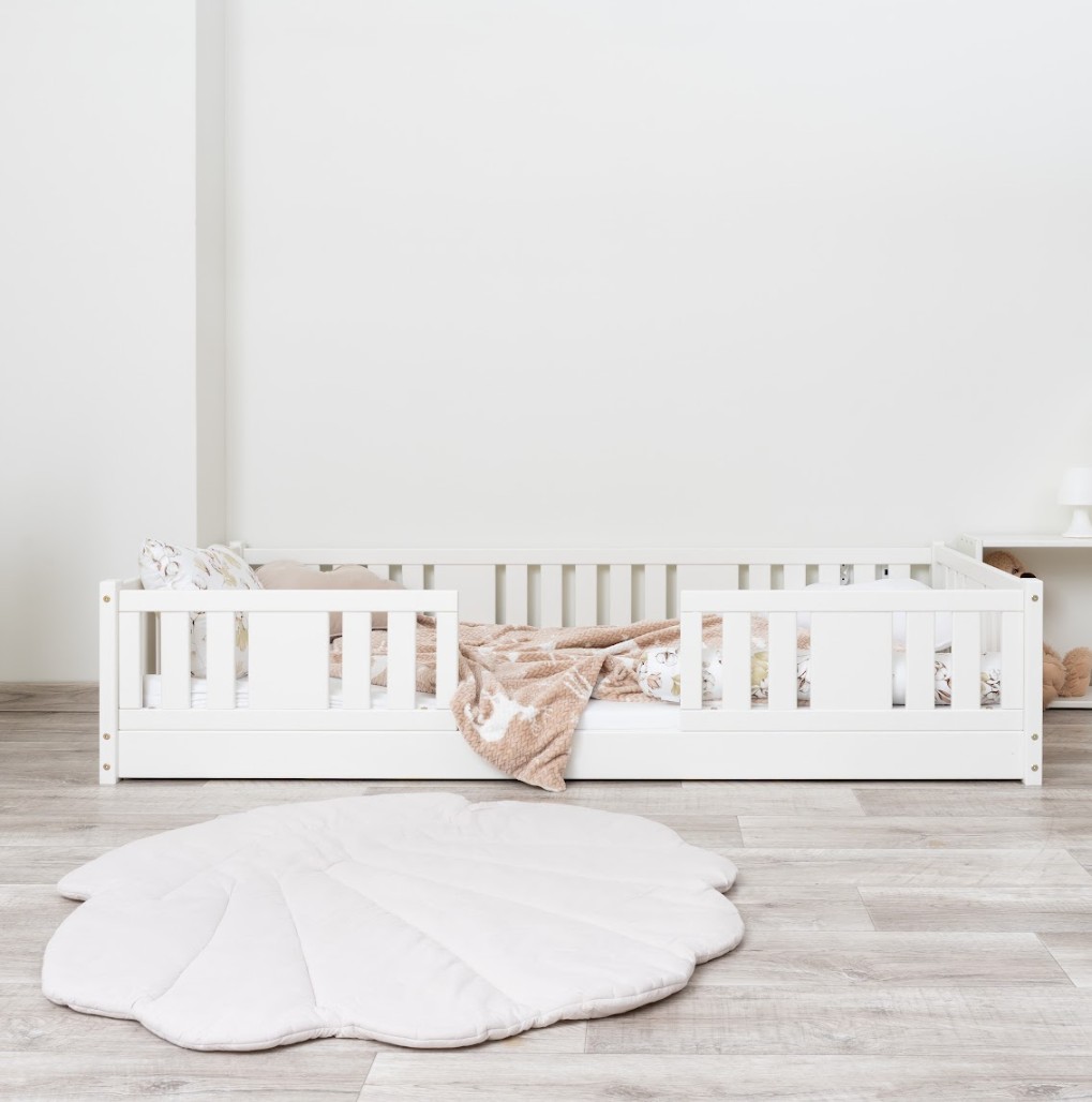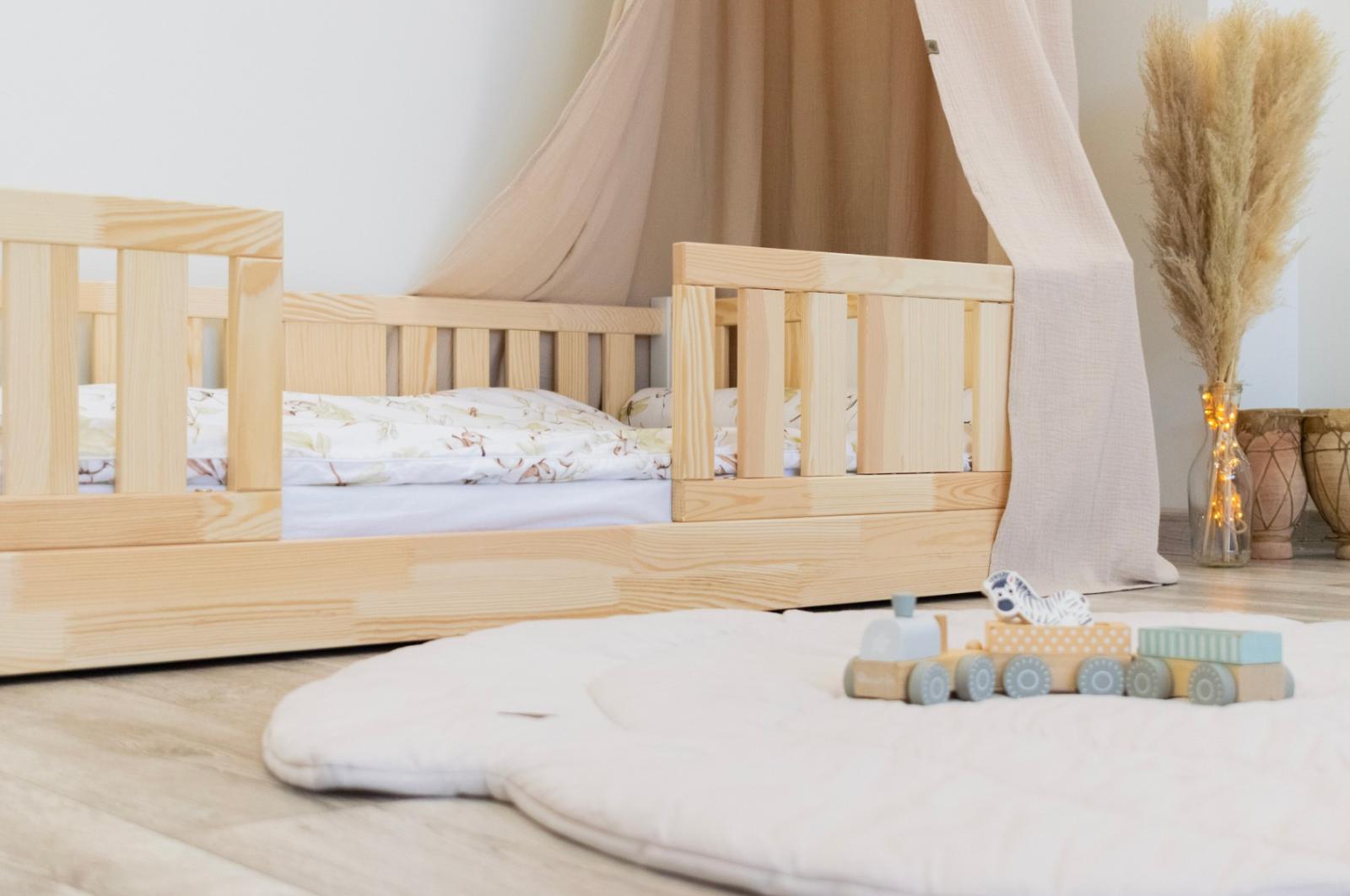 Montessori postel NIKO je unikátní nízká dětská postel se svislými lamelami, navržená s ohledem na nejmladší uživatele. Díky výjimečně nízkému designu – s nohou vysokou 0 cm – je matrace blízko podlahy. To umožňuje vašemu dítěti snadno vstávat z postele bez pomoci dospělé osoby a učit se samostatnosti a soběstačnosti od prvních dnů spánku ve vlastním pokoji. Princip Montessori klade důraz na volnost dítěte, což tato postel nabízí. Tento kus nábytku kombinuje skandinávskou jednoduchost, přírodní materiály a bezpečnost – tři vlastnosti, které ocení každý rodič. Postel NIKO je vyrobena výhradně z přírodního borovicového dřeva pocházejícího z certifikovaných zdrojů. Přírodní dřevo nejenže vypadá krásně, ale je také zcela bezpečné – bez toxinů a pachů. Povrch postele je natřen ekologickými barvami na vodní bázi, které splňují přísné evropské bezpečnostní normy EN 71-3. To znamená, že si můžete být jisti, že postel je vhodná i pro nejmenší děti a alergiky. Postel nabízíme také ve verzi bez povrchových úprav - nelakované dřevo. Díky tomu ji lze snadno přizpůsobit - její vzhled můžete upravit mořením, lakováním nebo malováním dle vlastního uvážení. Každý prvek rámu byl precizně vyleštěn a hrany jsou jemně zaoblené, aby bylo zajištěno maximální pohodlí a bezpečnost. Bezpečnostní zábrany u vstupu do postele jsou odnímatelné.