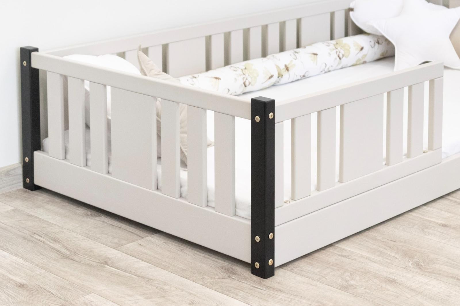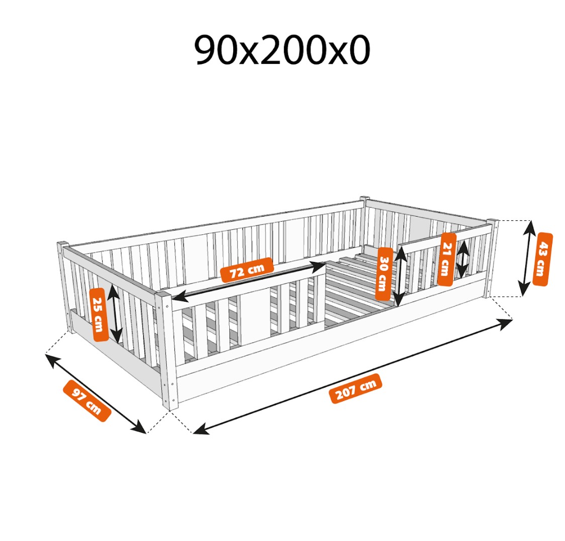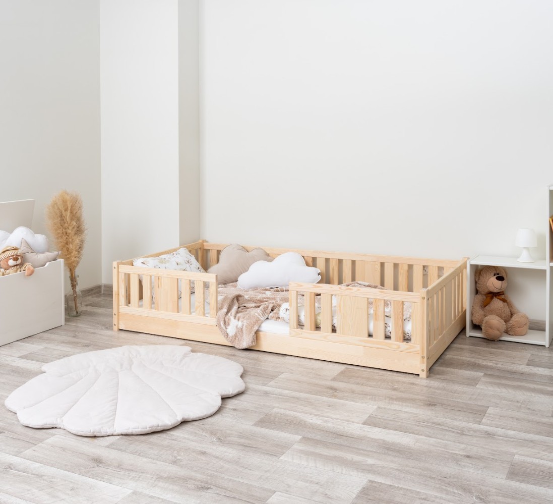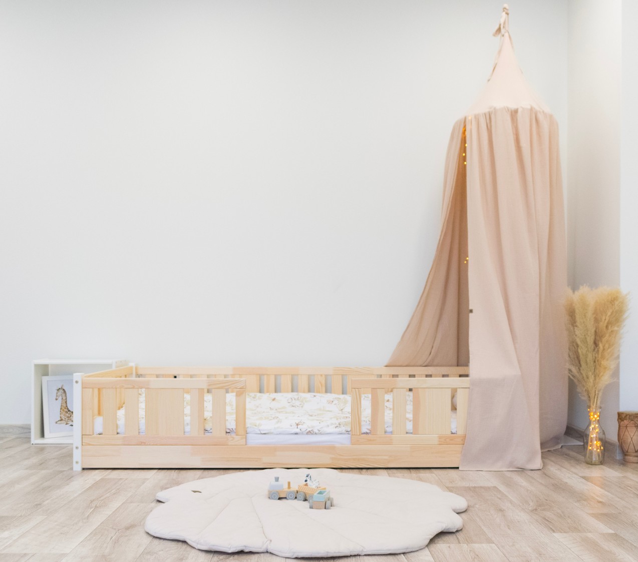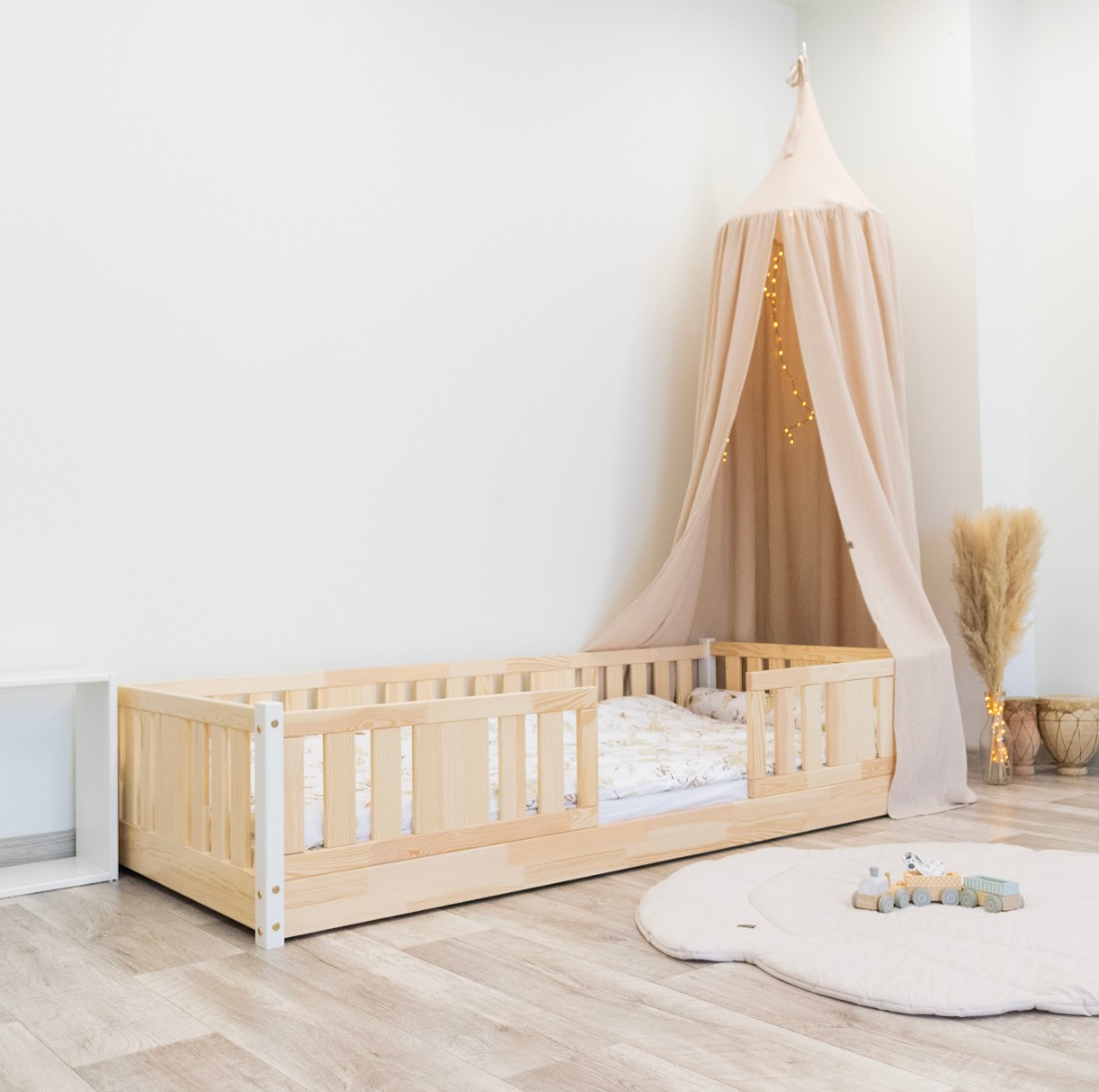 Montessori postel NIKO je unikátní nízká dětská postel se svislými lamelami, navržená s ohledem na nejmladší uživatele. Díky výjimečně nízkému designu – s nohou vysokou 0 cm – je matrace blízko podlahy. To umožňuje vašemu dítěti snadno vstávat z postele bez pomoci dospělé osoby a učit se samostatnosti a soběstačnosti od prvních dnů spánku ve vlastním pokoji. Princip Montessori klade důraz na volnost dítěte, což tato postel nabízí. Tento kus nábytku kombinuje skandinávskou jednoduchost, přírodní materiály a bezpečnost – tři vlastnosti, které ocení každý rodič. Postel NIKO je vyrobena výhradně z přírodního borovicového dřeva pocházejícího z certifikovaných zdrojů. Přírodní dřevo nejenže vypadá krásně, ale je také zcela bezpečné – bez toxinů a pachů. Povrch postele je natřen ekologickými barvami na vodní bázi, které splňují přísné evropské bezpečnostní normy EN 71-3. To znamená, že si můžete být jisti, že postel je vhodná i pro nejmenší děti a alergiky. Postel nabízíme také ve verzi bez povrchových úprav - nelakované dřevo. Díky tomu ji lze snadno přizpůsobit - její vzhled můžete upravit mořením, lakováním nebo malováním dle vlastního uvážení. Každý prvek rámu byl precizně vyleštěn a hrany jsou jemně zaoblené, aby bylo zajištěno maximální pohodlí a bezpečnost. Bezpečnostní zábrany u vstupu do postele jsou odnímatelné.
