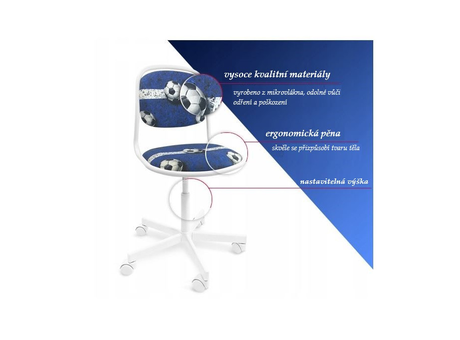 Dětská otočná židle ELF se vyznačuje vysokou kvalitou použitých materiálů a precizním zpracováním. Tato velmi povedená a líbivá otočná židle se výborně hodí k námi nabízeným dětským psacím a PC stolům. Spodní základna židle je vyrobena z kovu. Díky tomu je tato židle velmi odolná a zvládne zatížení až 110 kg. Nastavení výšky sedu umožňuje přizpůsobit židli výšce uživatele. Opěradlo poskytuje potřebnou oporu zad a sedák zaručuje pohodlí i při delším sezení. Komfort u těchto částí otočné židle zajišťuje kvalitní pěna a čalounění z mikrovlákna, které je odolné proti oděru a poškození.