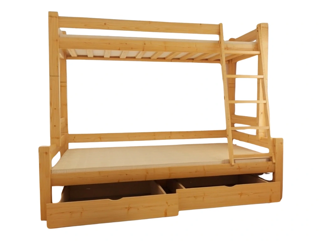 Dětská patrová postel s rozšířeným spodním lůžkem je vyrobena z kvalitního masivu borovice. Výrobek dodáváme v přírodní barvě (ošetřeno bezbarvým ekologickým lakem), mořené v odstínech olše či dubu, v povrchové úpravě bílá, růžová, zelená, modrá nebo šedá barva či v surovém stavu bez povrchové úpravy (vzorník povrchových úprav k výběru naleznete v obrázkové galerii). Šířku rozšířeného spodního lůžka můžete vybírat ze 2 variant: ložná plocha 120 nebo 140 cm.