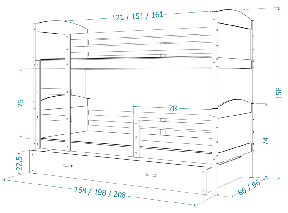 Tato patrová postel je vytvořena tak, aby ušetřila prostor v dětském pokoji. Disponuje dvěma lůžky a šuplíkem na kolečkách, což umožní snadné zasunutí šuplíku pod postel. Konstrukce postele je uzpůsobena tak, aby zabránila pádu dětí a to díky ochranným bariérám. Vaše děti se tak budou cítit v klidu a bezpečí. Patrová postel zaujme svým nadčasovým designem a vytvoří tak komplexní prvek, který se bude vyjímat v dětském pokoji. Součástí postele je také pevný dřevěný žebřík, který lze připevnit na pravou či levou stranu.