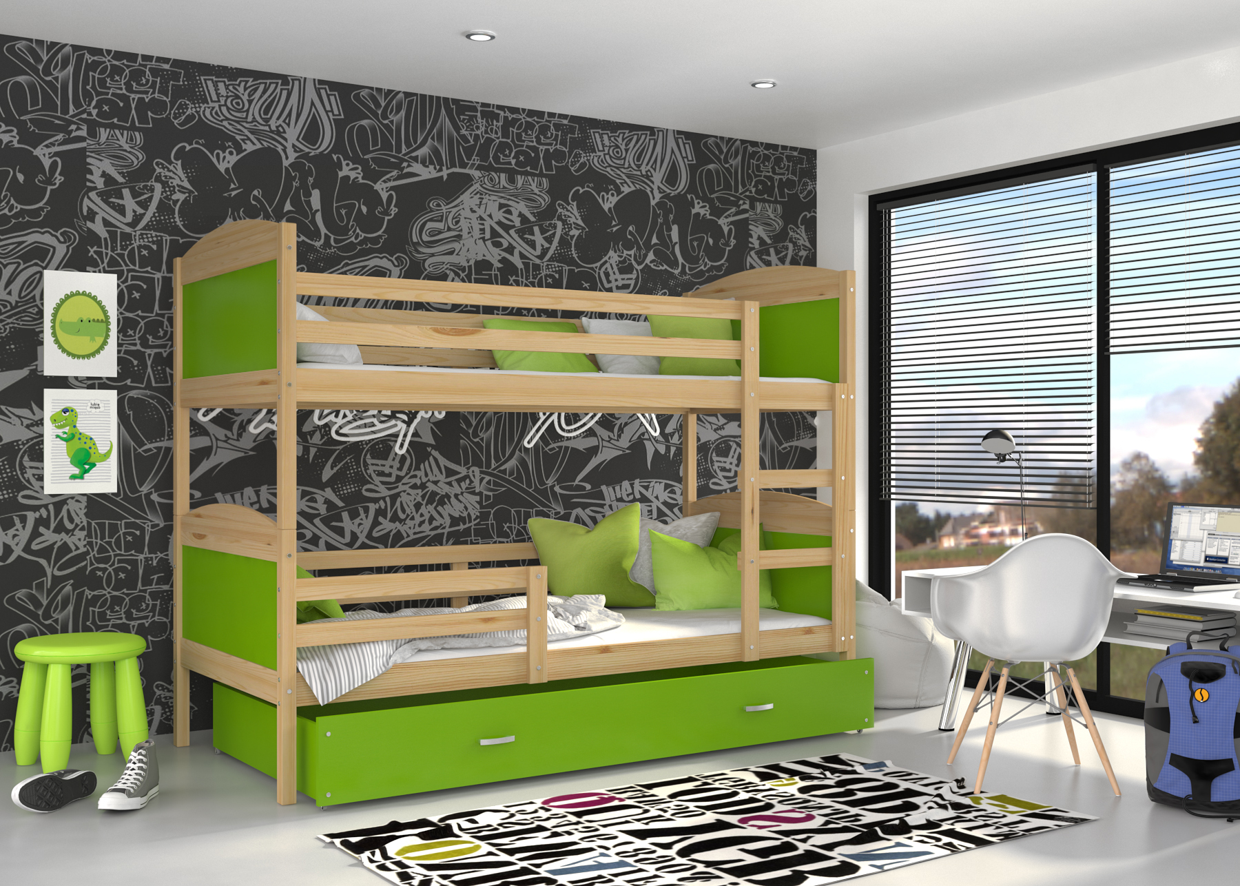 Dětská patrová postel se šuplíkem MATTEO - 200x90 cm - zelená/borovice
