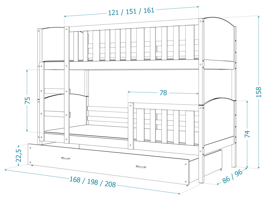 Tato patrová postel je vytvořena tak, aby ušetřila prostor v dětském pokoji. Disponuje dvěma lůžky a šuplíkem na kolečkách, což umožní snadné zasunutí šuplíku pod postel a vaše děti budou mít úložný prostor navíc. Konstrukce postele je uzpůsobena tak, aby zabránila pádu dětí a to díky ochranným bariérám. Vaše děti se tak budou cítit v klidu a bezpečí. Patrová postel zaujme svým nadčasovým vzhledem a vytvoří tak komplexní prvek, který se bude vyjímat v dětském pokoji. Součástí postele je také pevný žebřík, který lze připevnit na pravou či levou stranu.